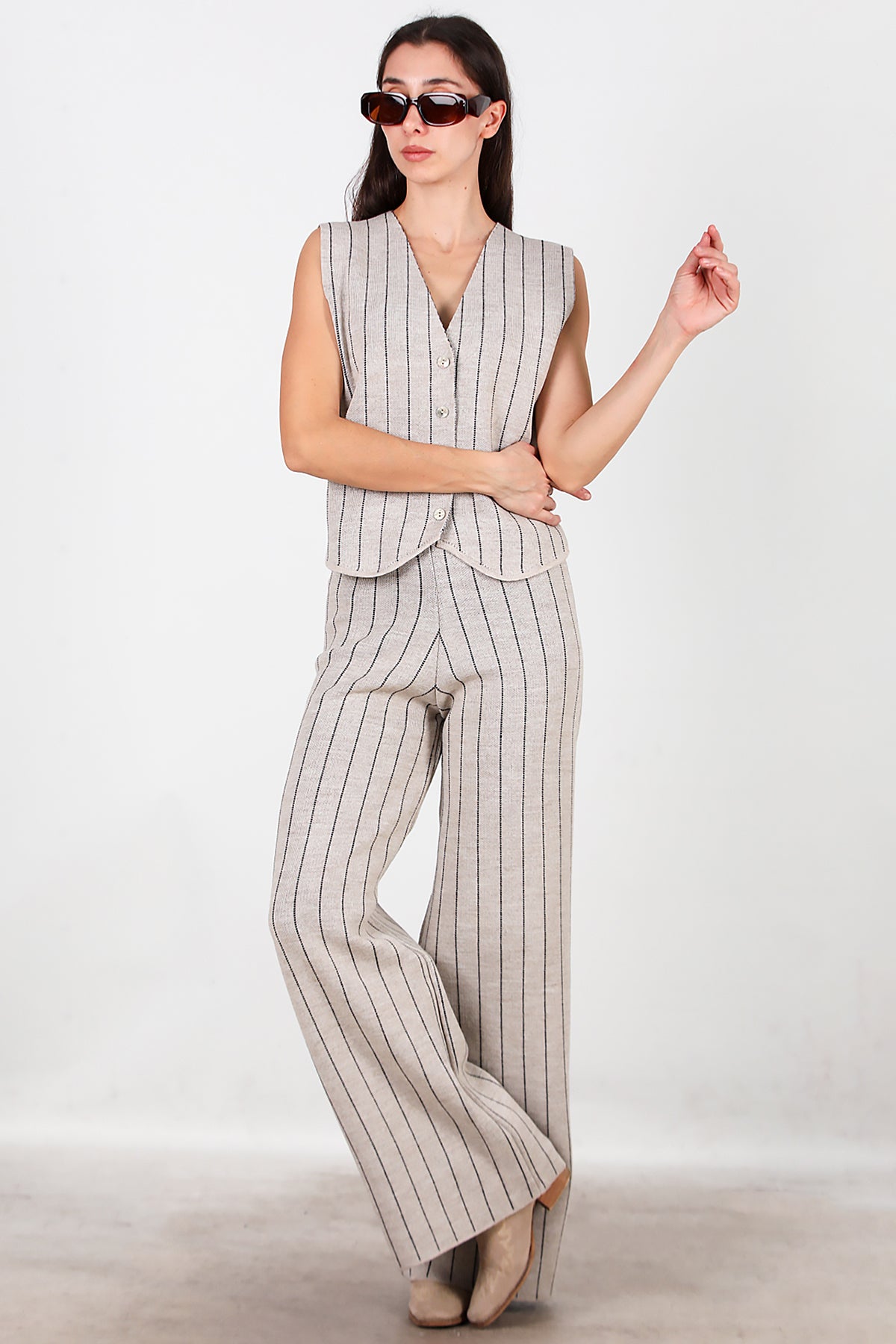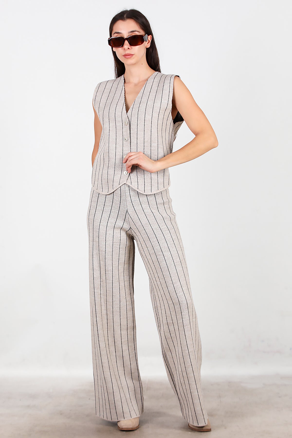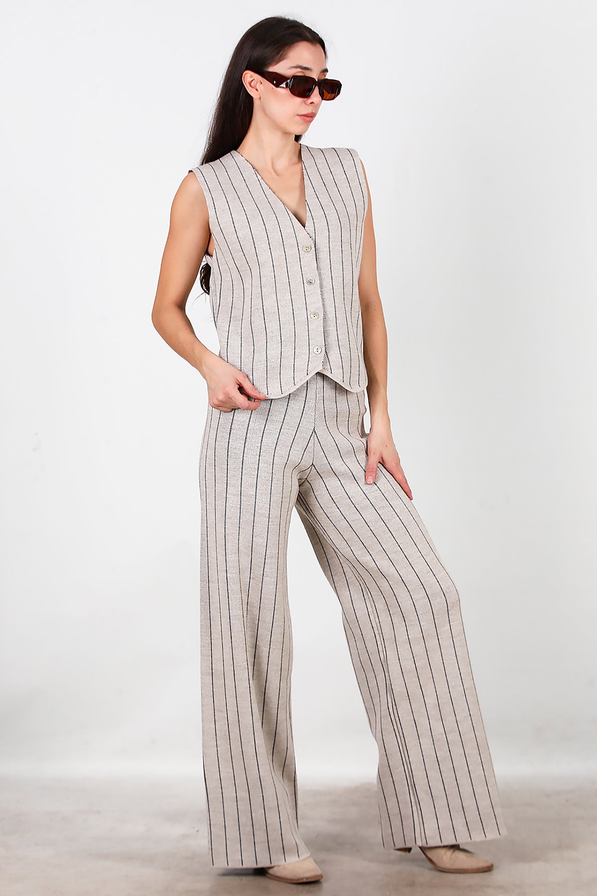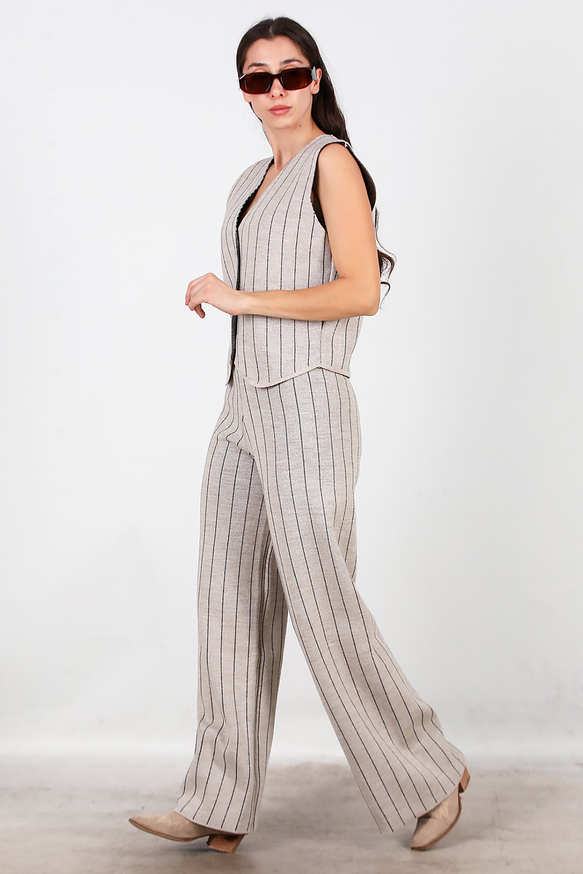 Kadın Çizgili Yelekli Triko Takım Vizon