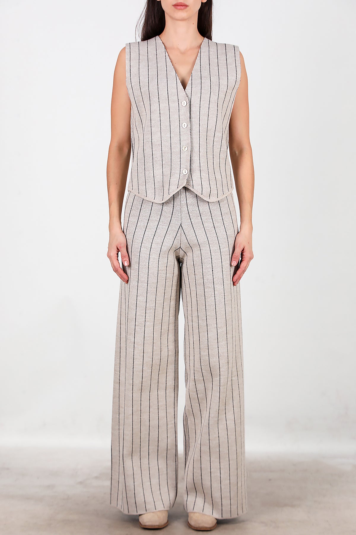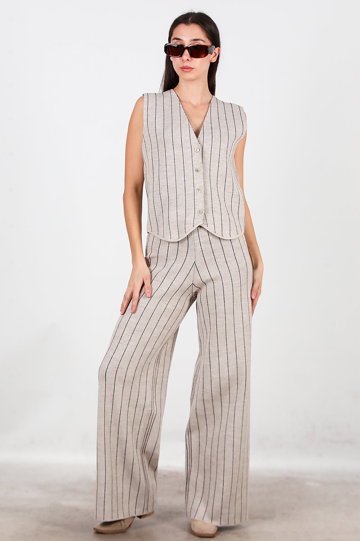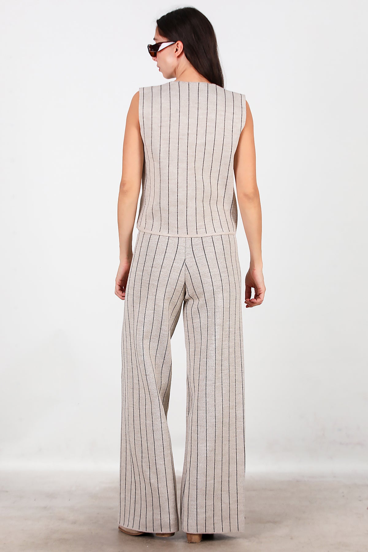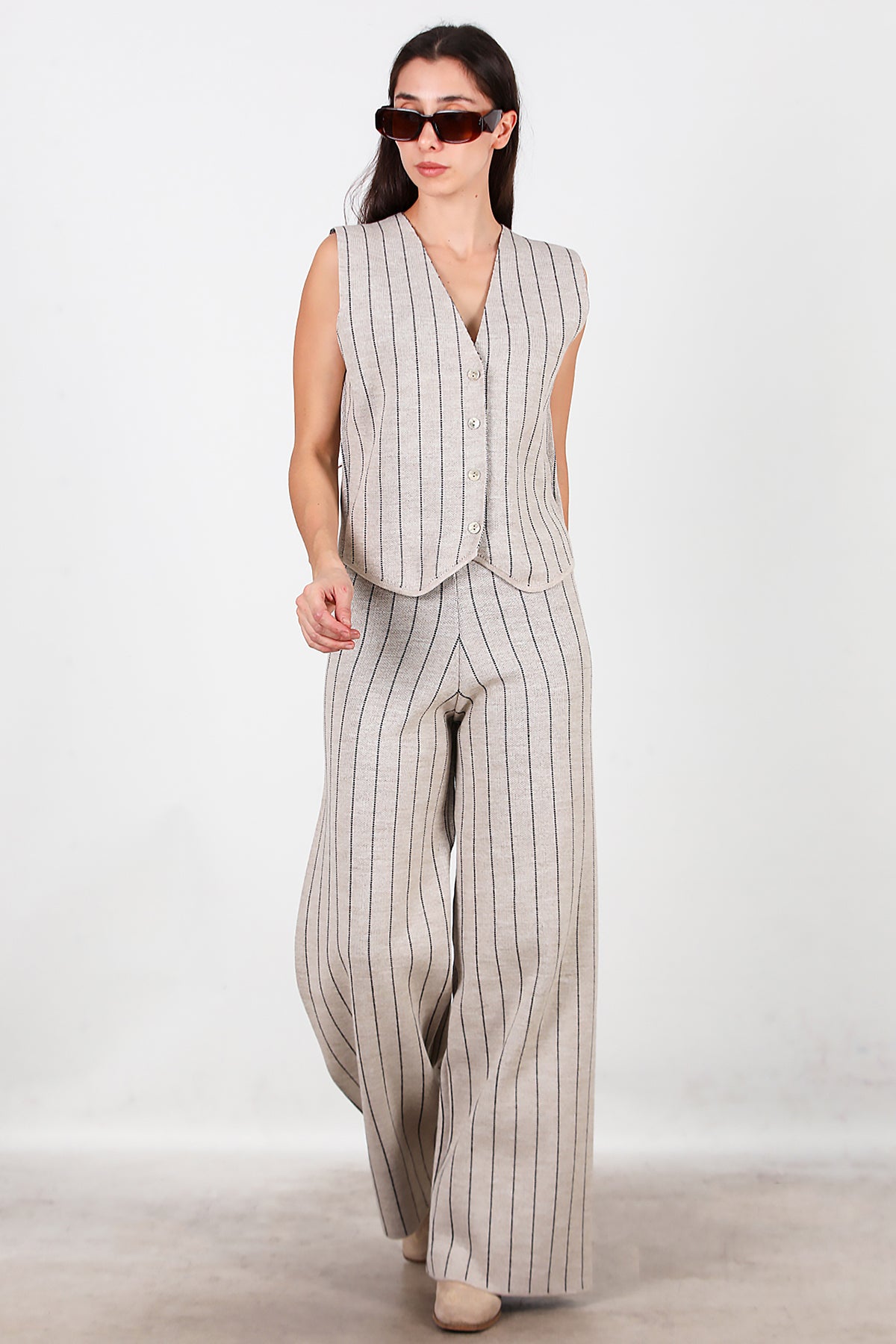Kadın Çizgili Yelekli Triko Takım Vizon