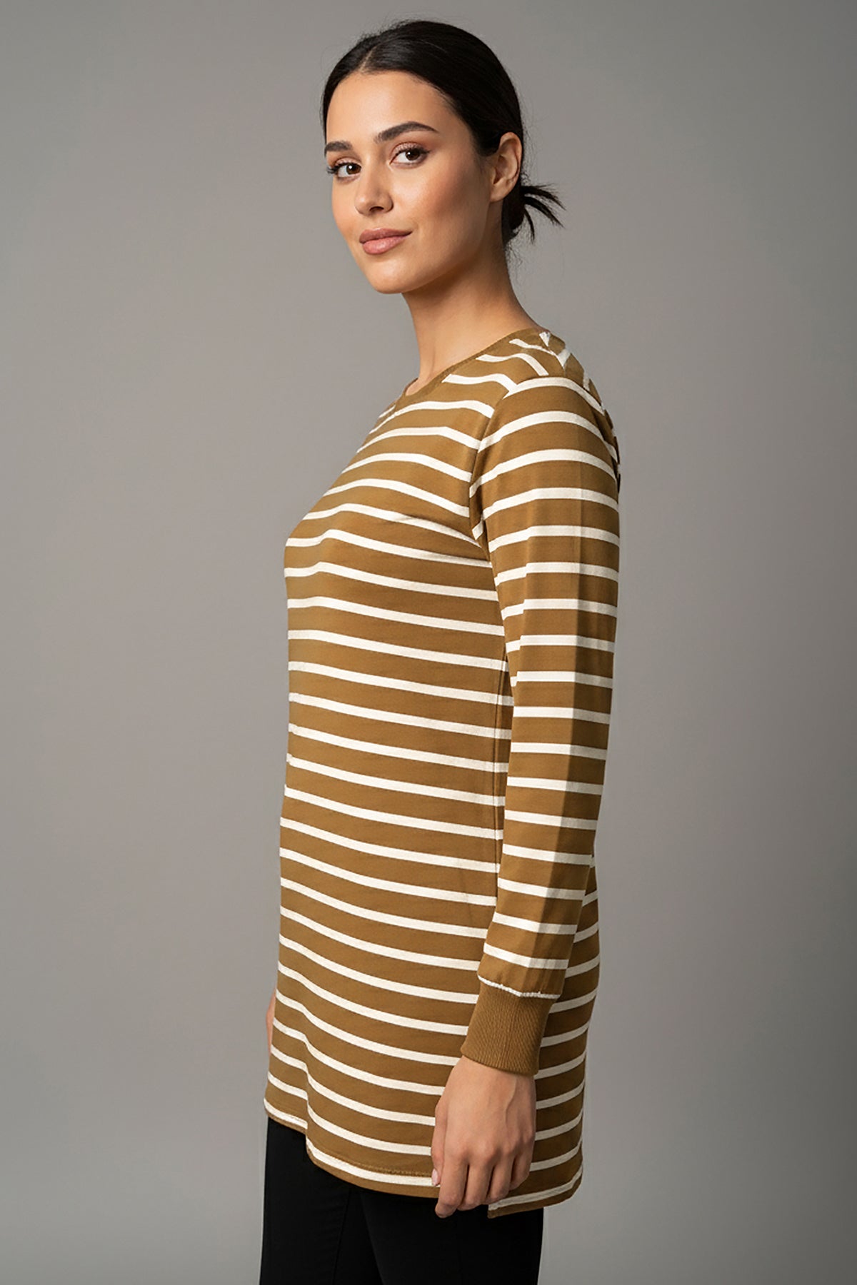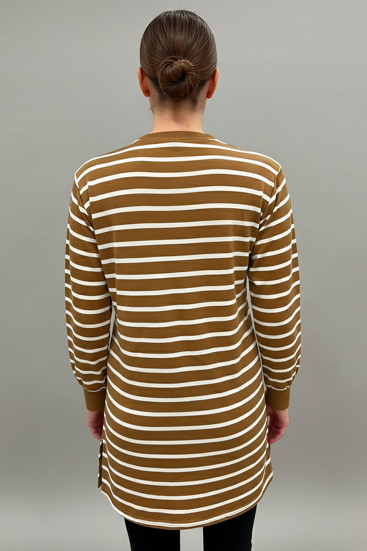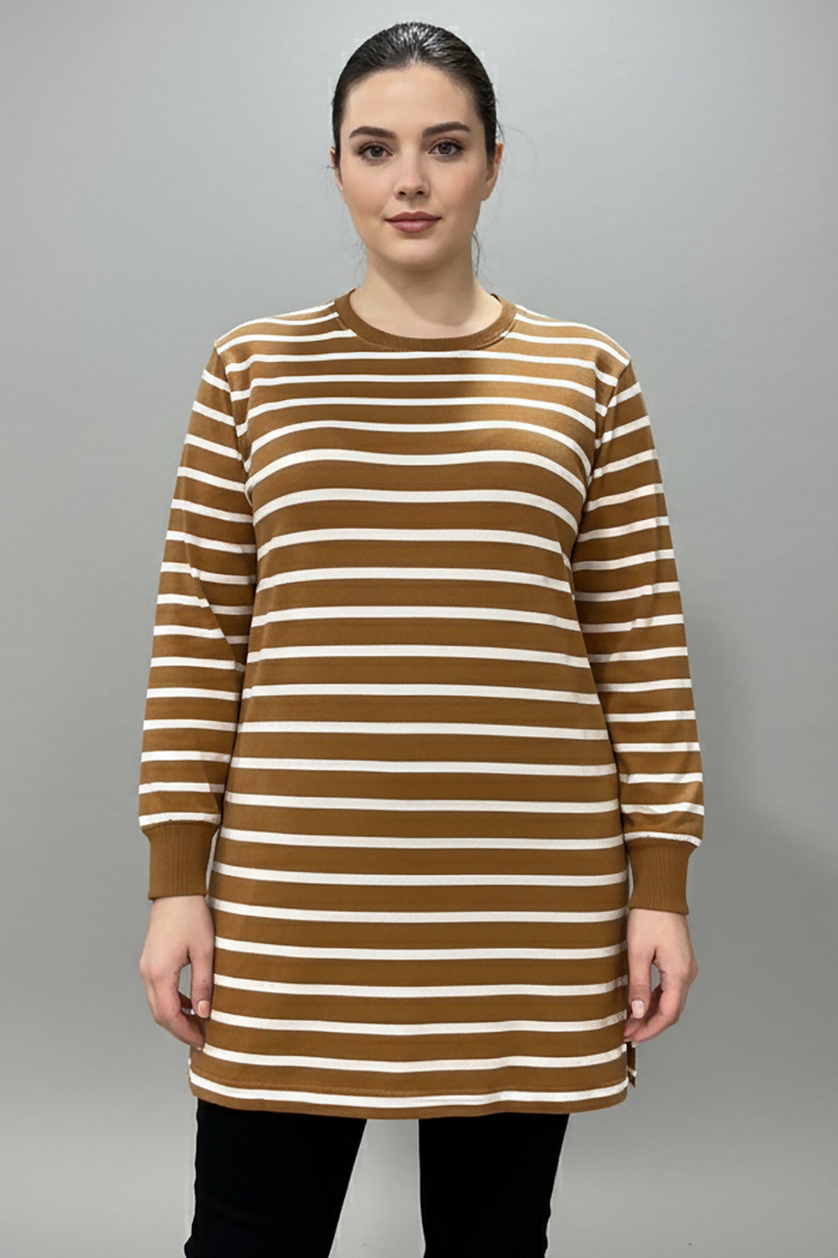 Büyük Beden Yan Yırtmaçlı Bisiklet Yaka Çizgili Tunik Bej