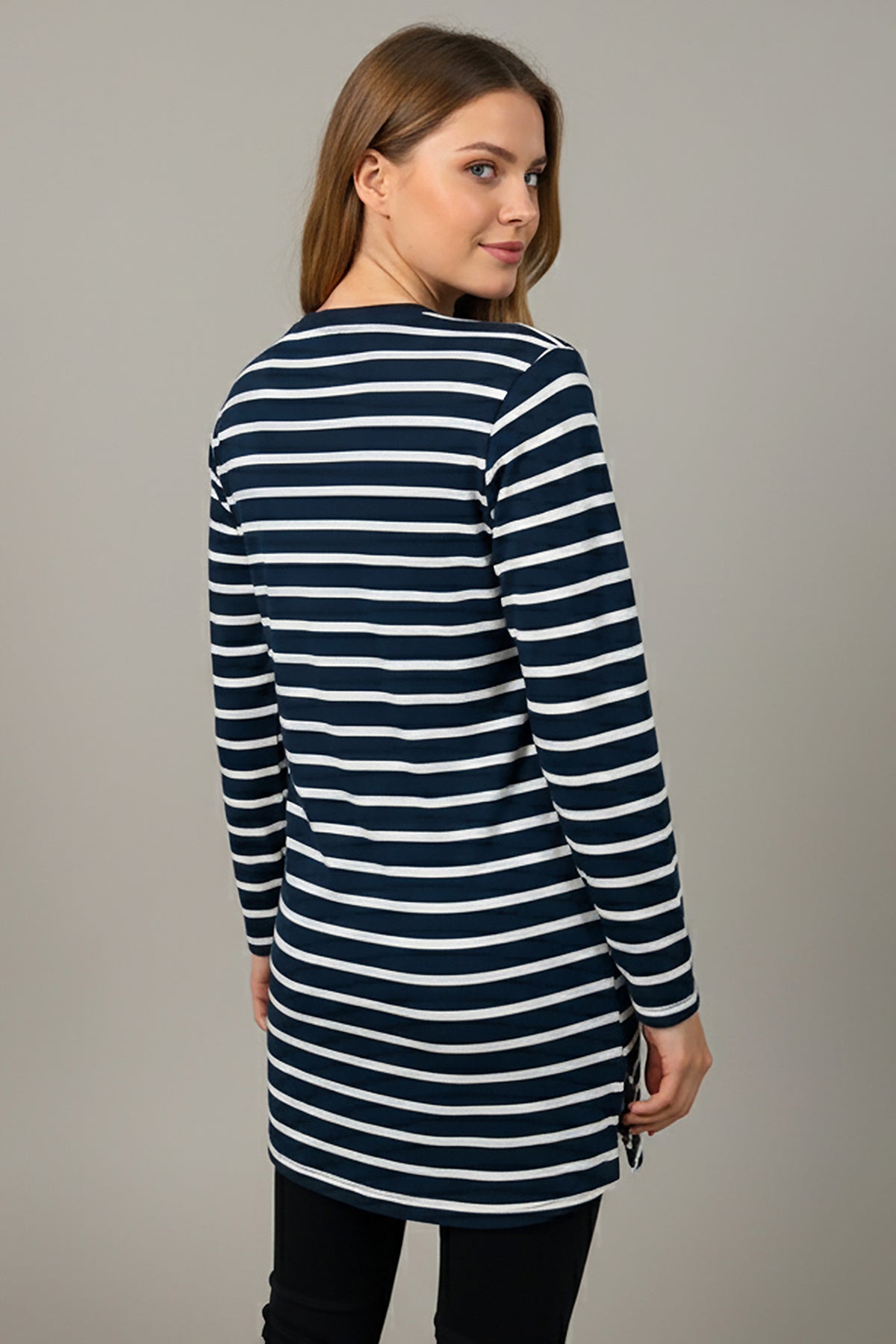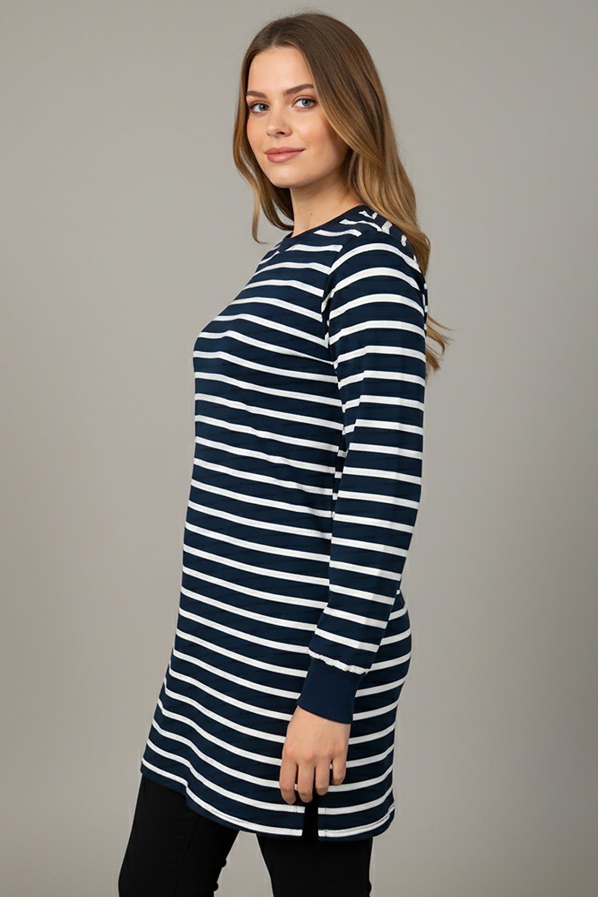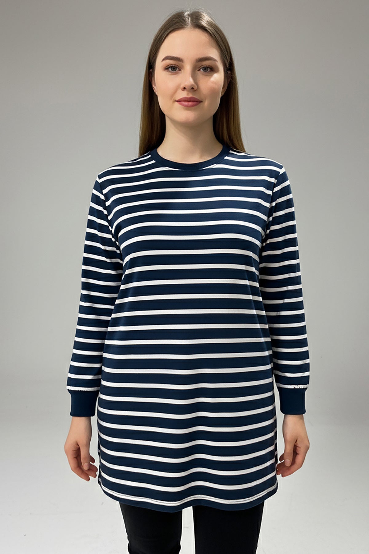 Büyük Beden Yan Yırtmaçlı Bisiklet Yaka Çizgili Tunik Lacivert