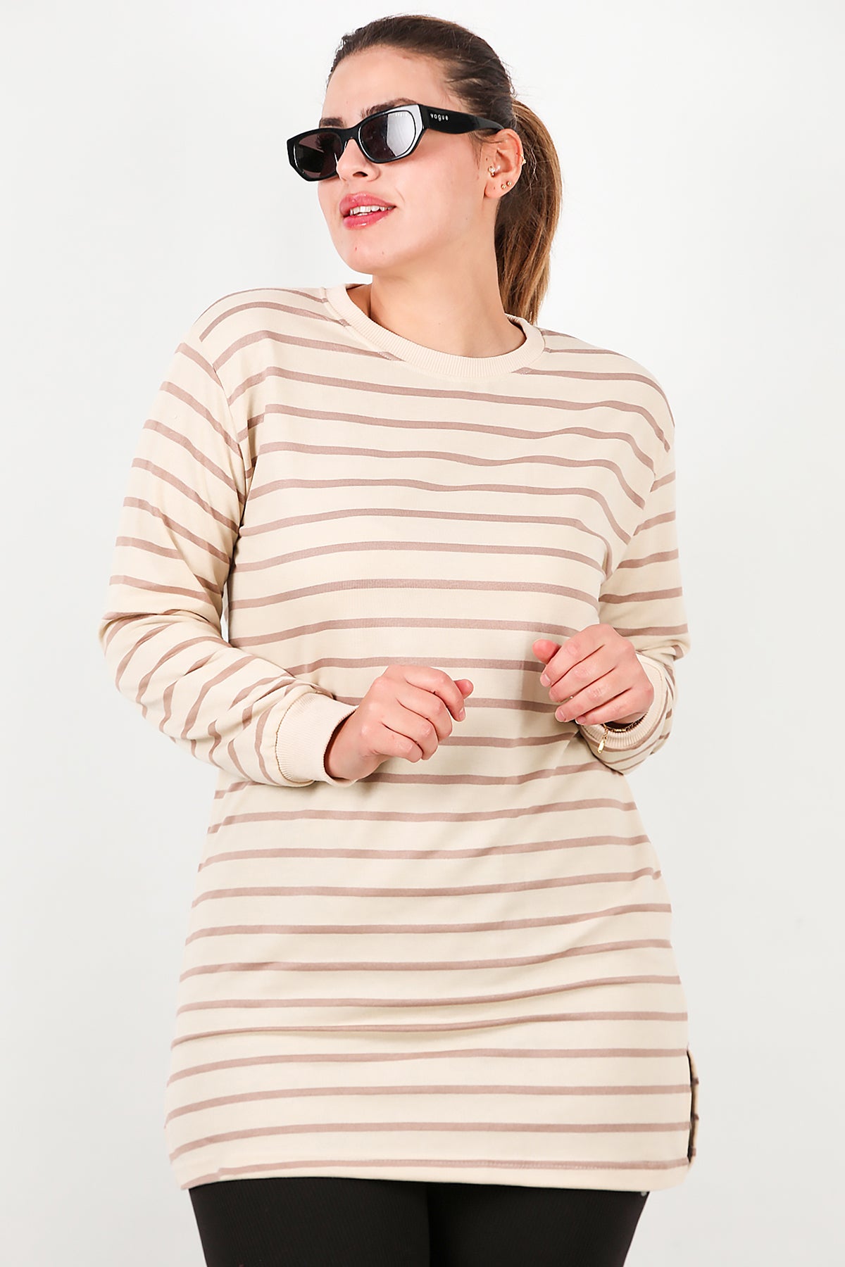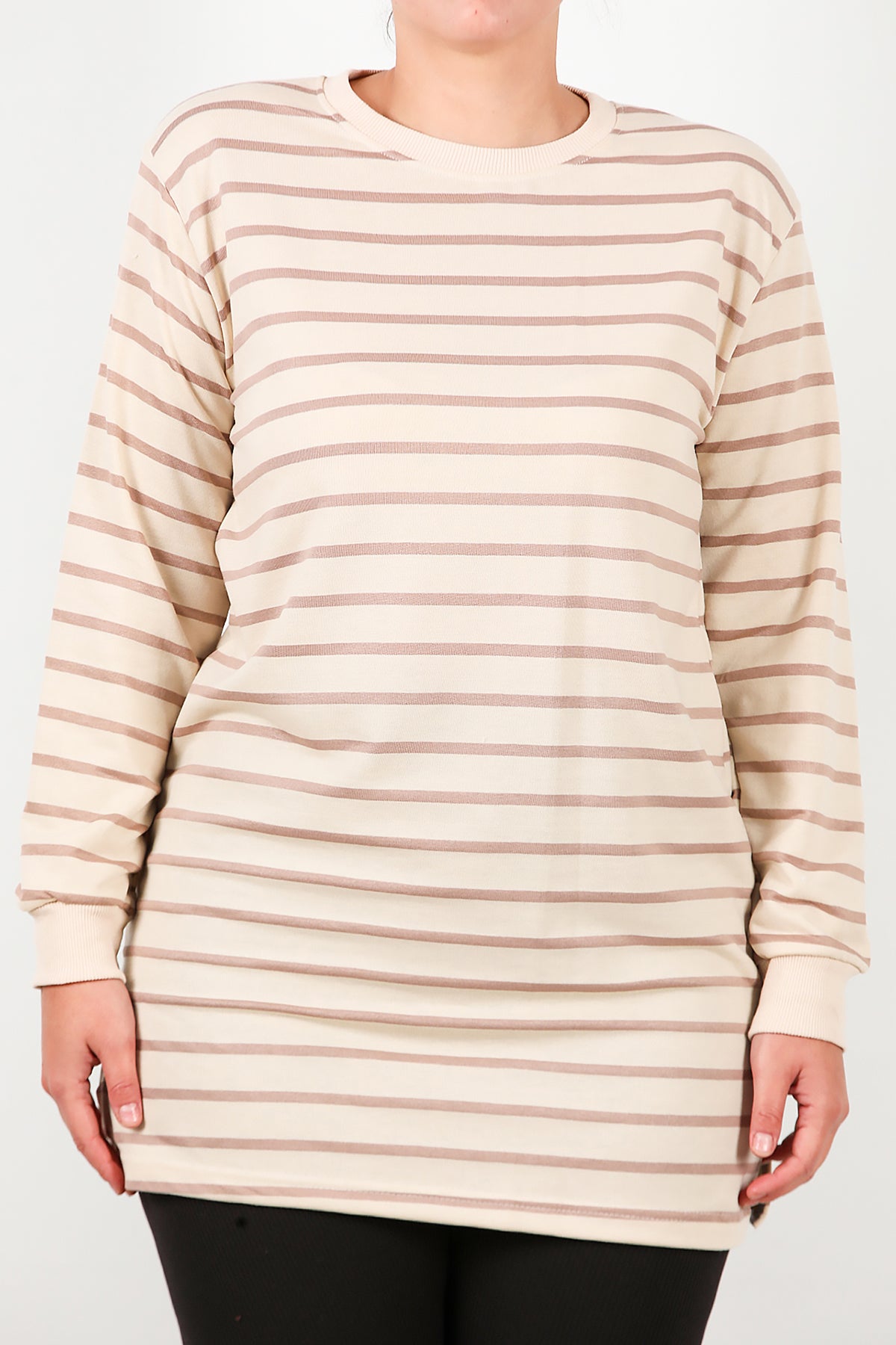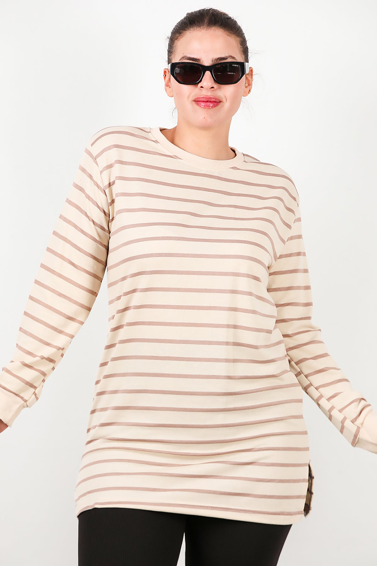 Büyük Beden Yan Yırtmaçlı Bisiklet Yaka Çizgili Tunik Vizon
