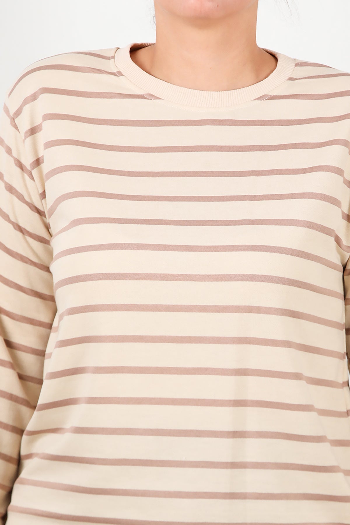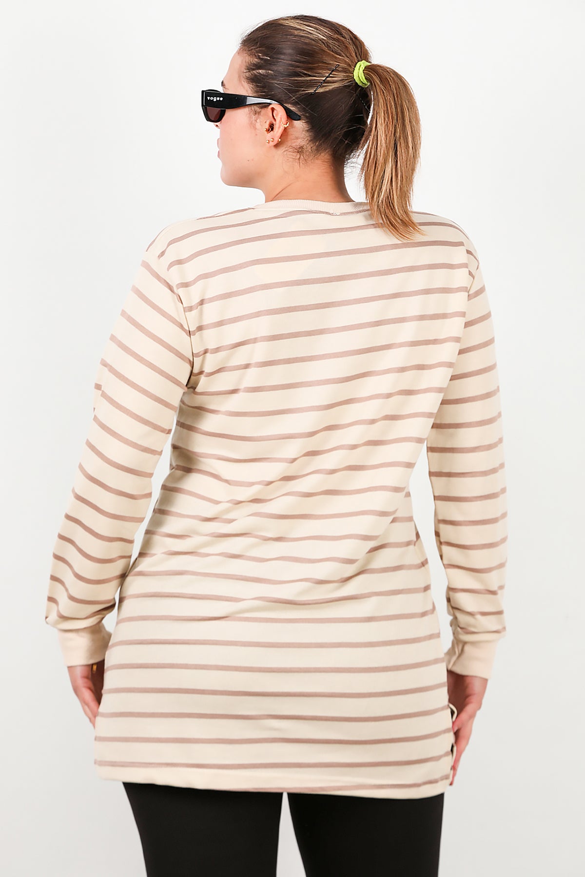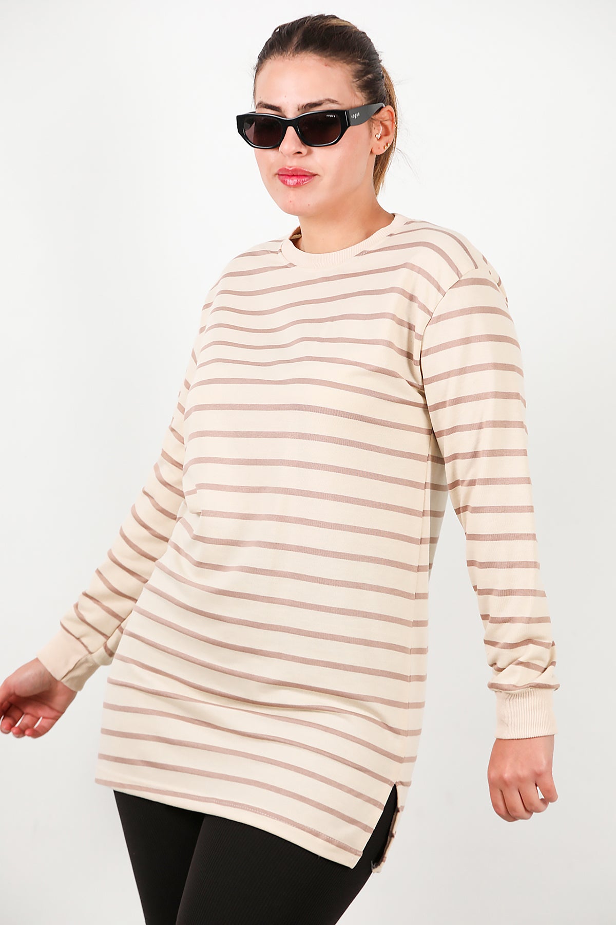 Büyük Beden Yan Yırtmaçlı Bisiklet Yaka Çizgili Tunik Vizon