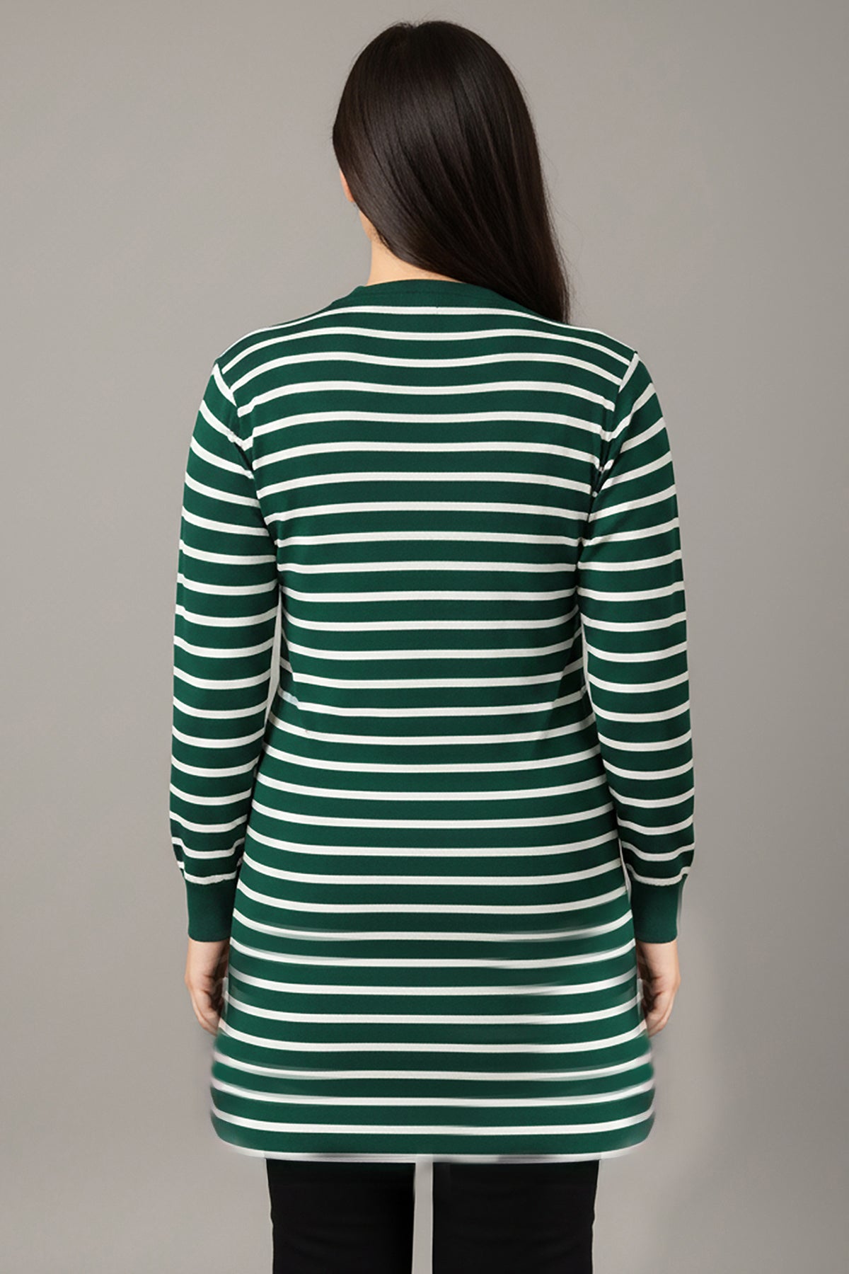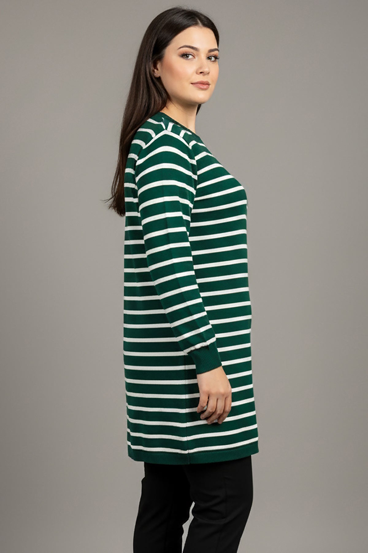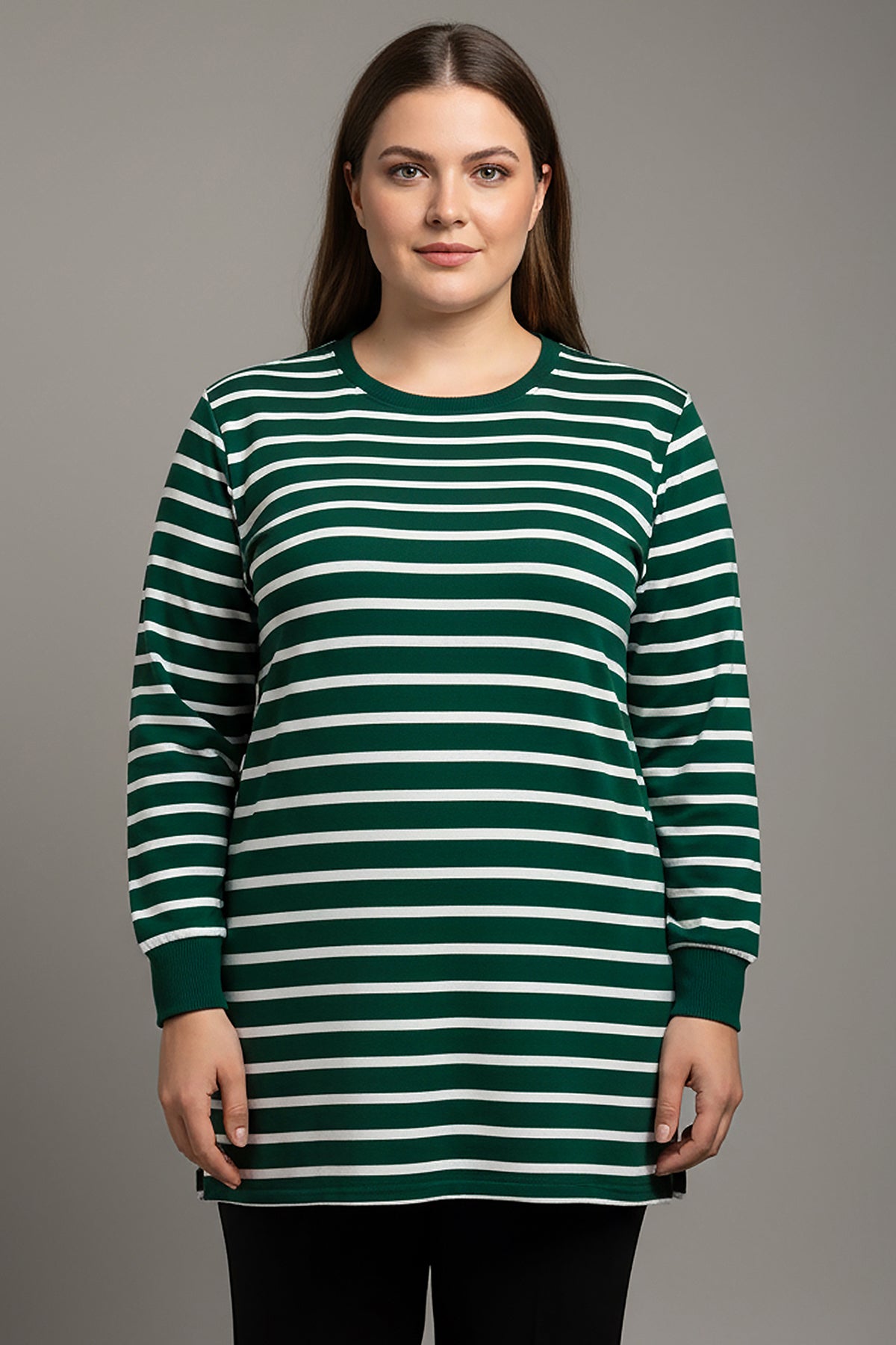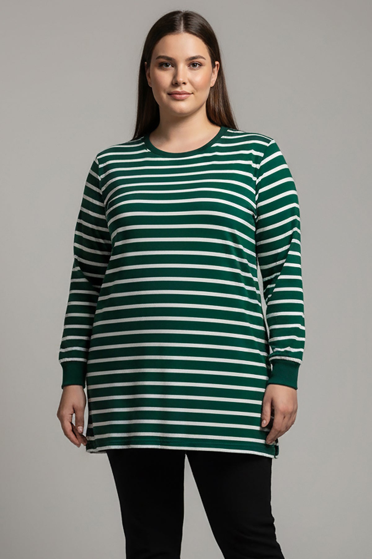 Büyük Beden Yan Yırtmaçlı Bisiklet Yaka Çizgili Tunik Zümrüt