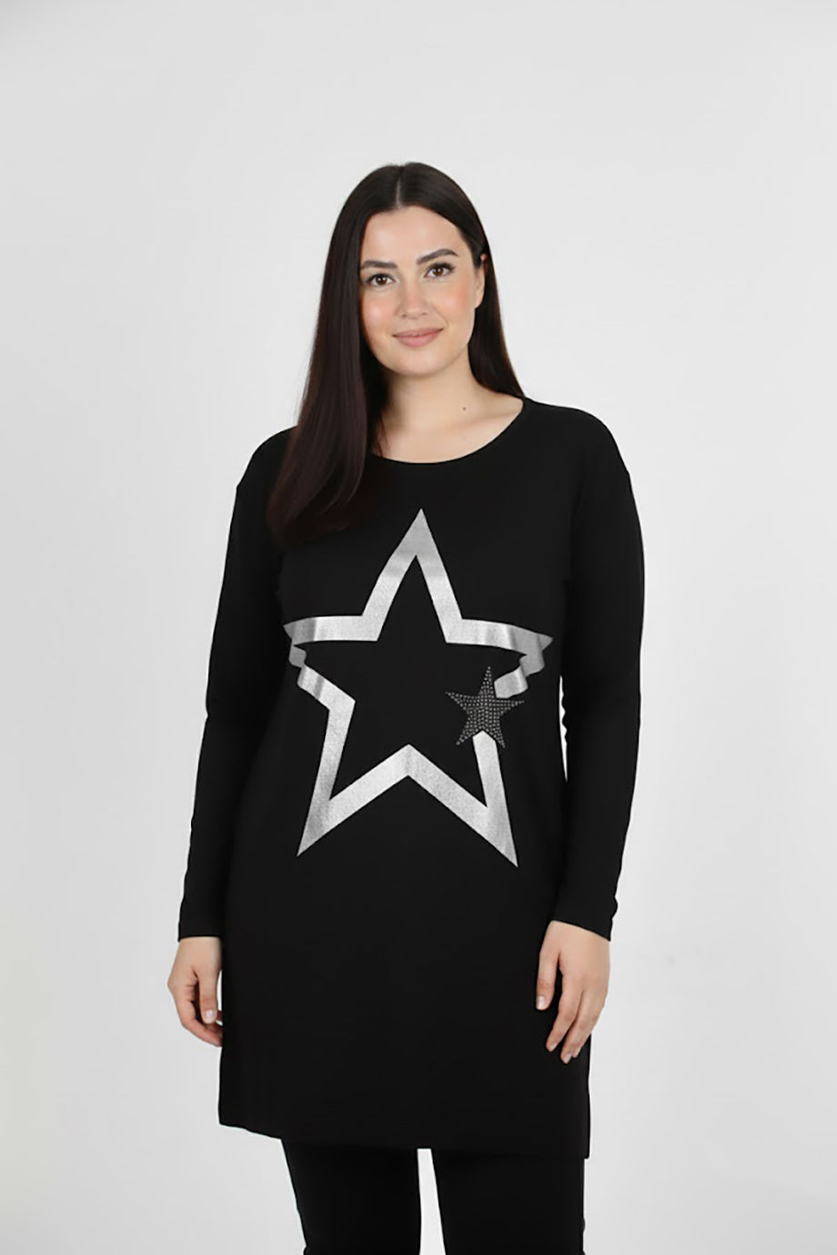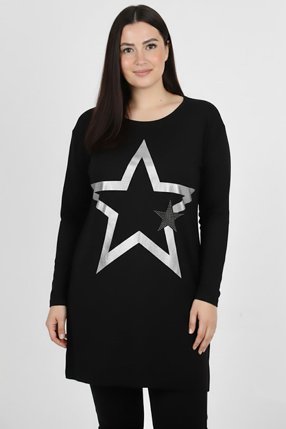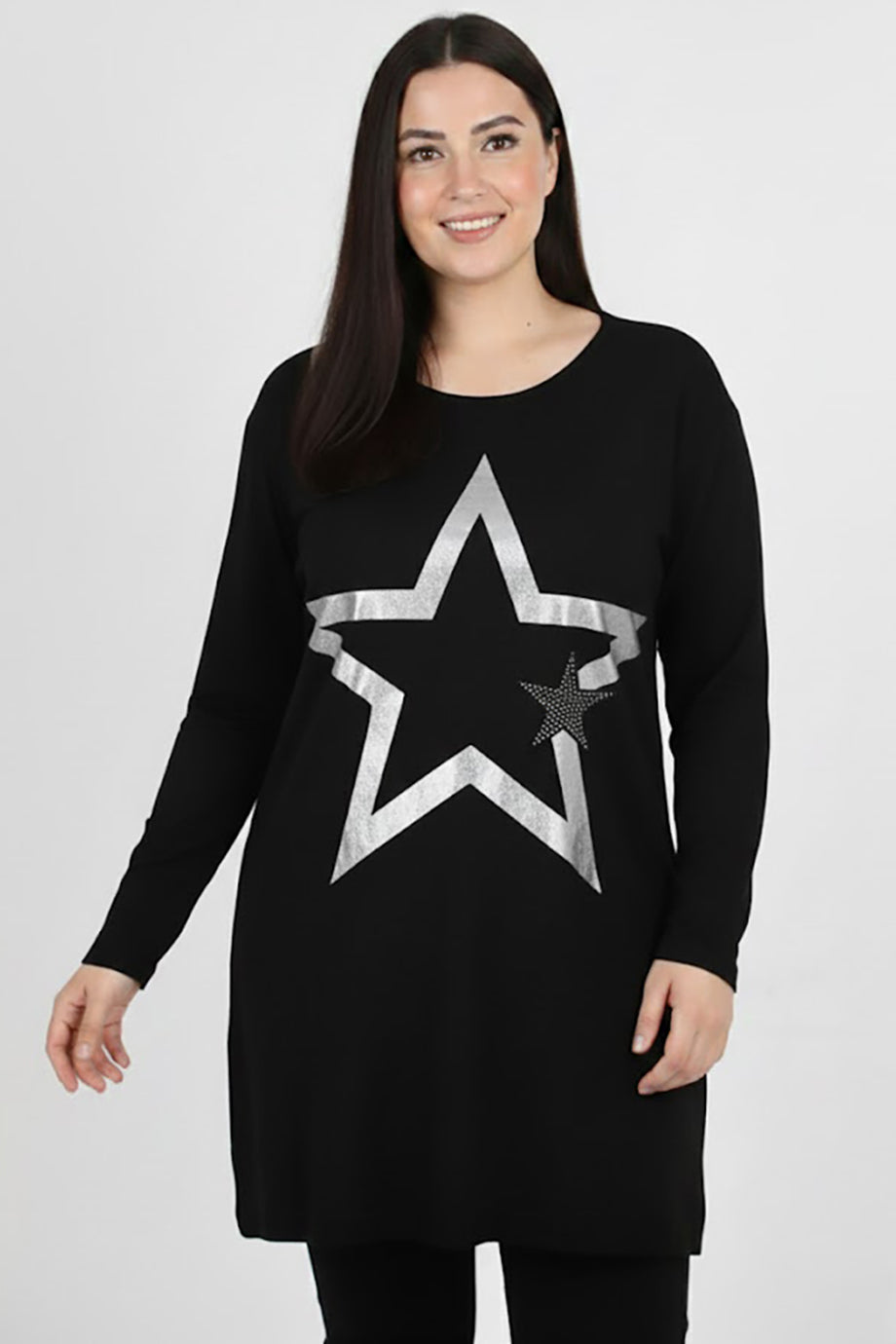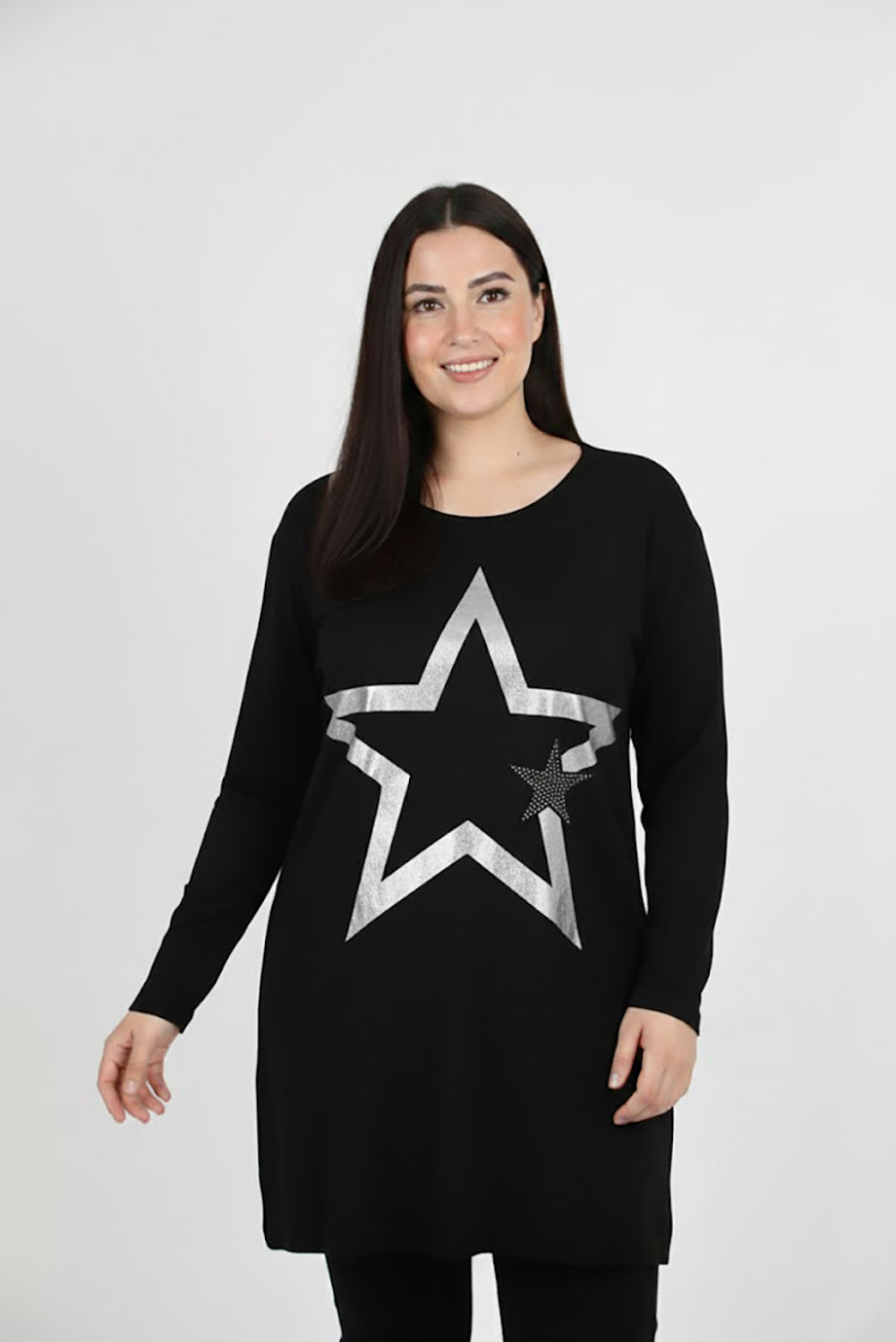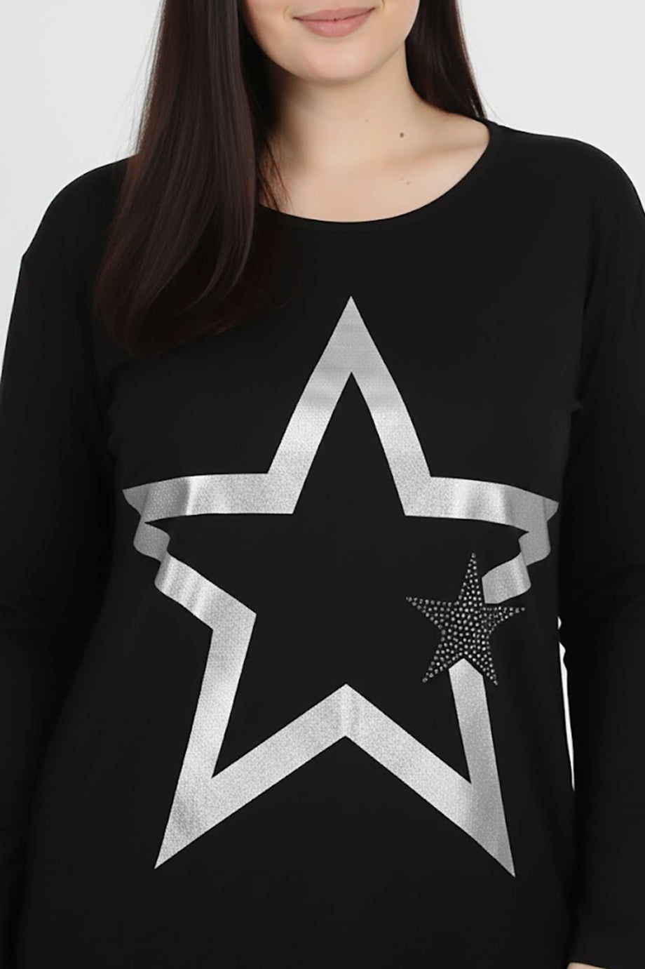 Glowia Büyük Beden Yıldız Varaklı Bluz Siyah