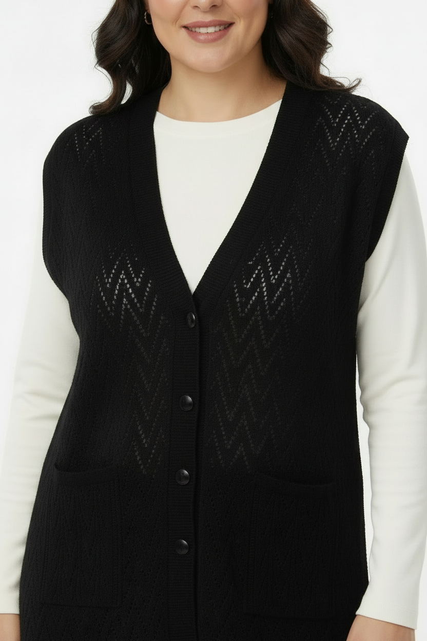 Zarif triko örgü detaylarıyla hem rahat hem de şık bir görünüm sunan kolsuz yelek. V yaka kesimi ve düğmeli ön tasarımıyla her kombine uyum sağlar.