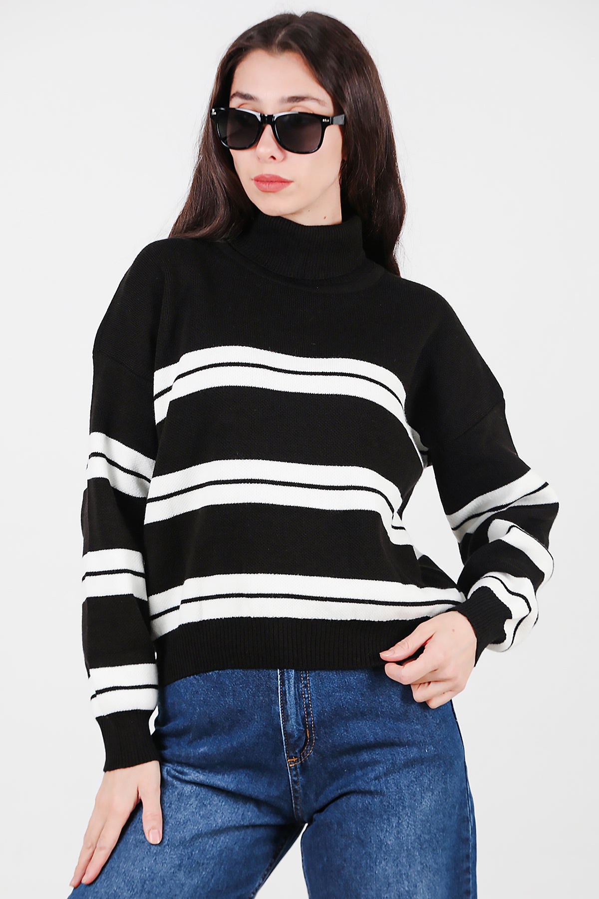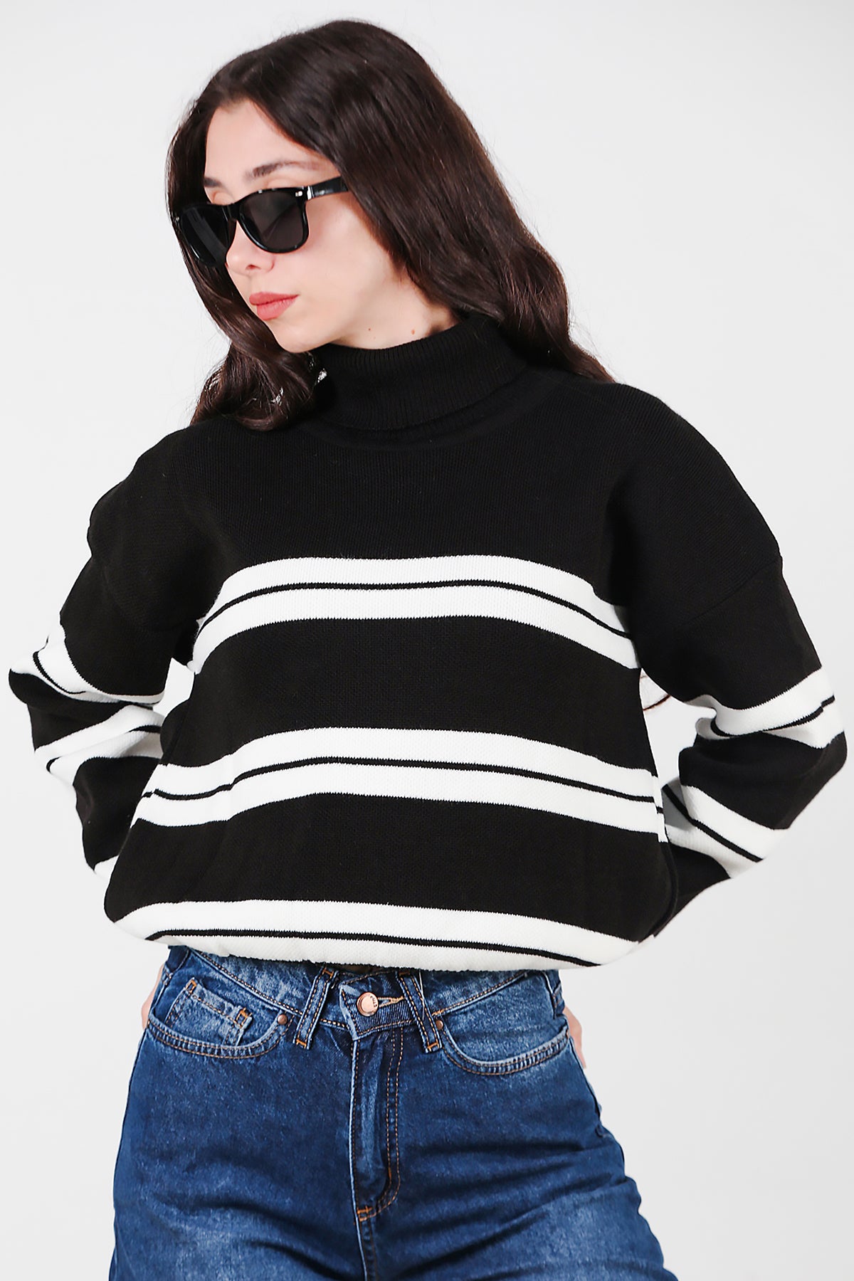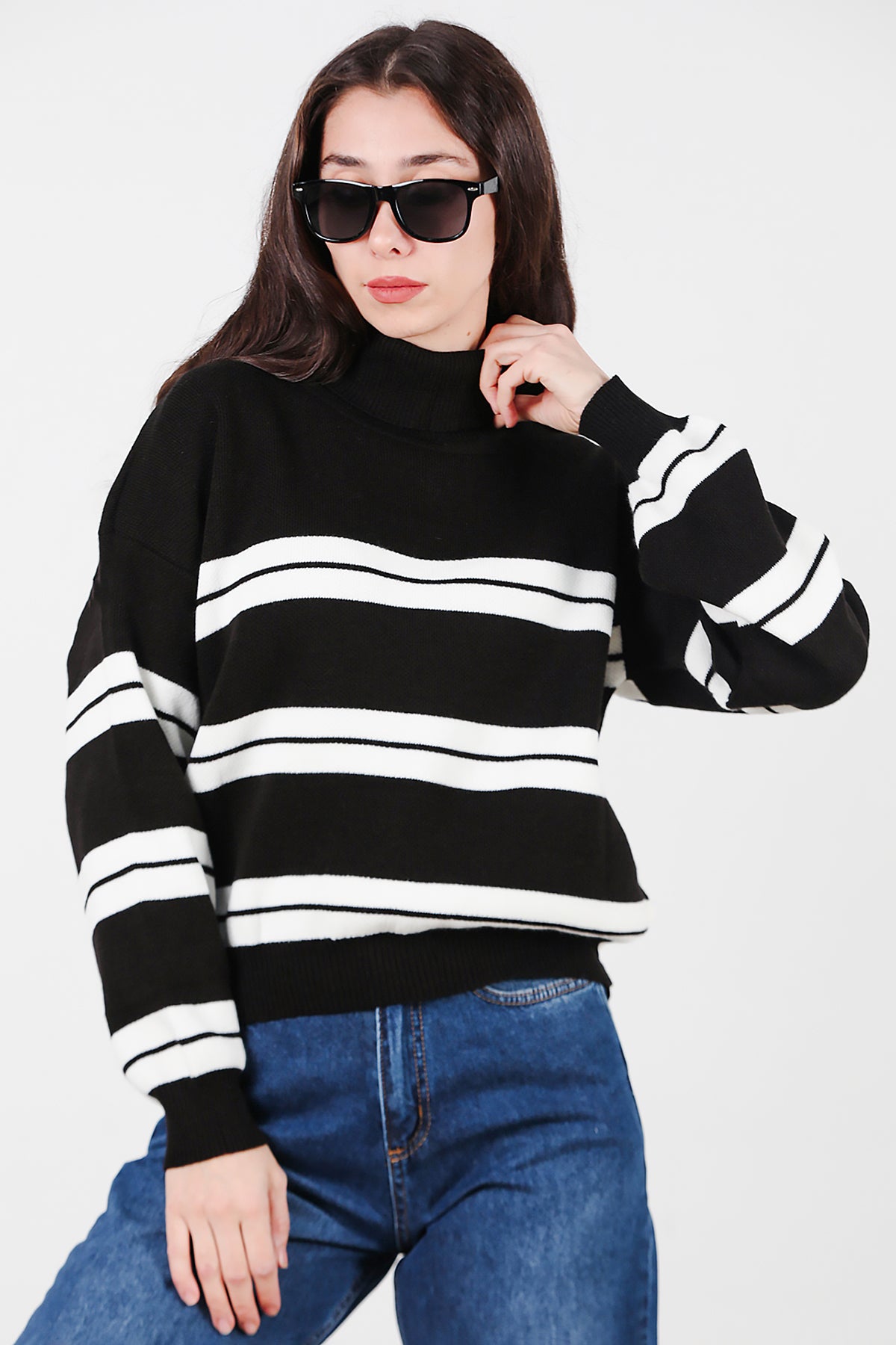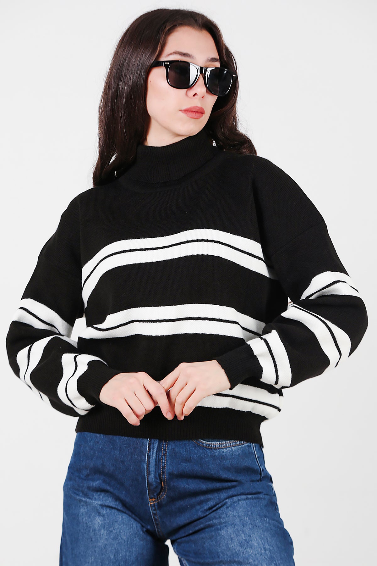 Kadın Balıkçı Yaka Çizgili Triko Kazak Siyah