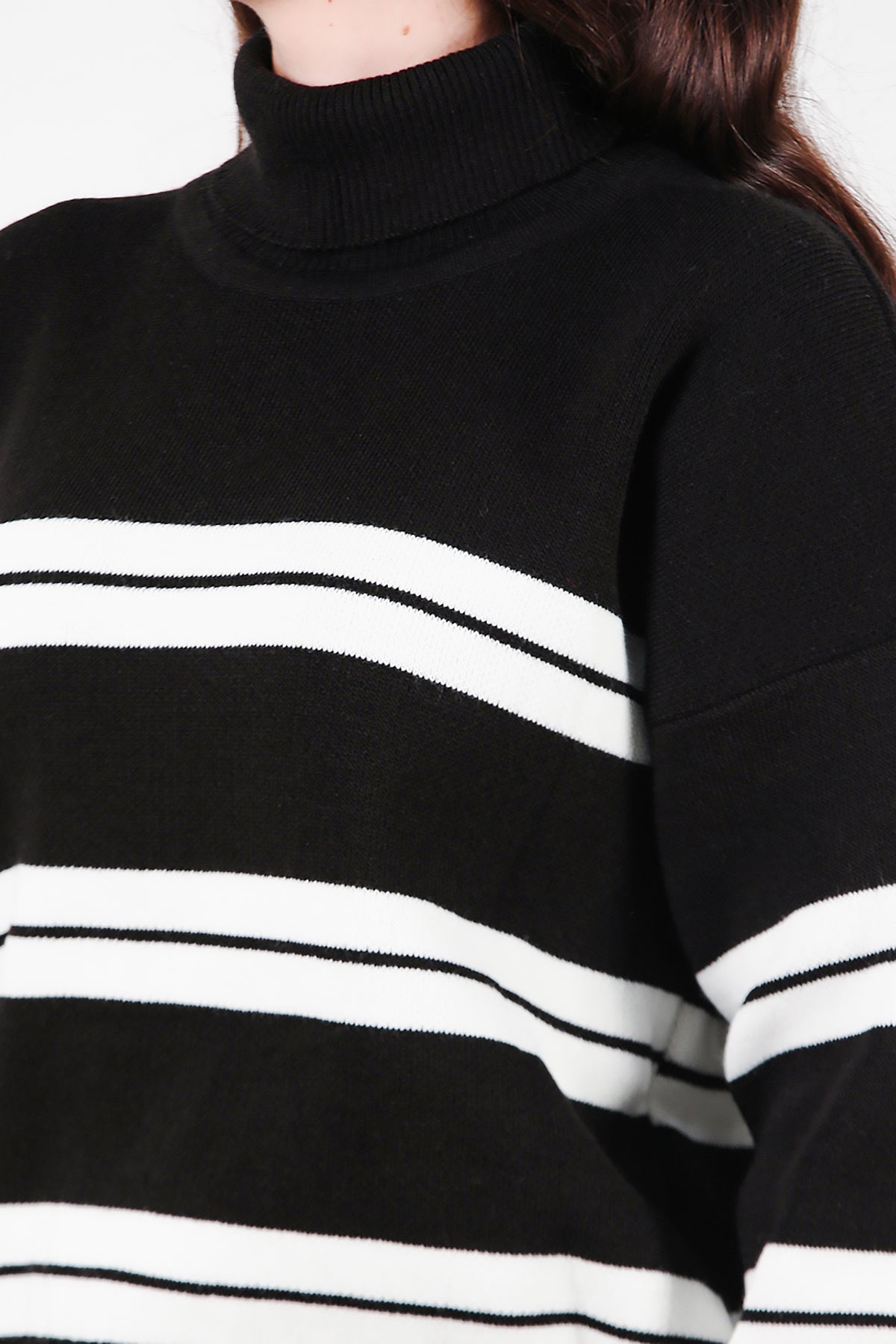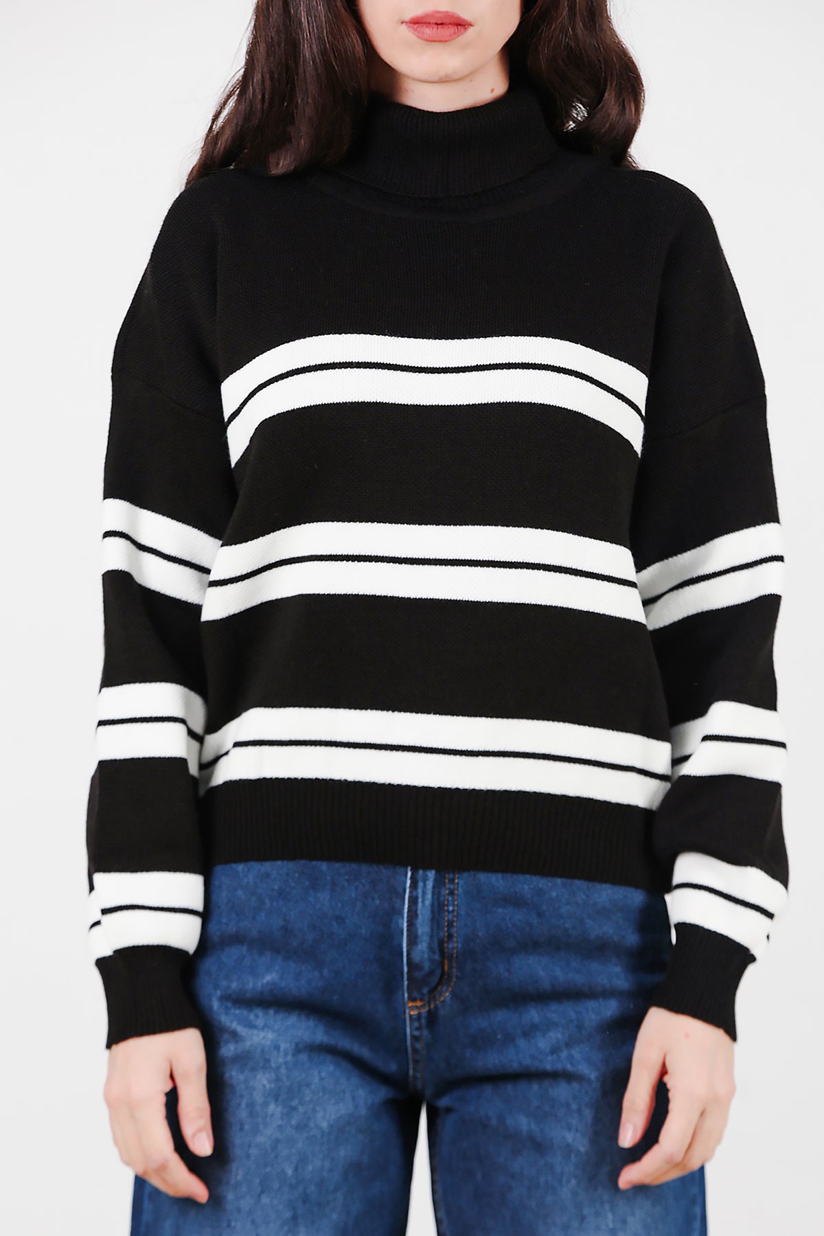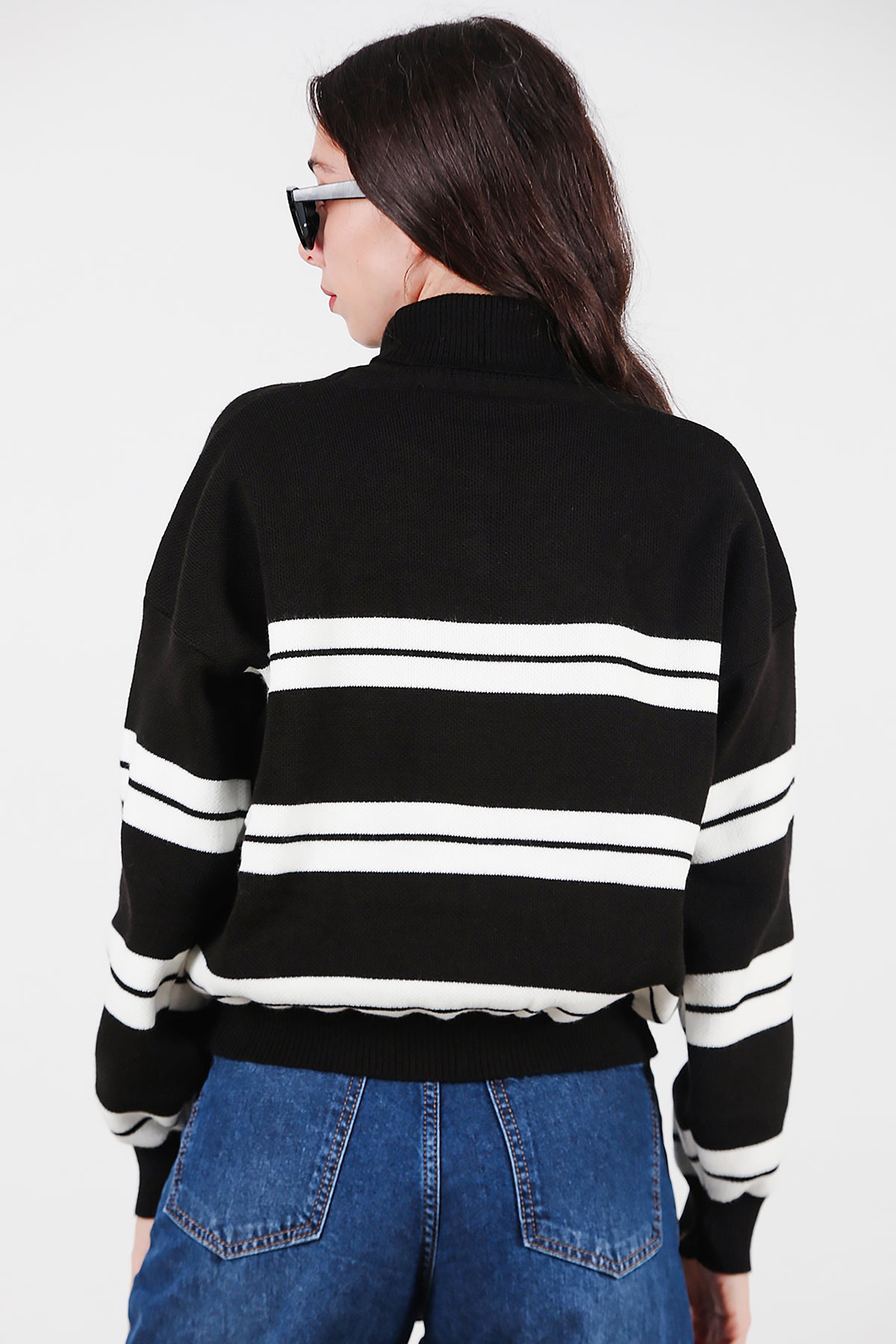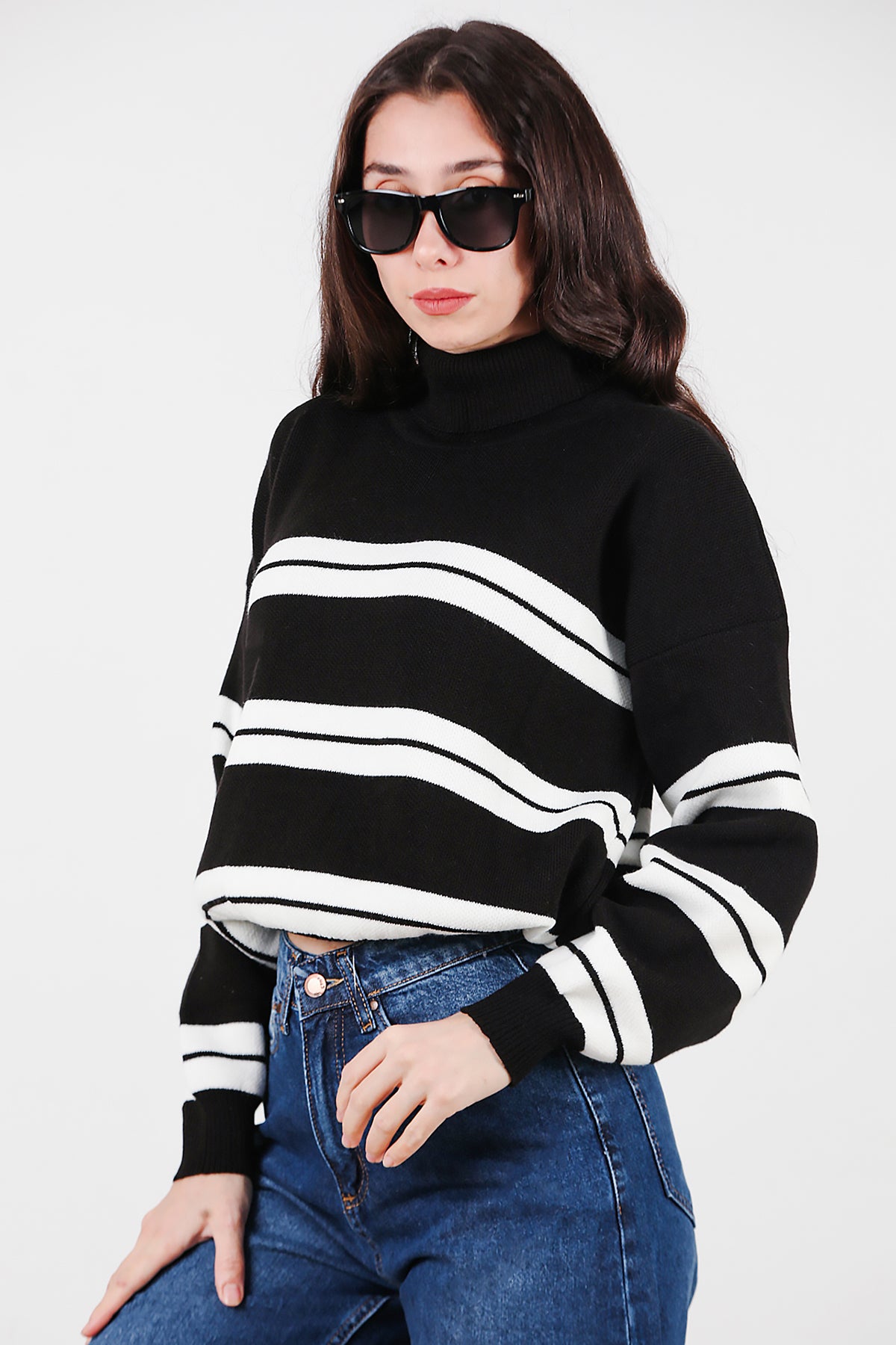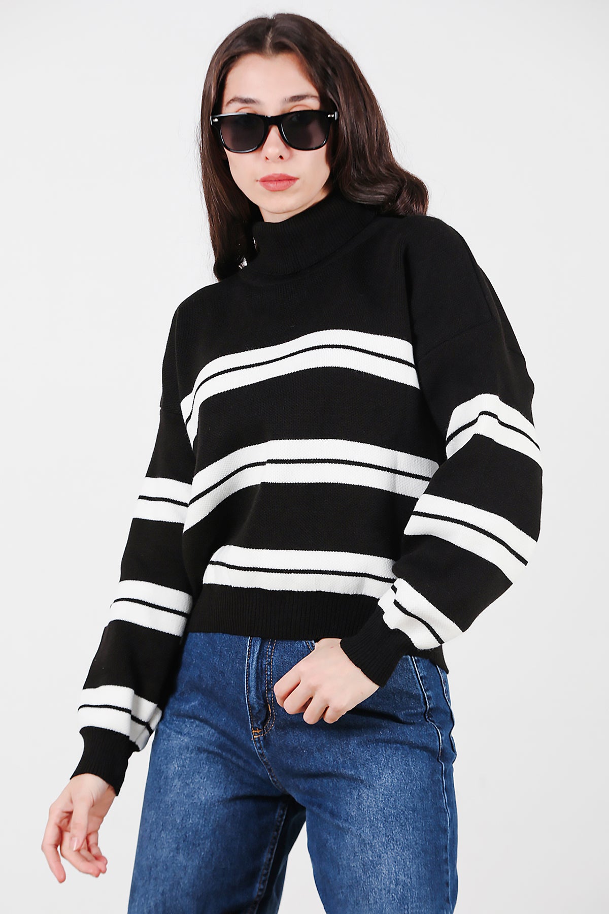 Kadın Balıkçı Yaka Çizgili Triko Kazak Siyah