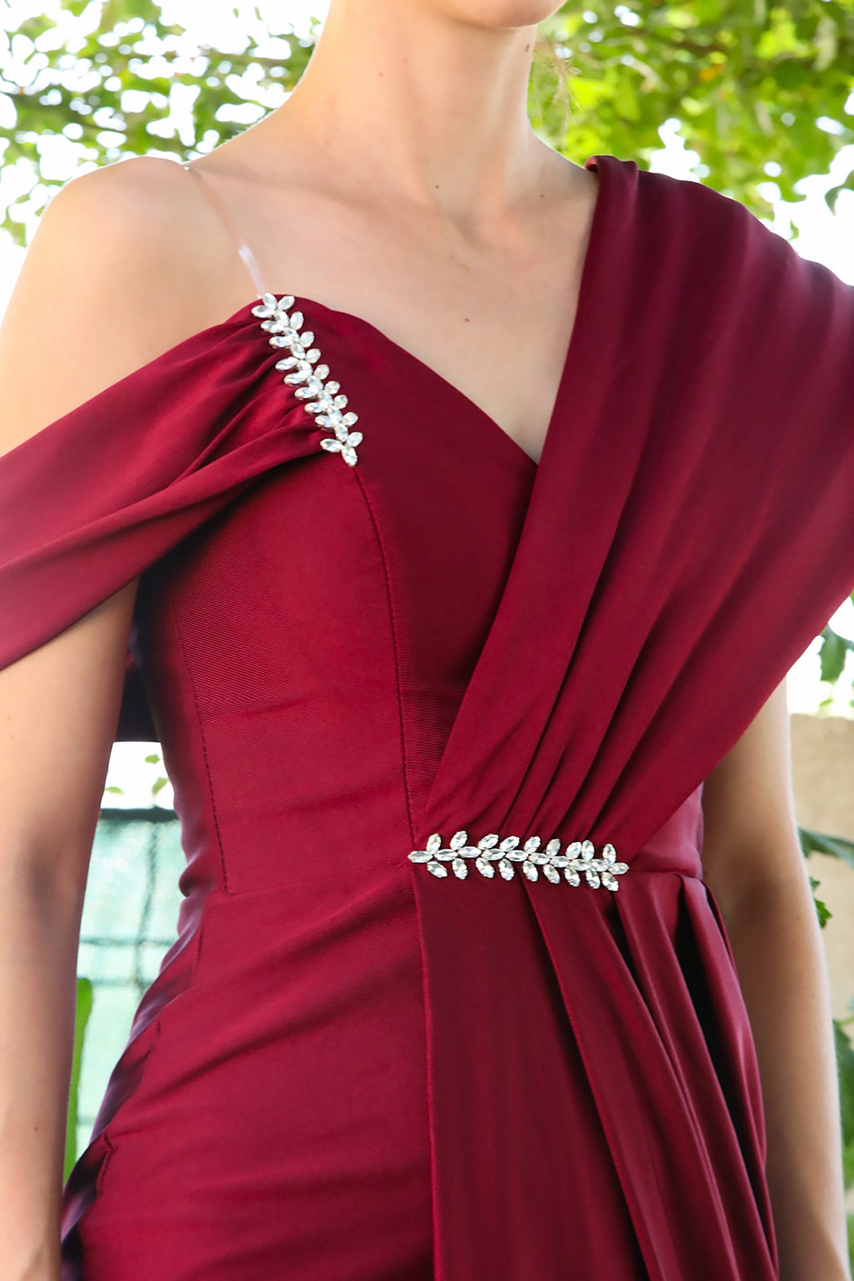 Kadın Bel Göğüs Taş Detay Abiye Bordo