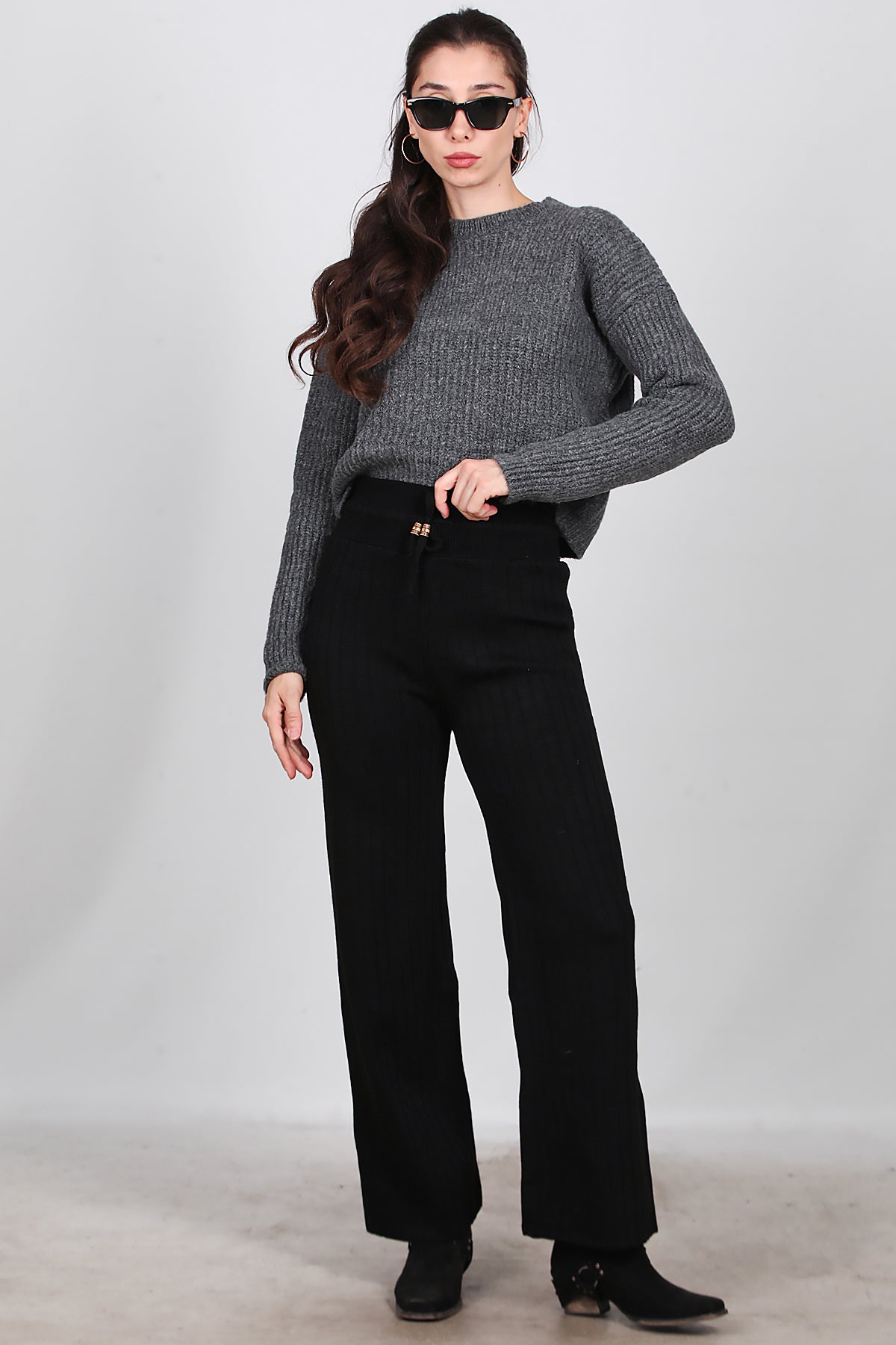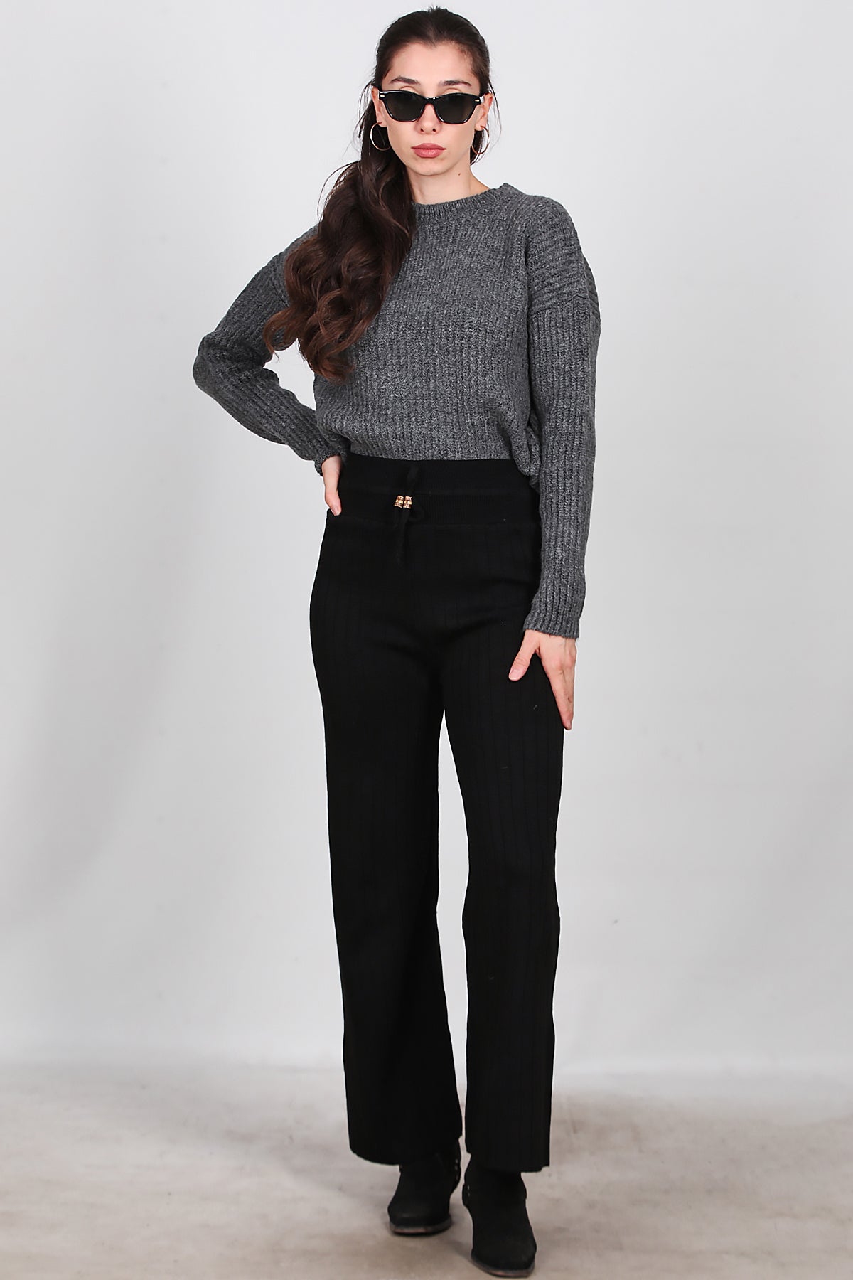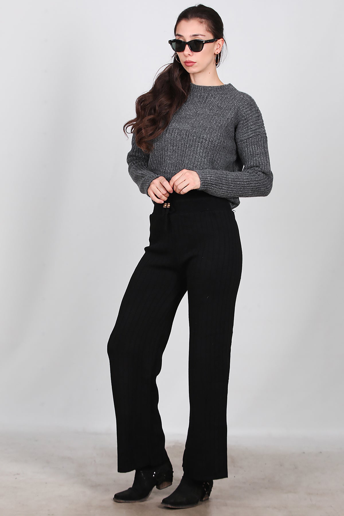 Kadın Bel Ip Detay Triko Pantolon Siyah
