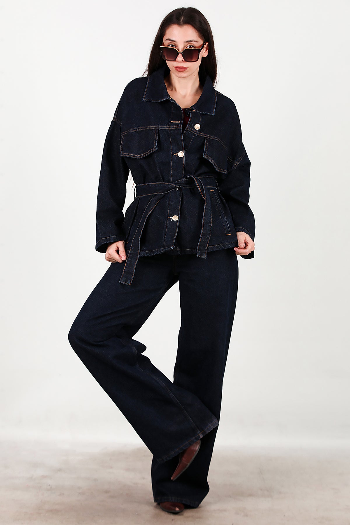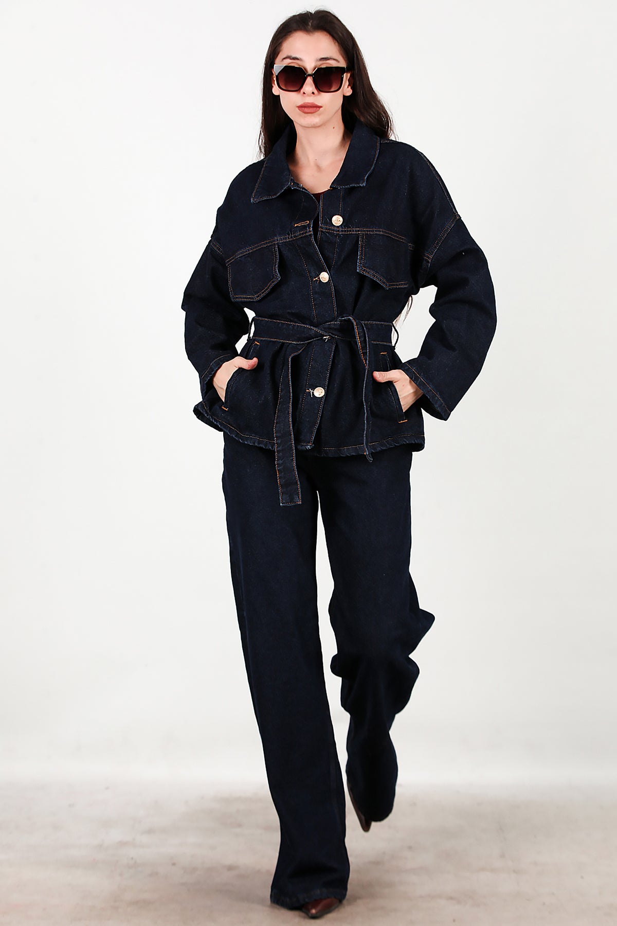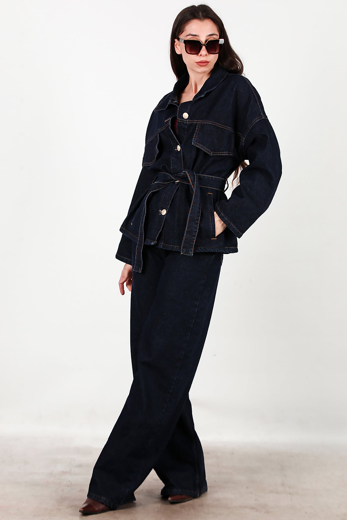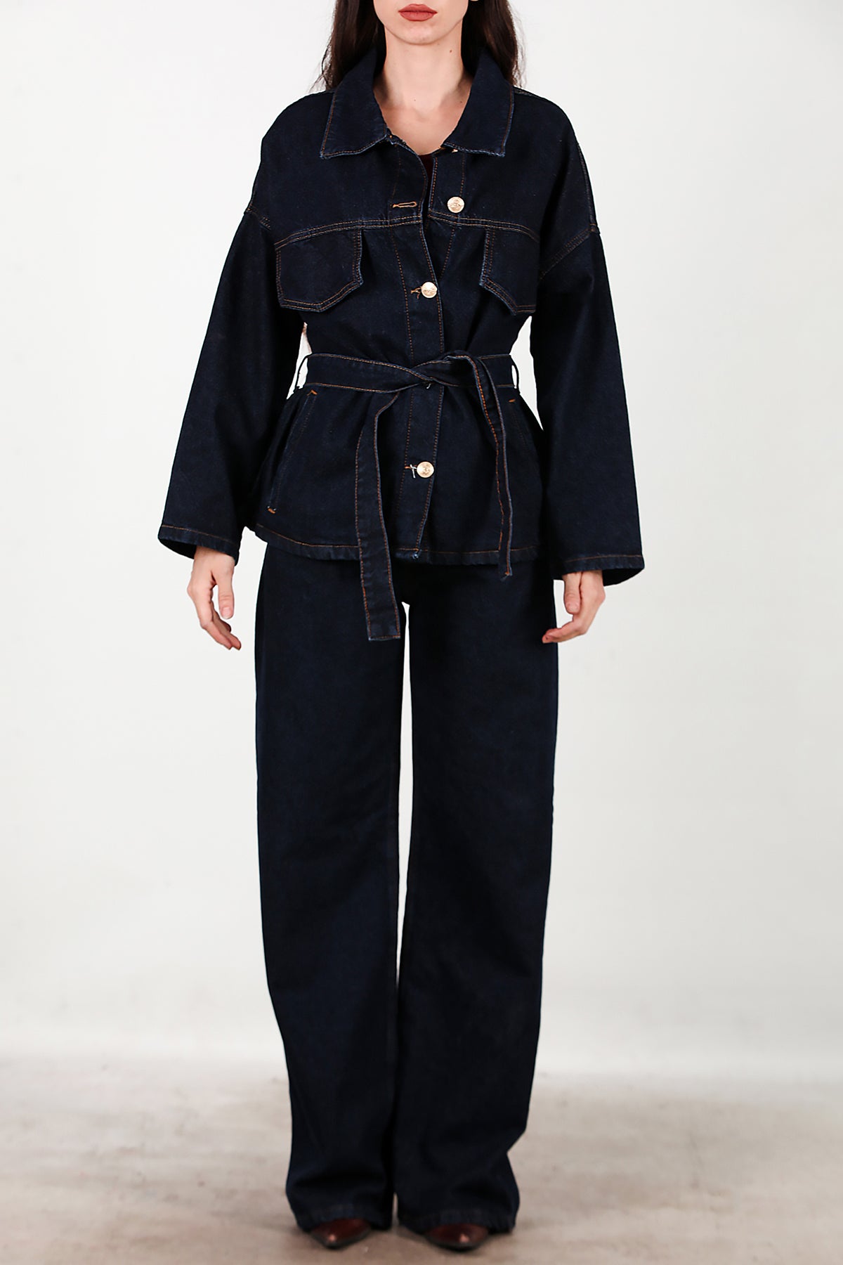 Kadın Bel Kuşak Detay Kot Ceket Pantolon Takımı Lacivert