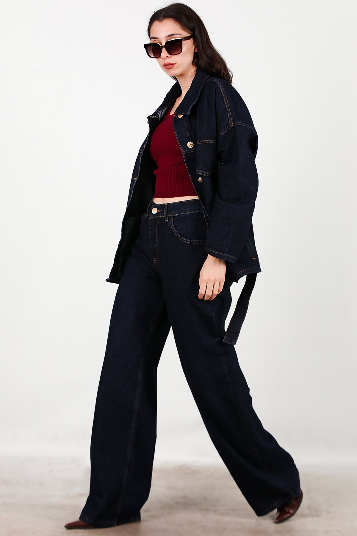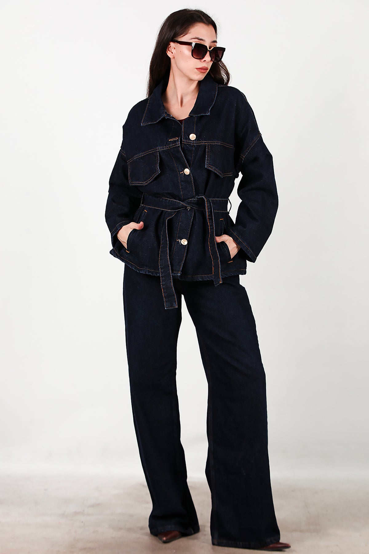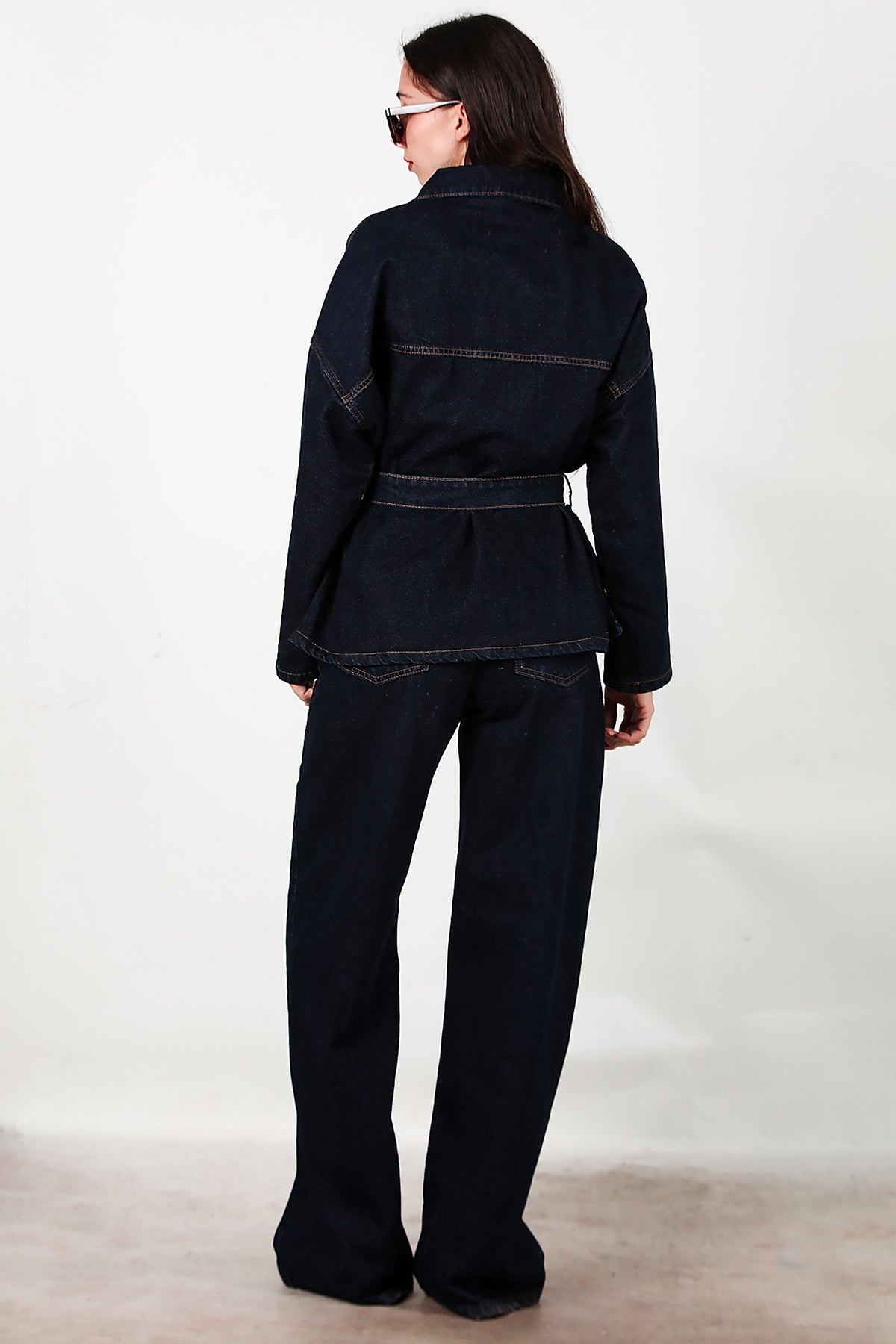 Kadın Bel Kuşak Detay Kot Ceket Pantolon Takımı Lacivert