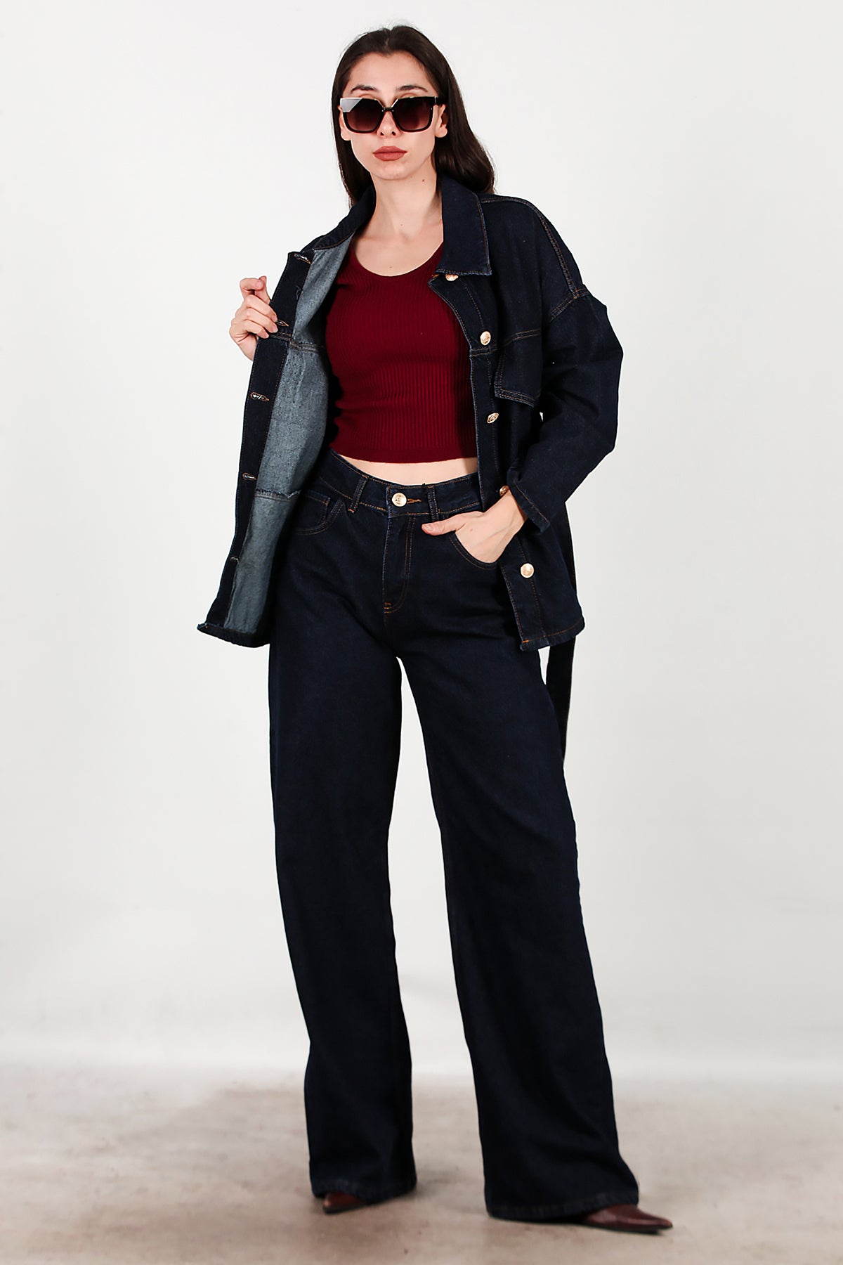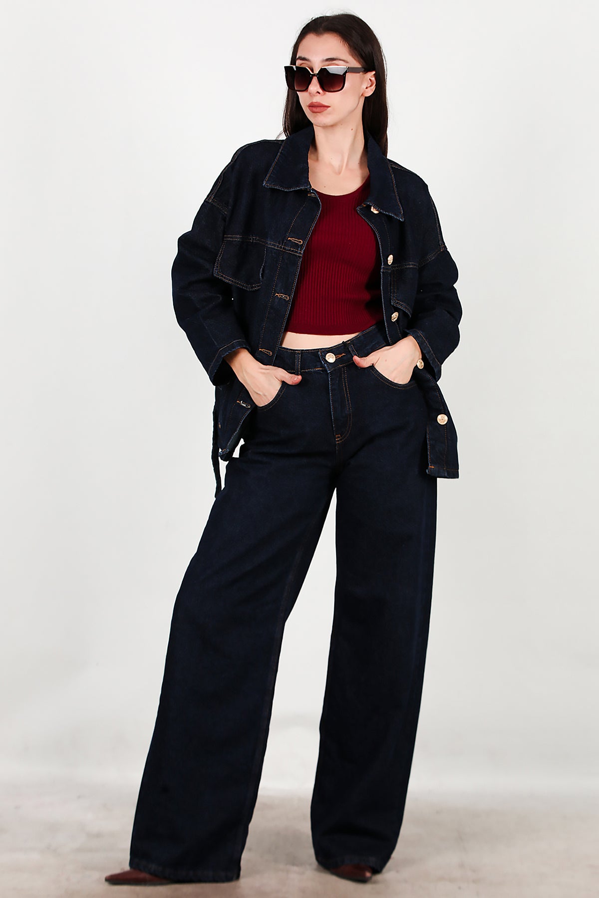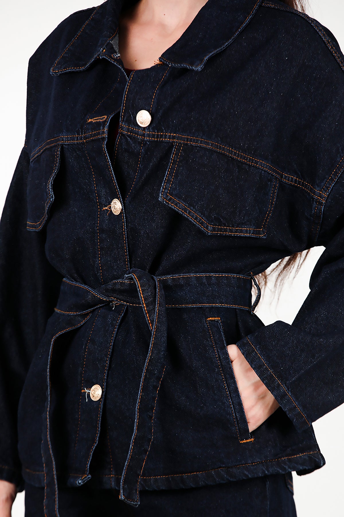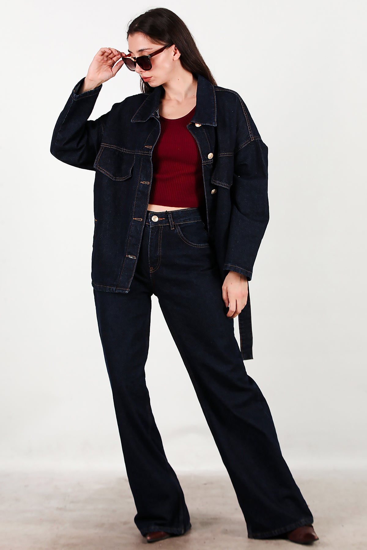 Kadın Bel Kuşak Detay Kot Ceket Pantolon Takımı Lacivert