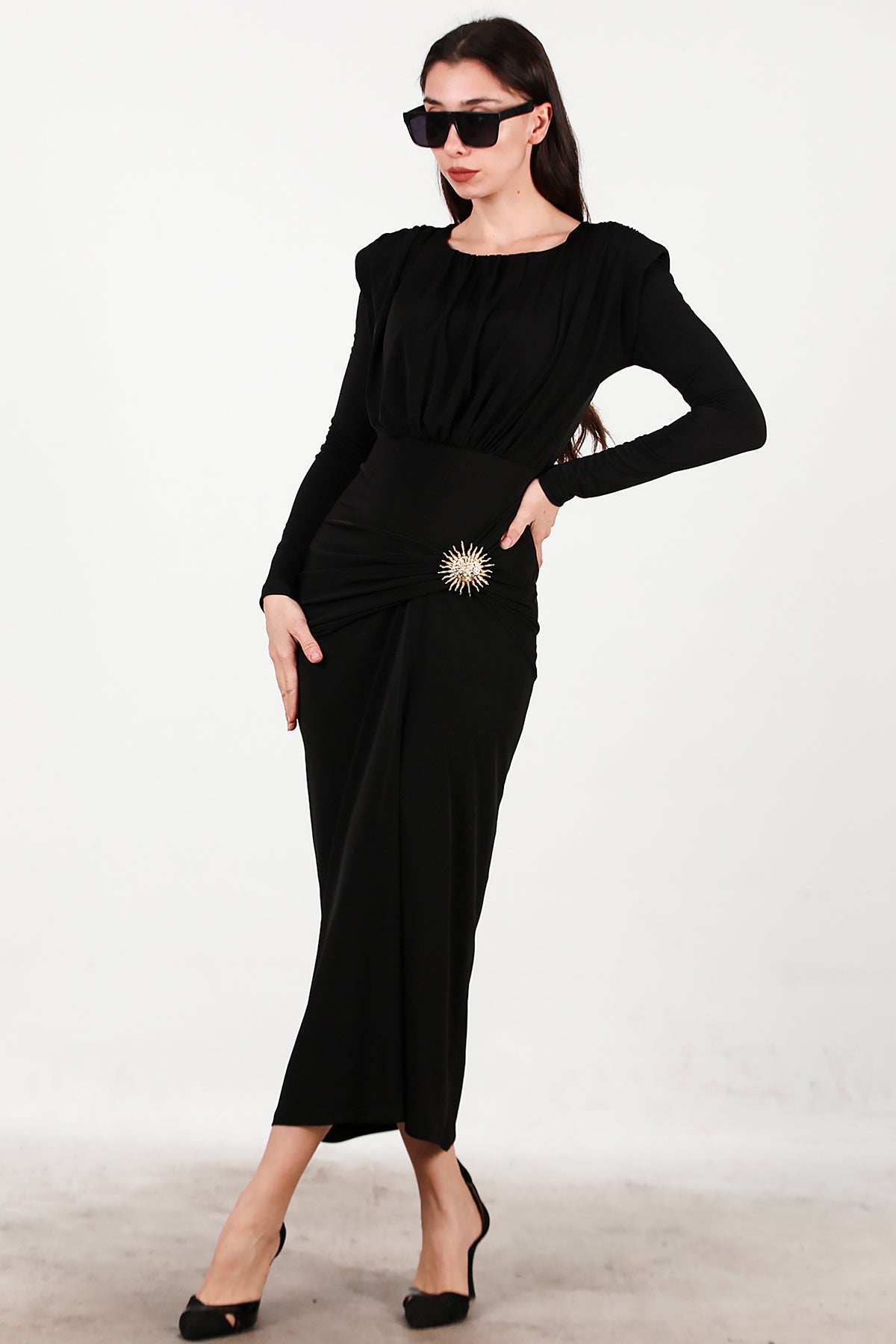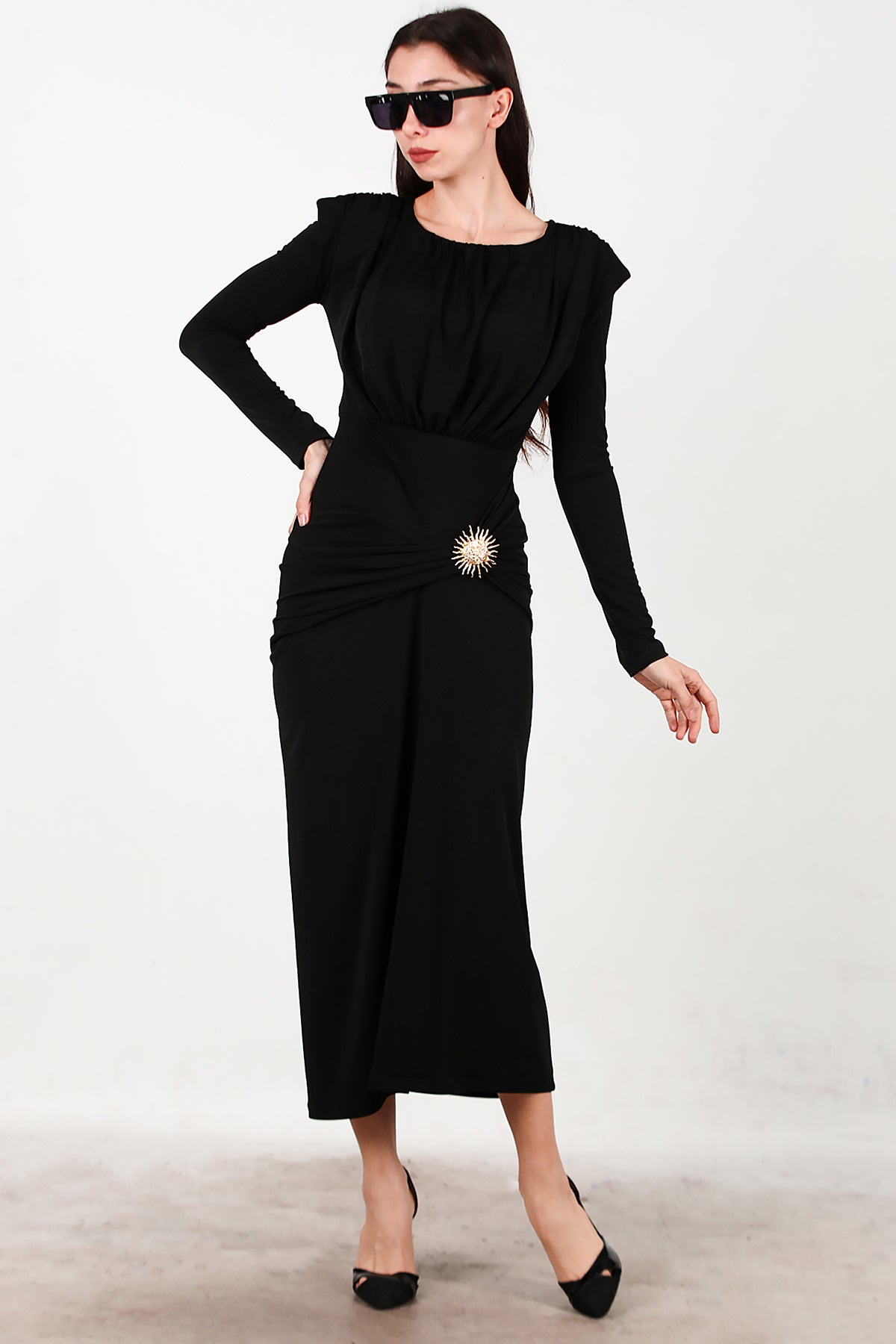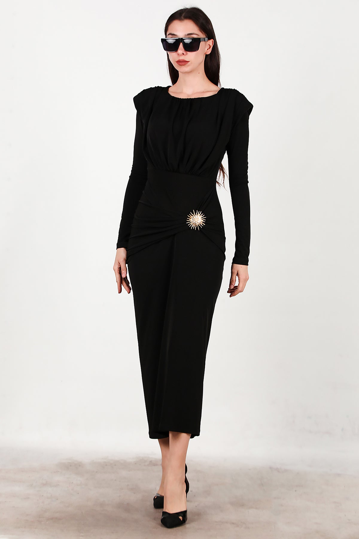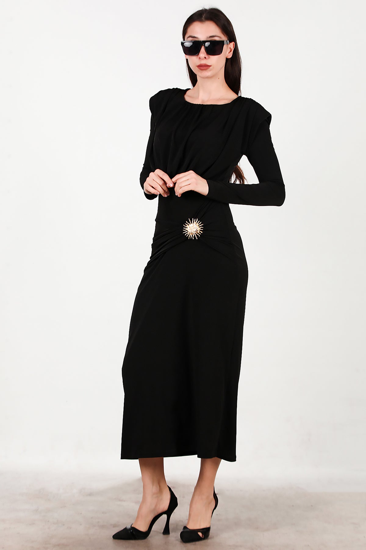Kadın Bel Toka Detay Uzun Elbise Siyah