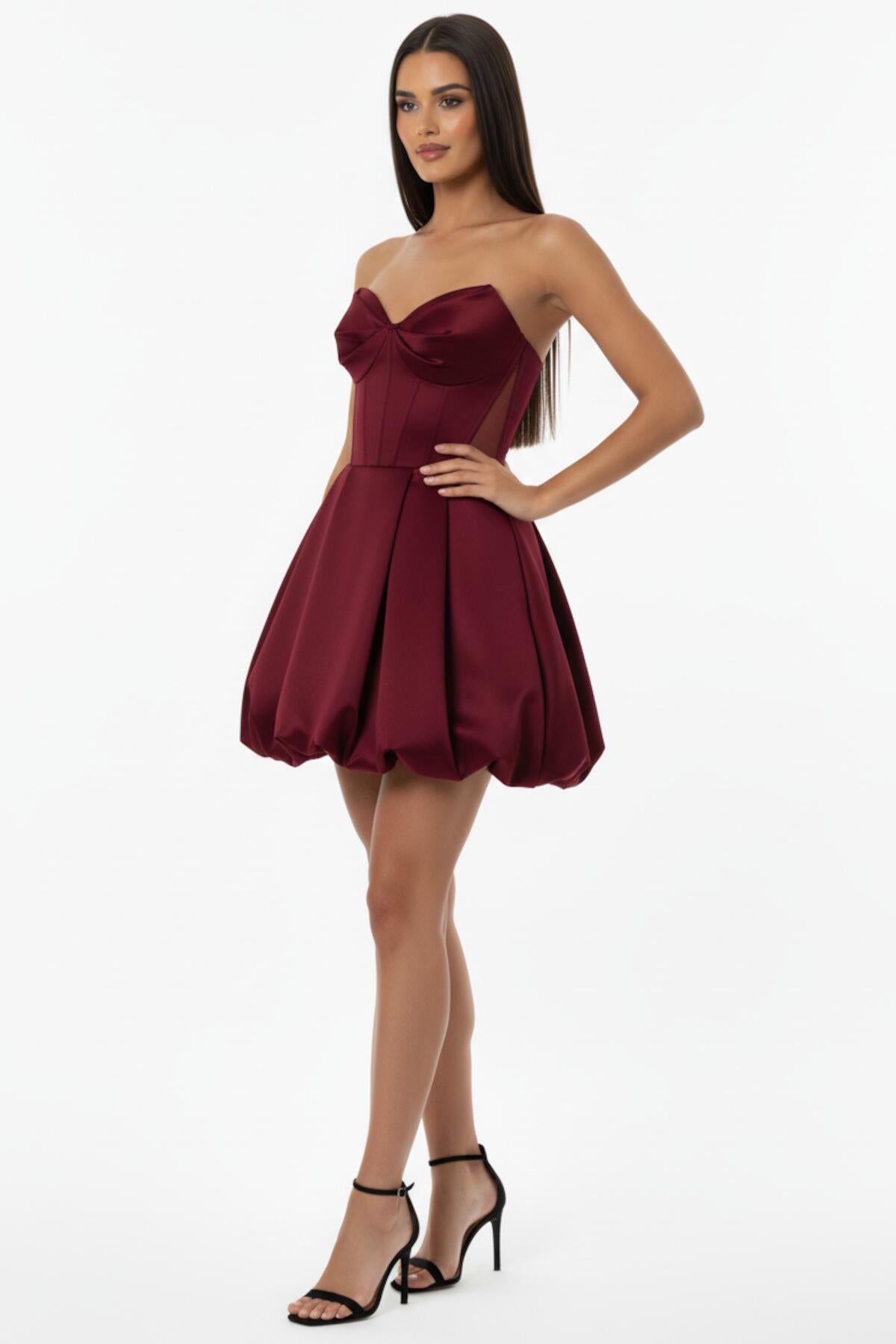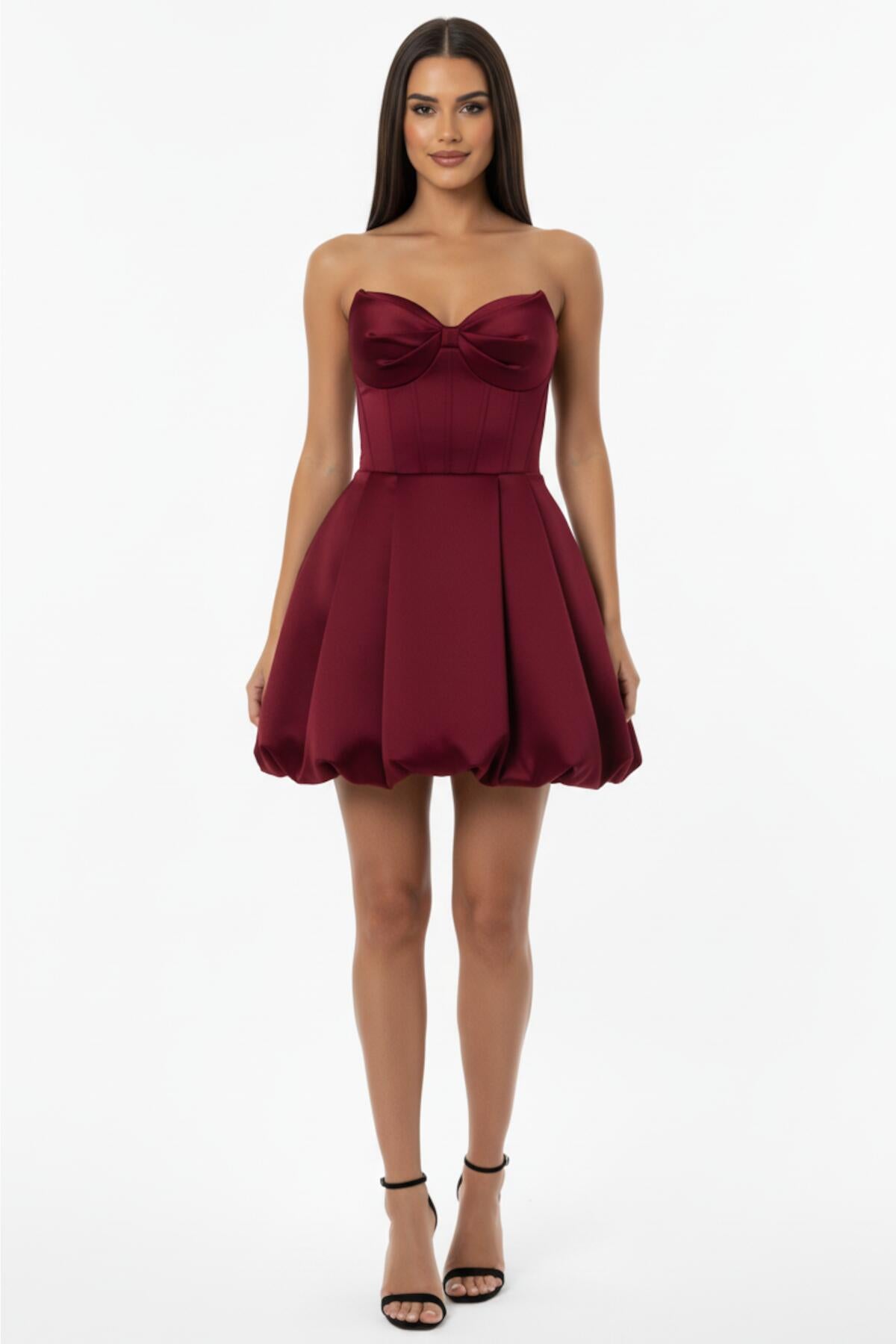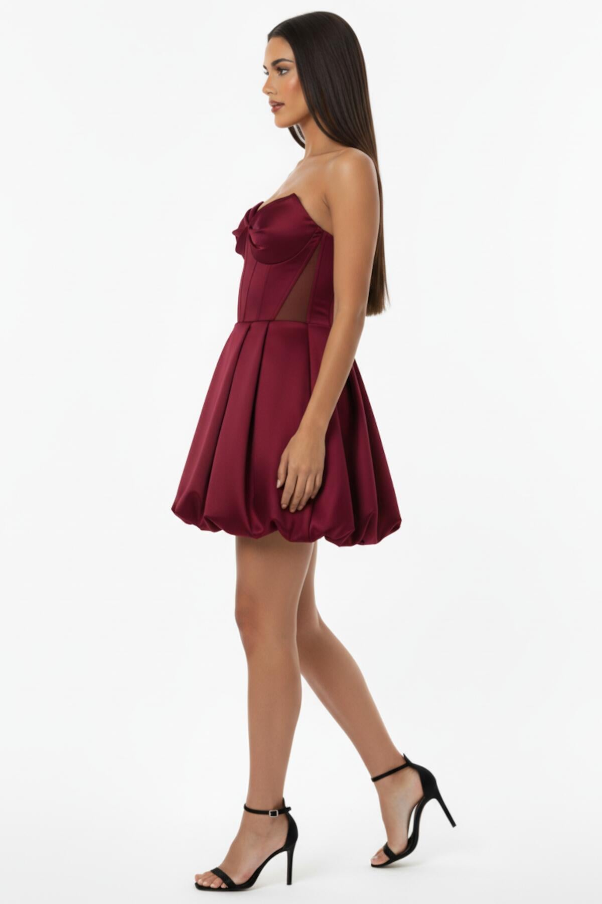 Kadın Bel Tül Detay Kısa Saten Abiye Bordo