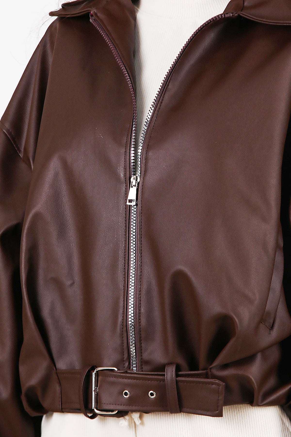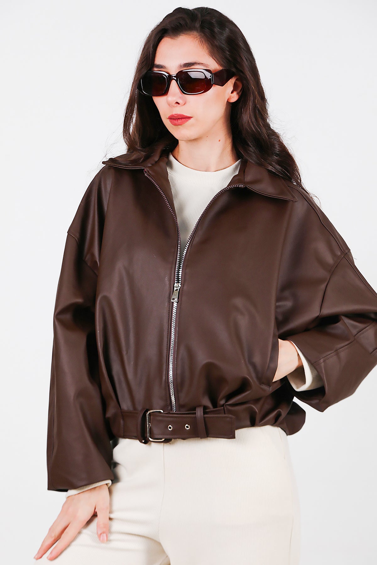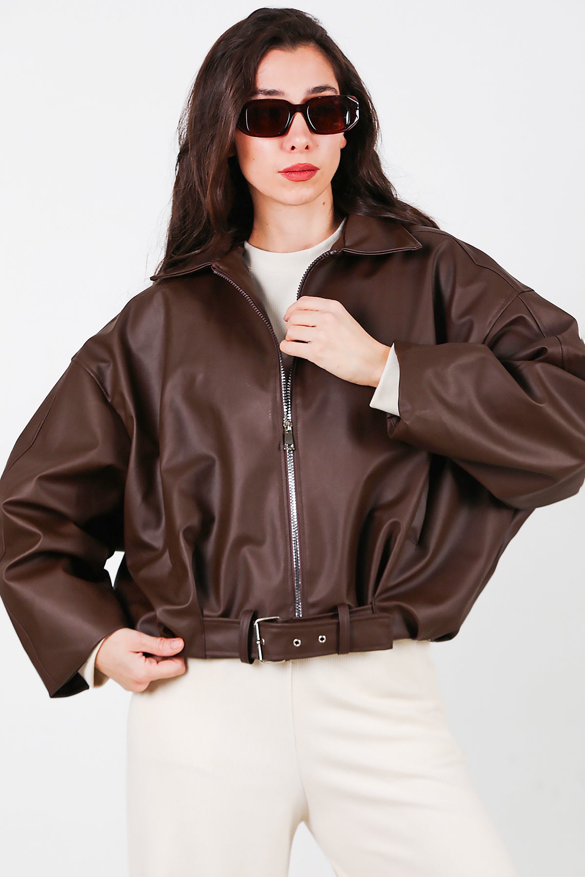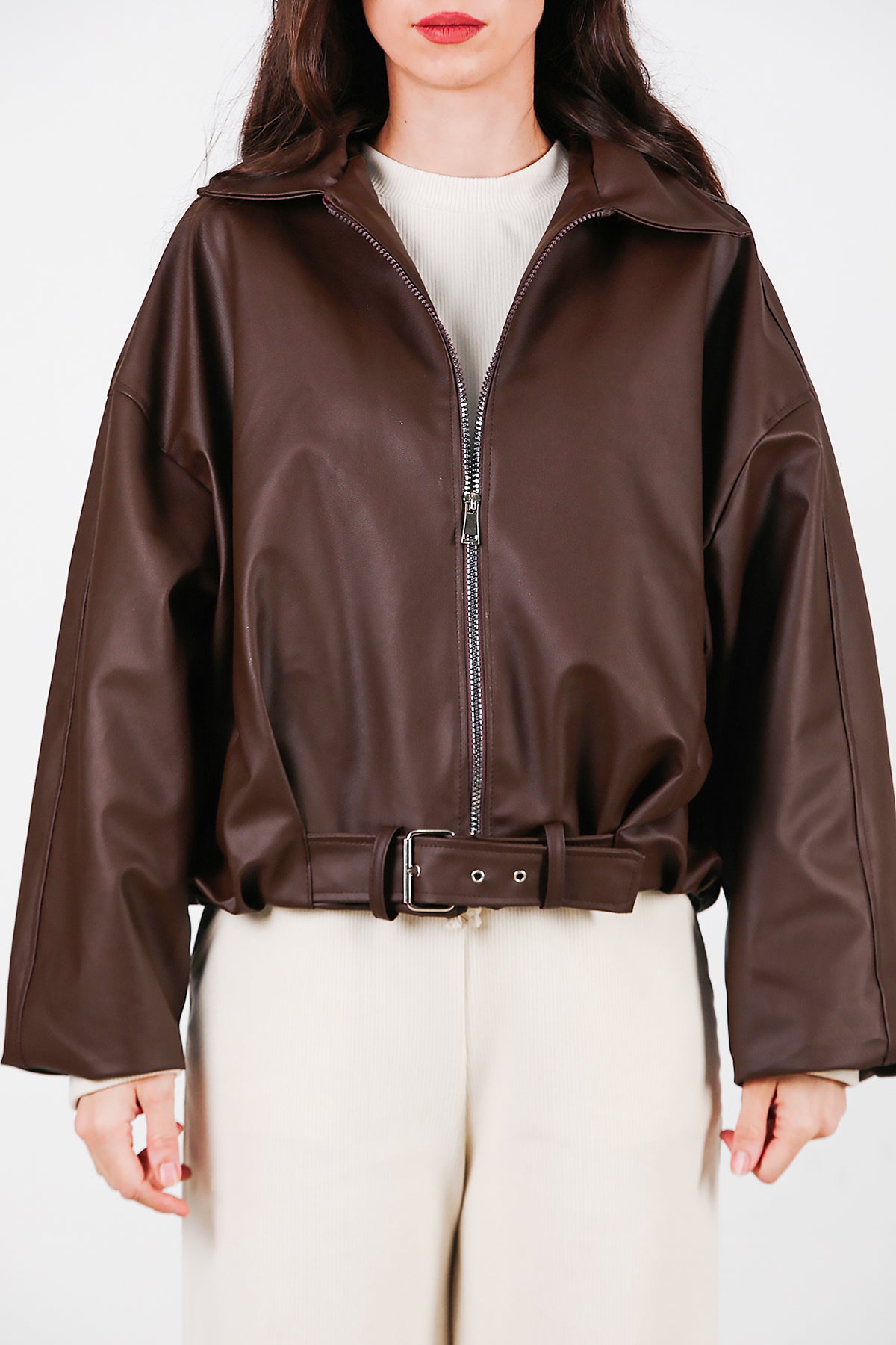 Kadın Beli Kemerli Deri Ceket Kahverengi