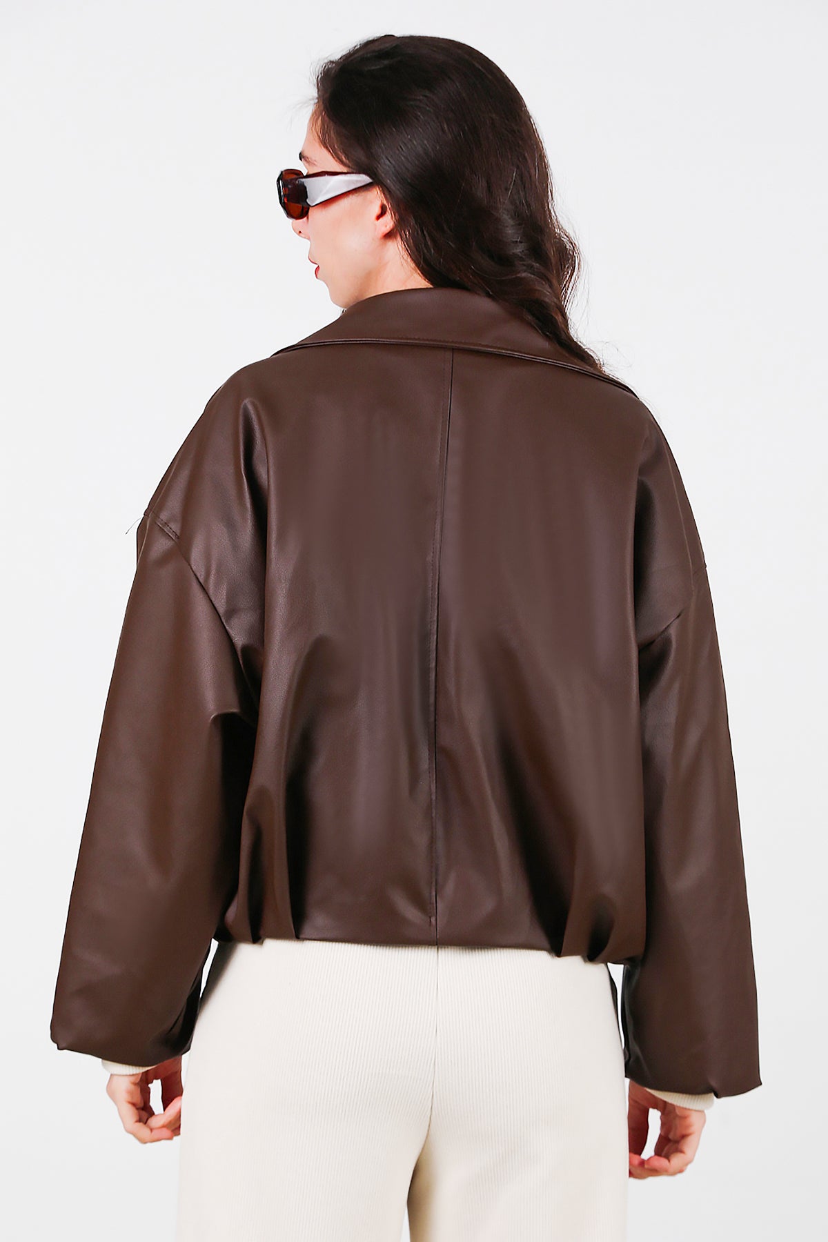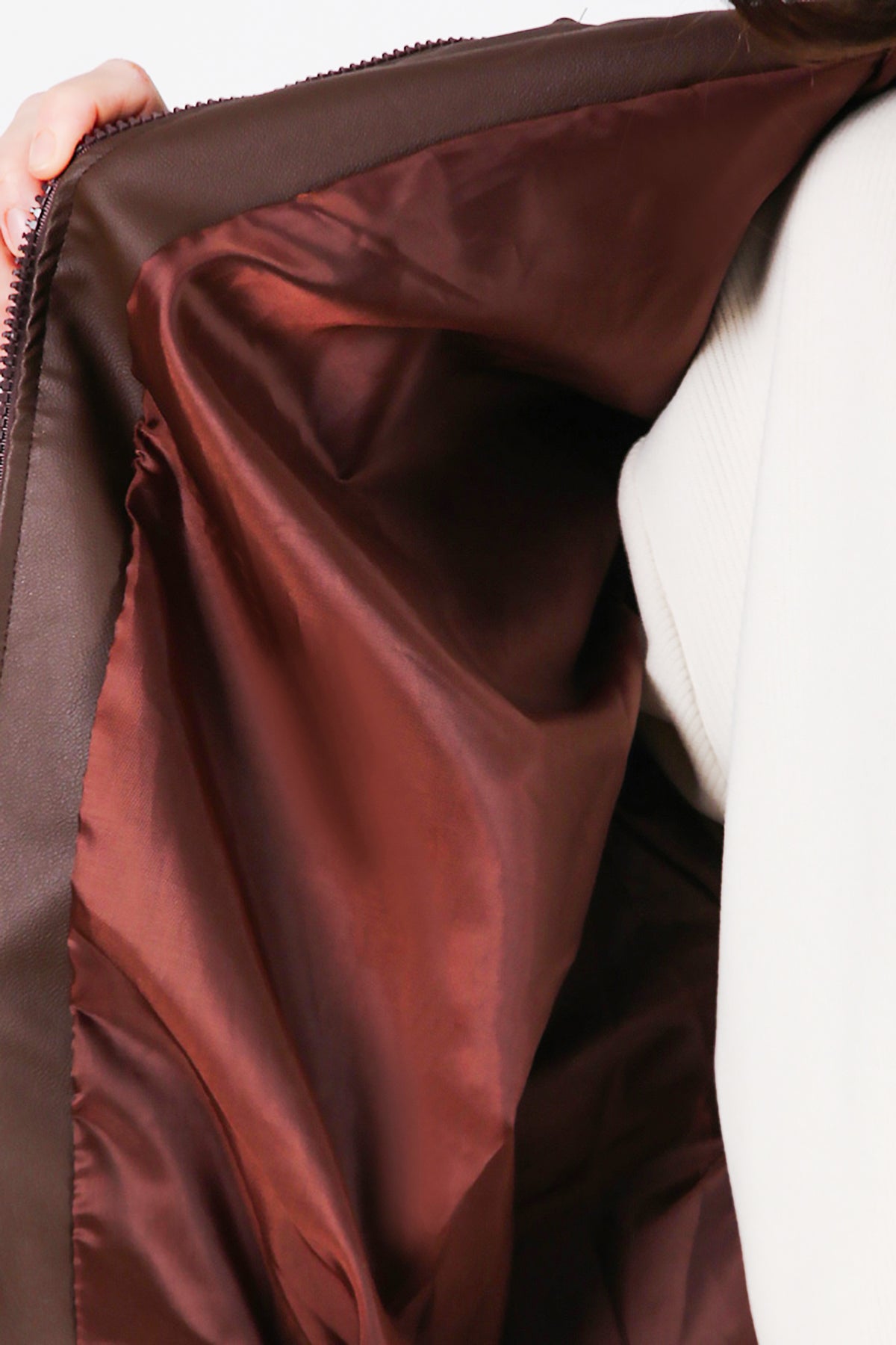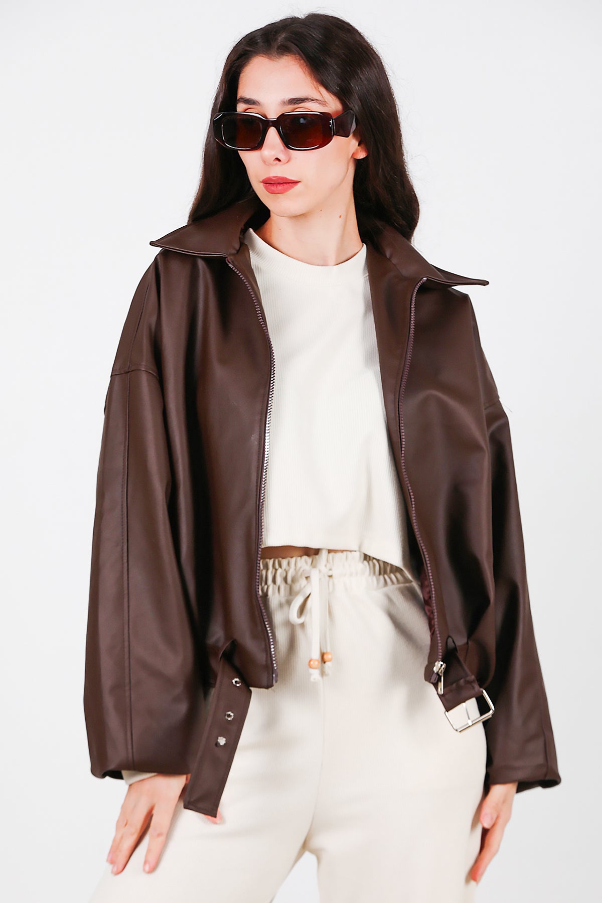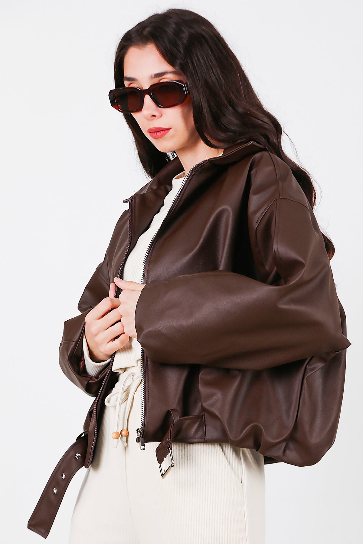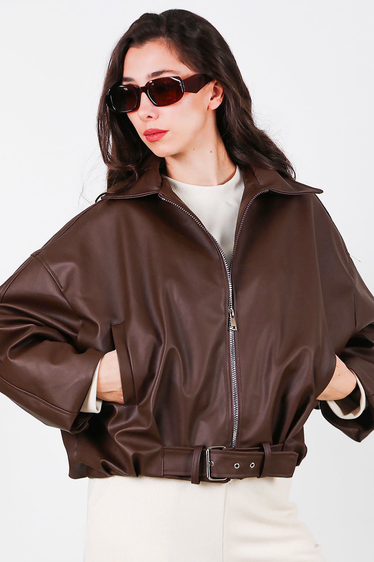 Kadın Beli Kemerli Deri Ceket Kahverengi