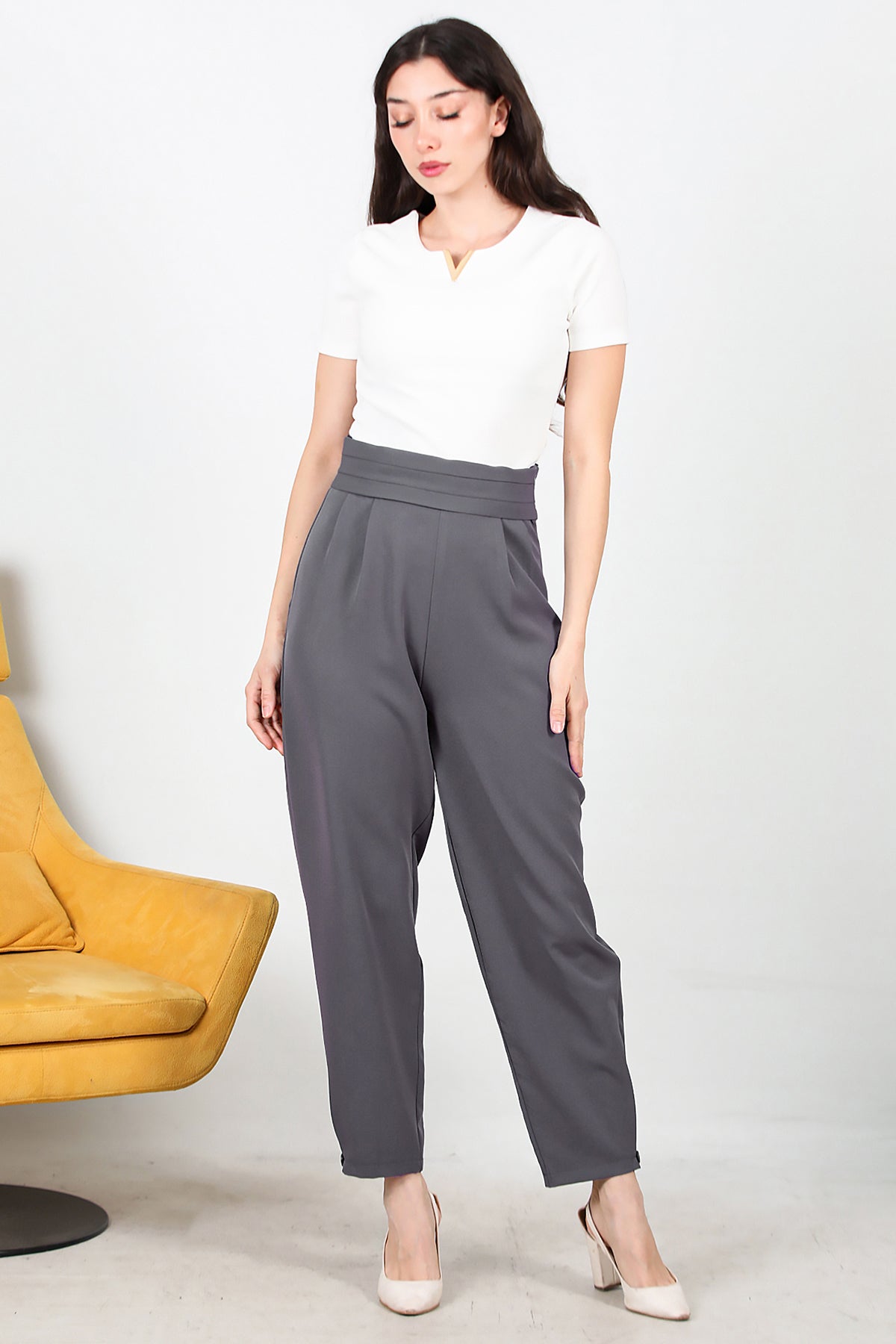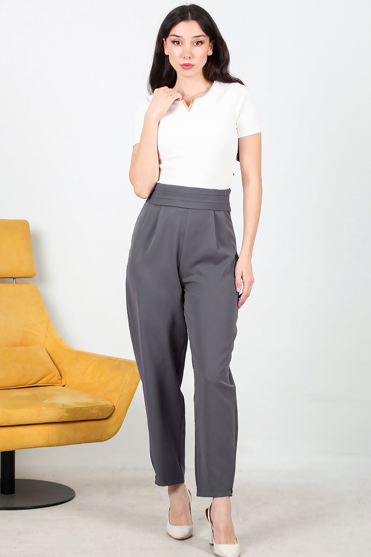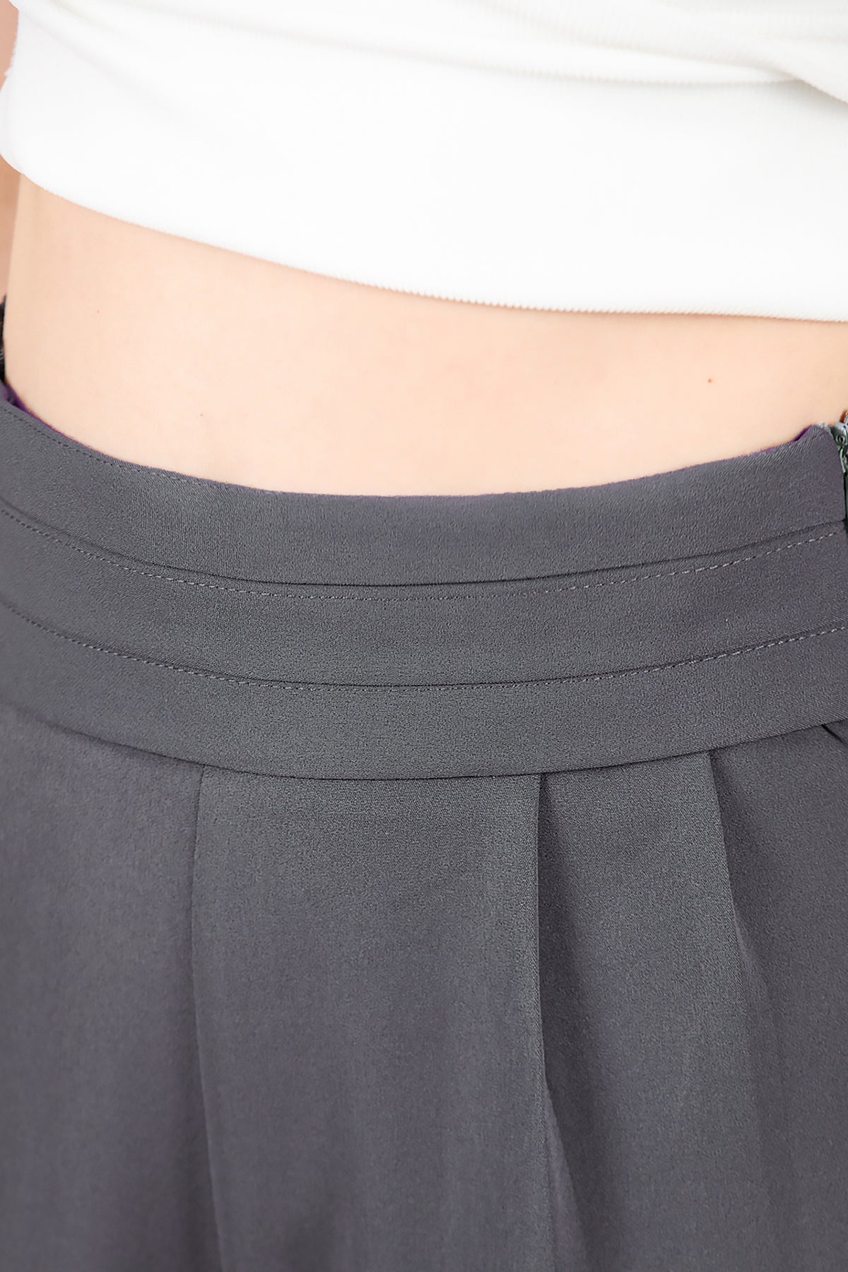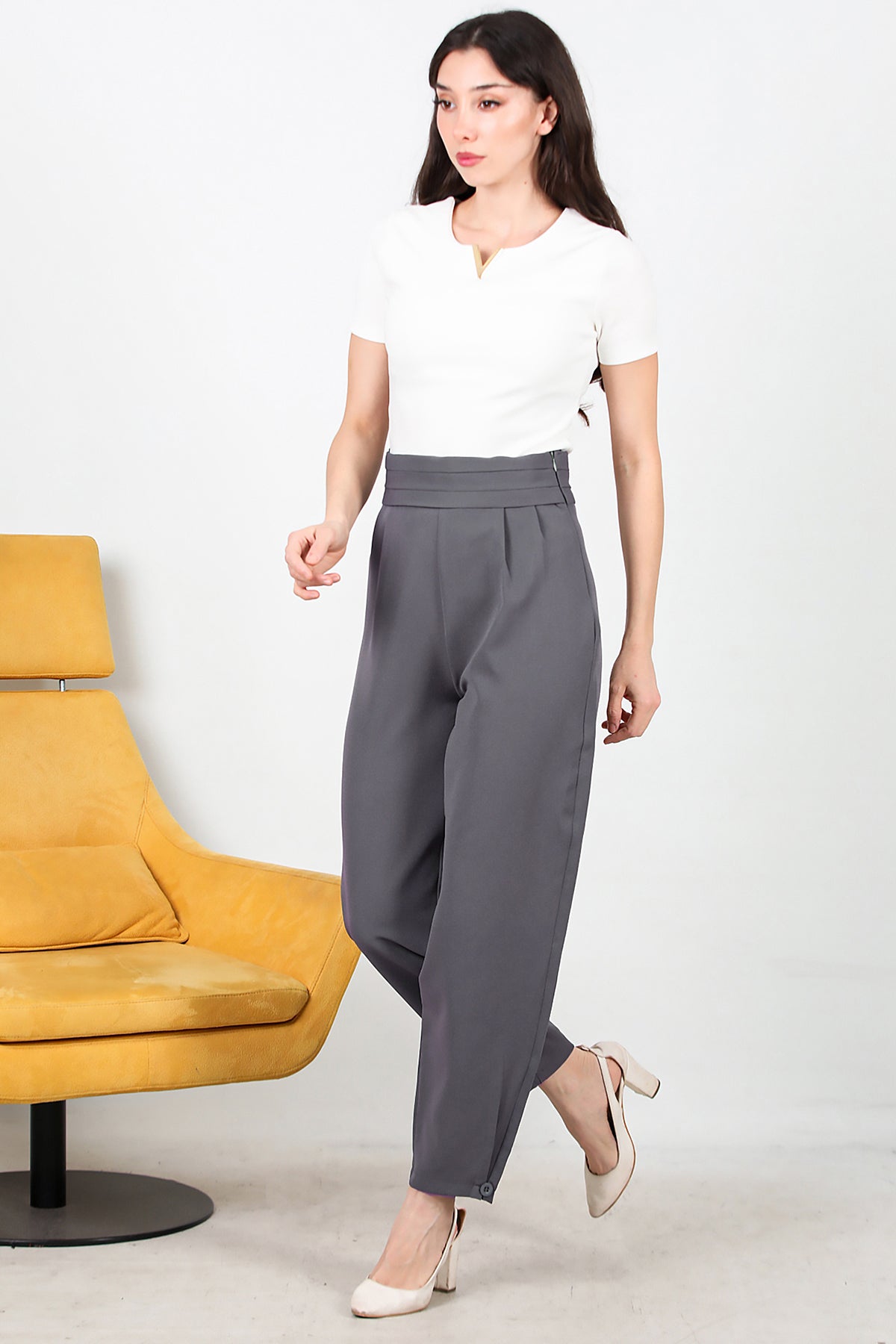 Kadın Beli Pileli Paça Düğmeli Pantolon Füme