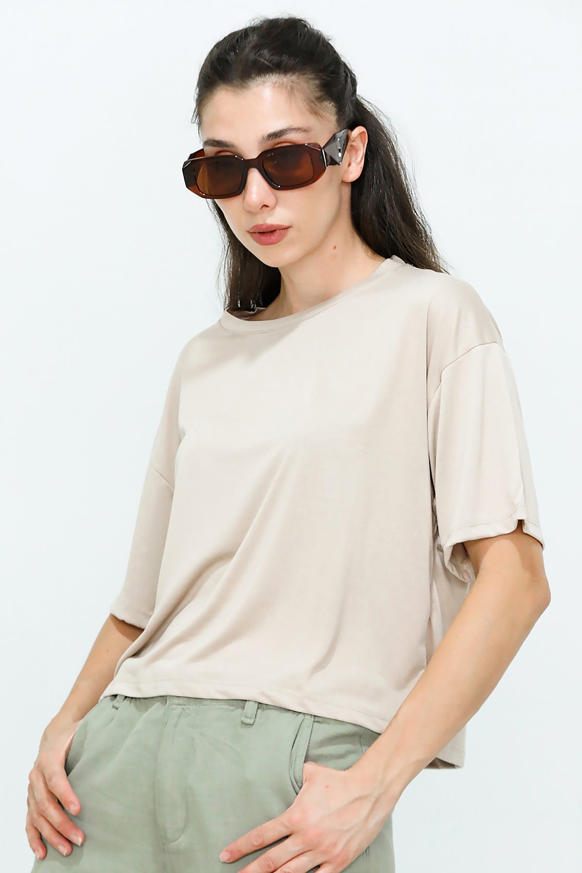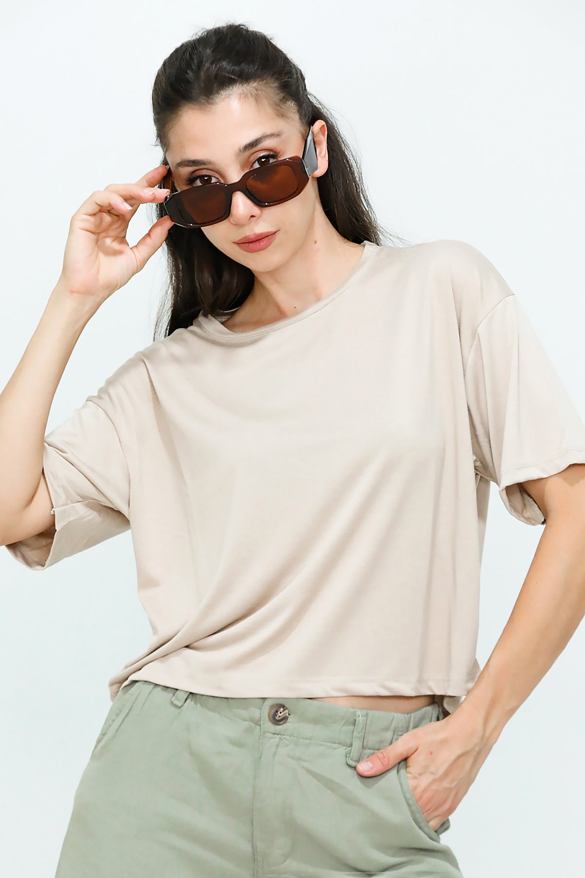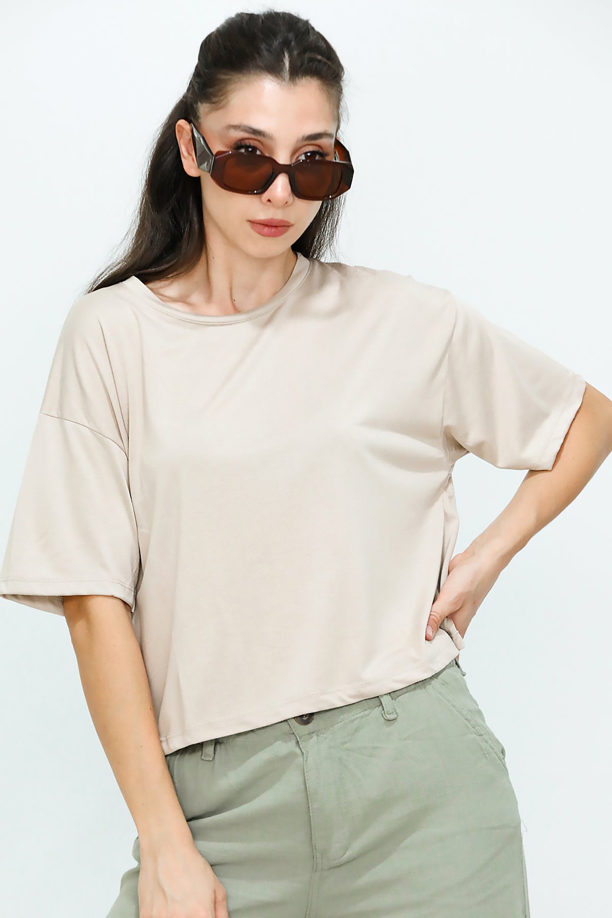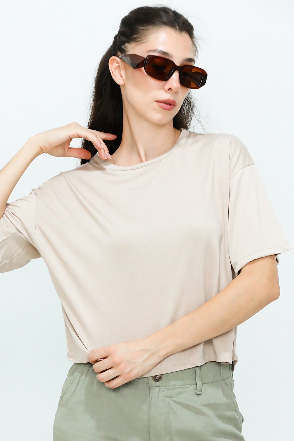 Kadın Bisiklet Yaka Kısa T-shirt Bej
