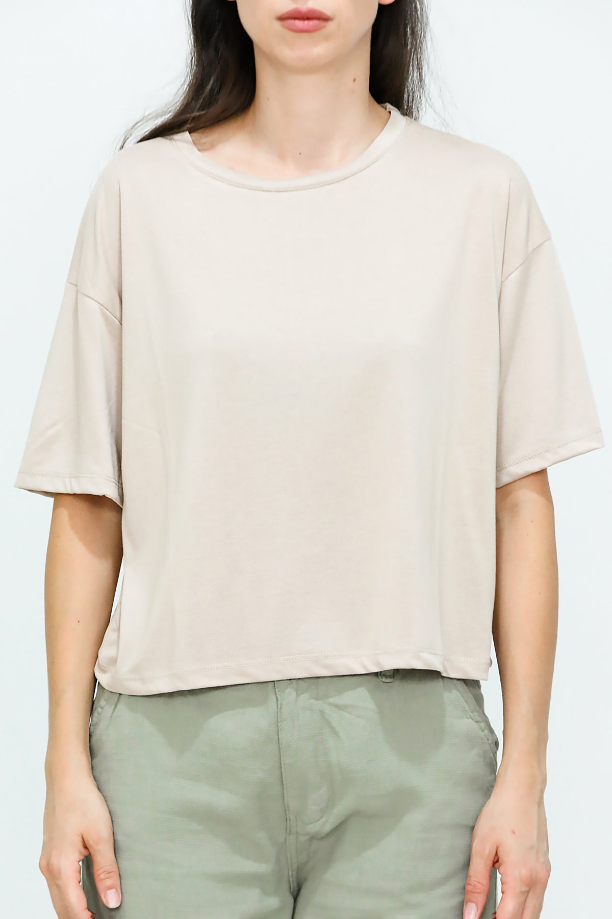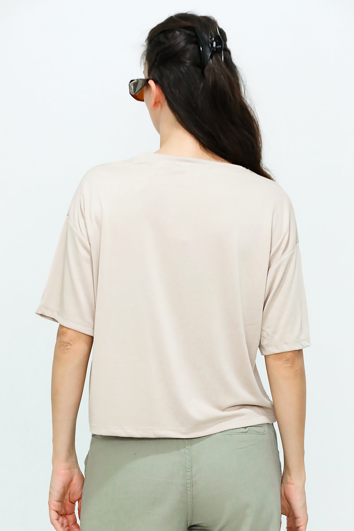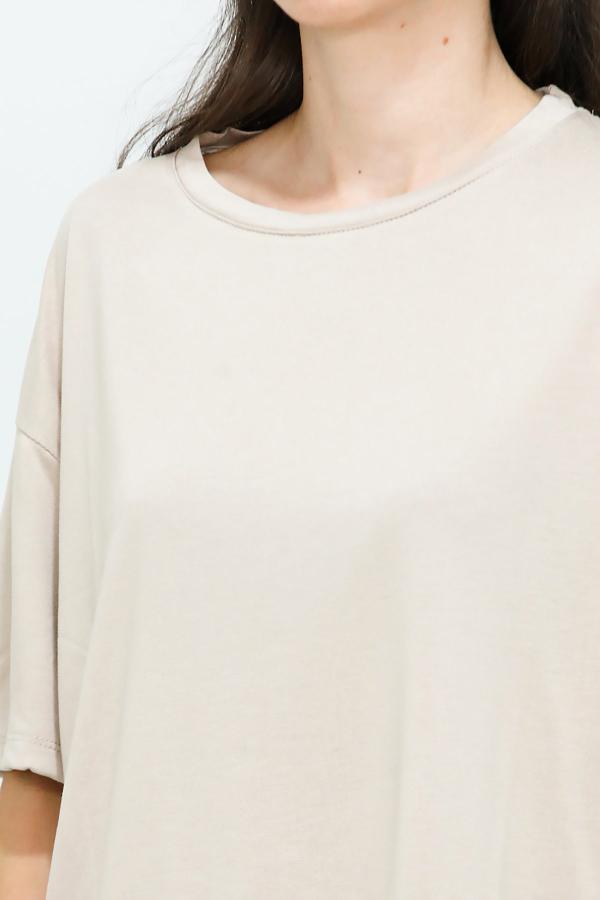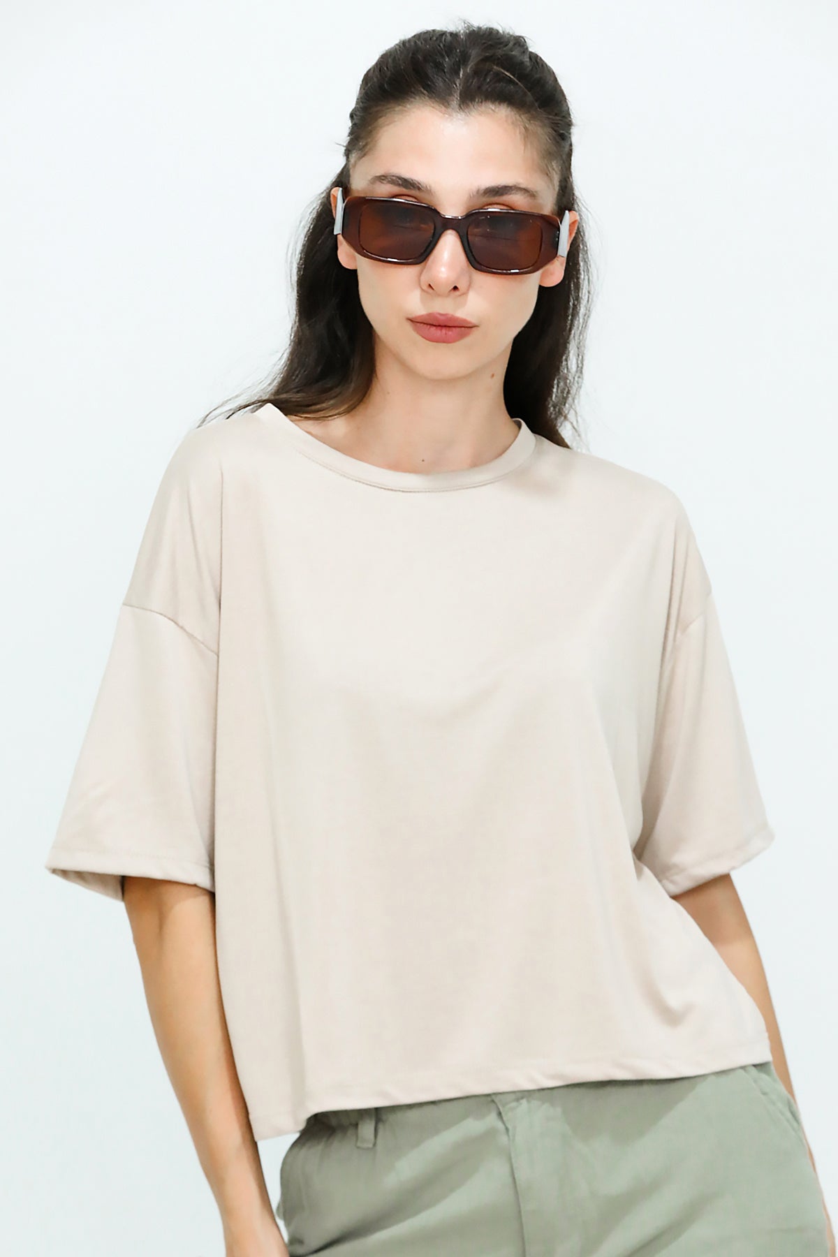 Kadın Bisiklet Yaka Kısa T-shirt Bej