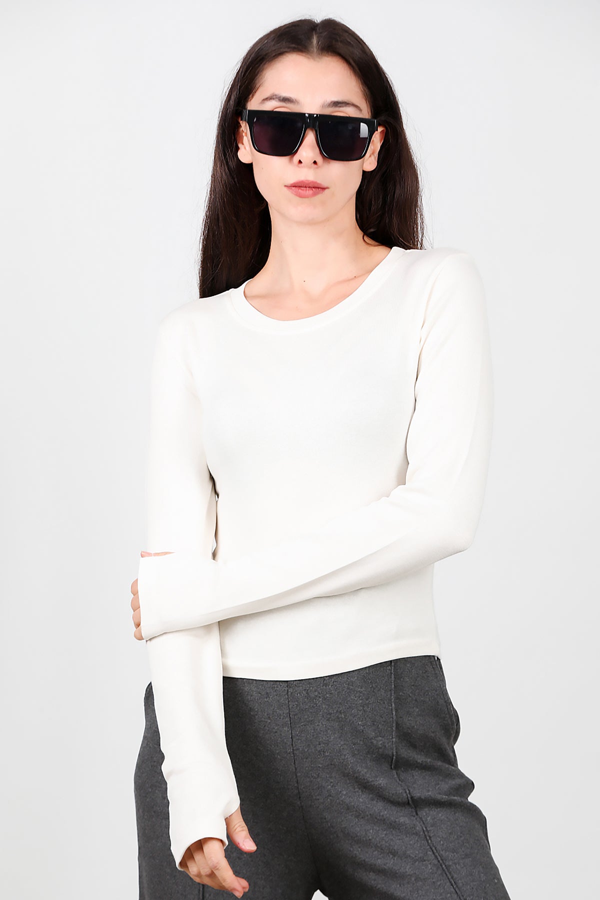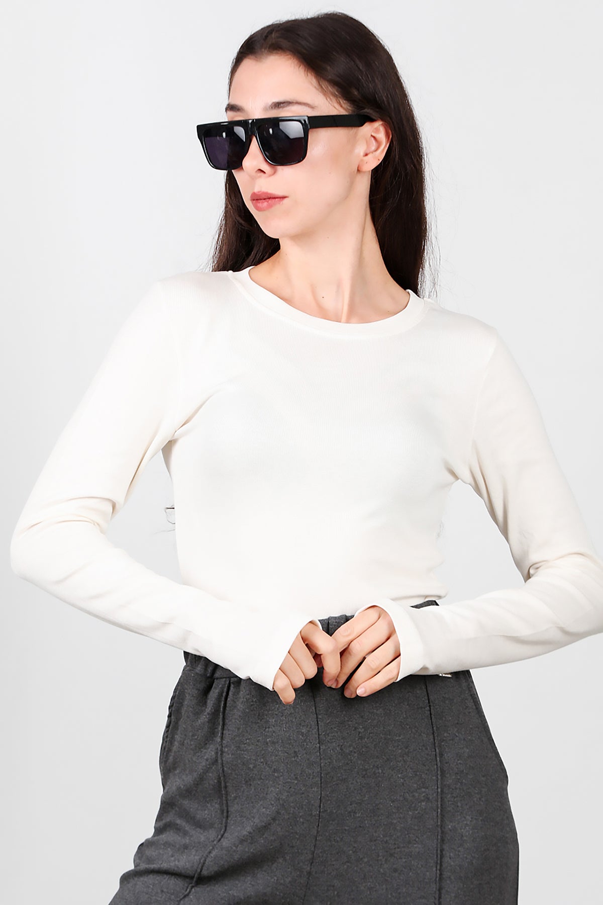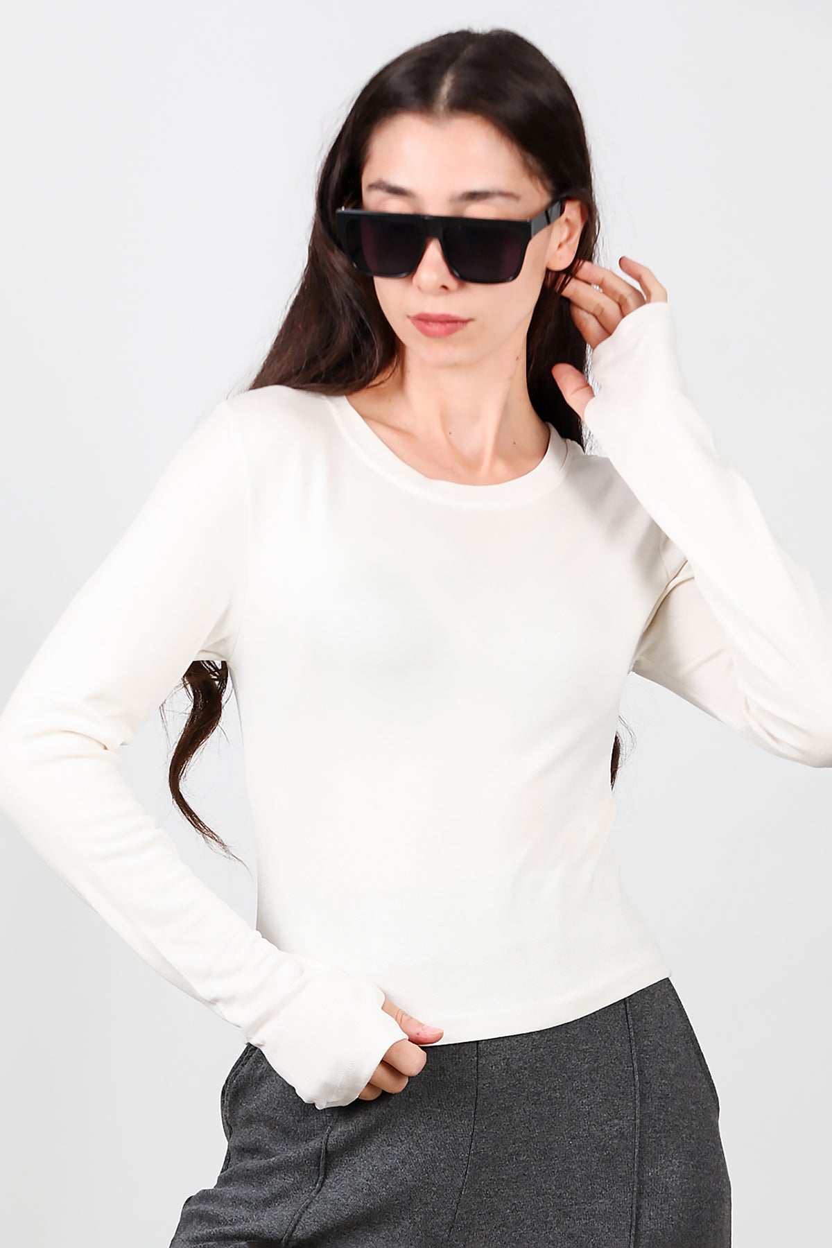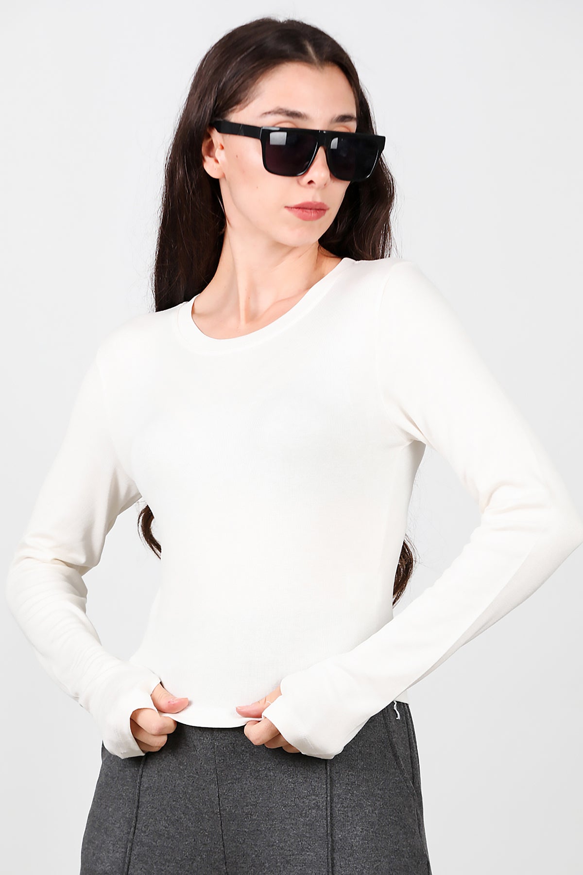 Kadın Bisiklet Yaka Parmak Geçirmeli Bluz Ekru