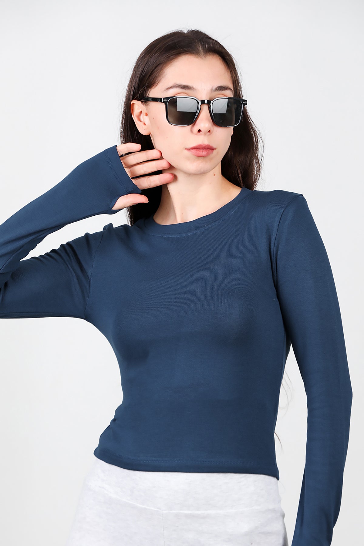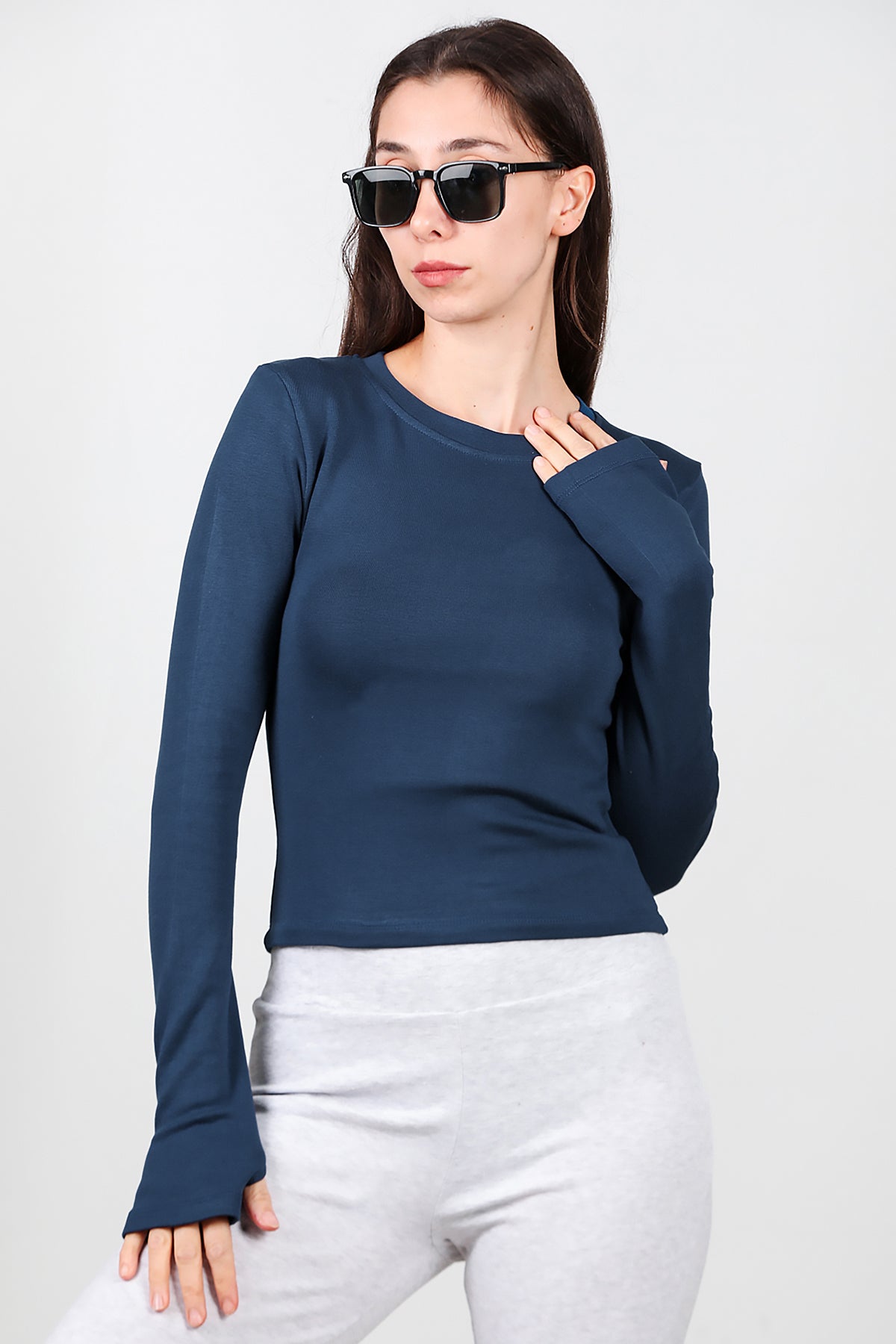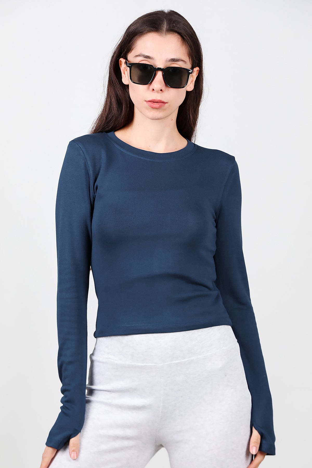Kadın Bisiklet Yaka Parmak Geçirmeli Bluz Lacivert