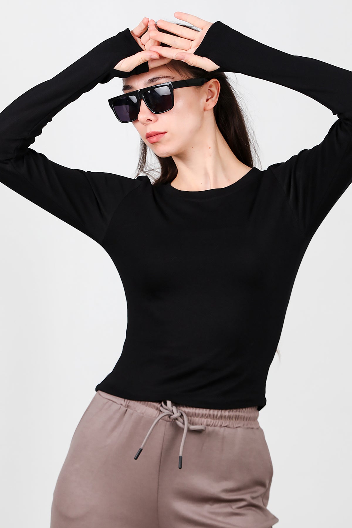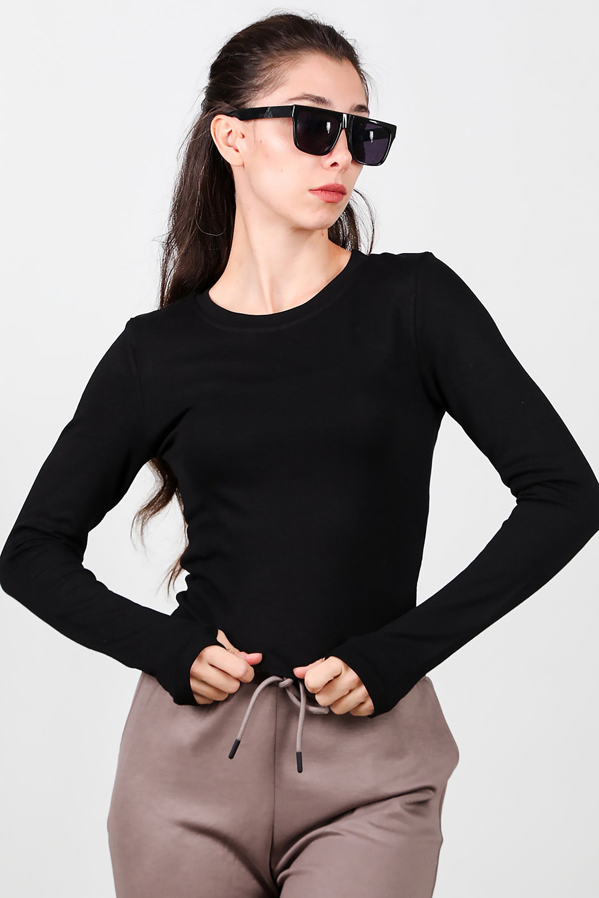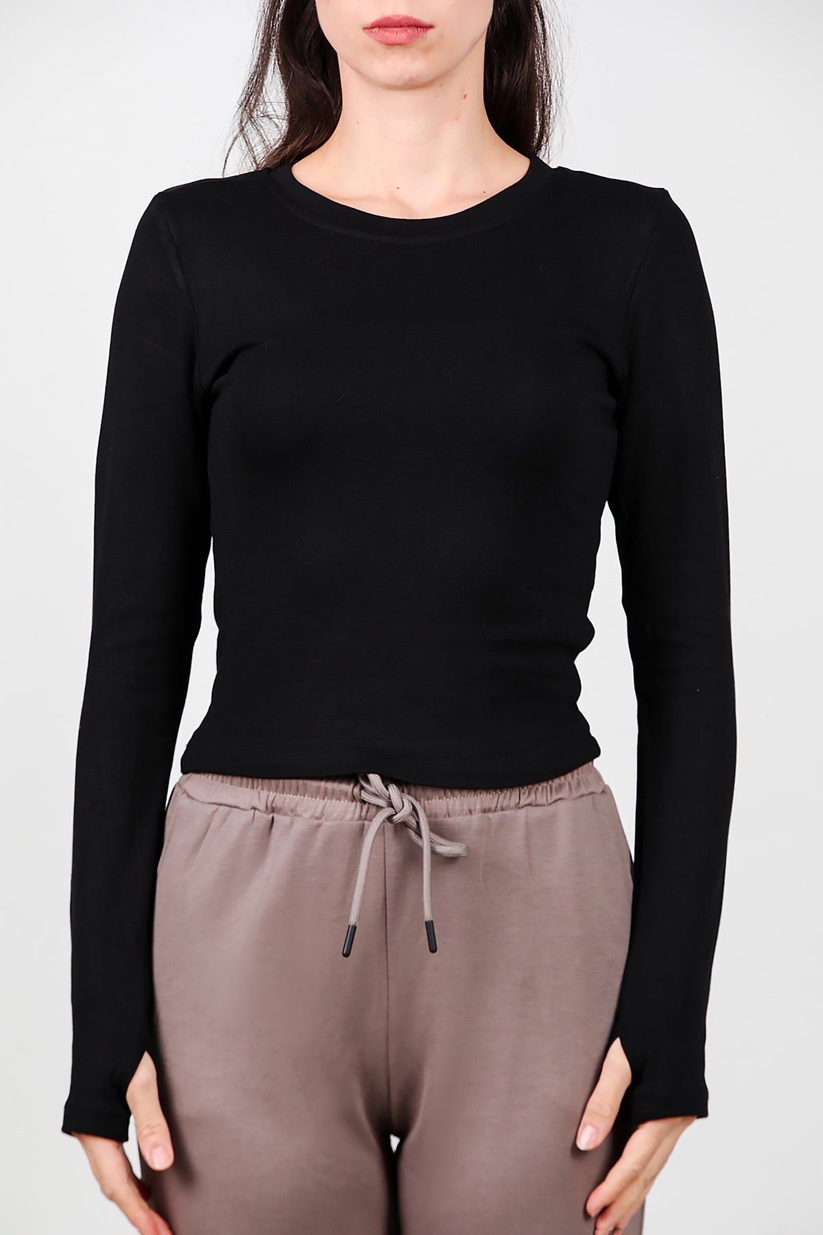 Kadın Bisiklet Yaka Parmak Geçirmeli Bluz Siyah