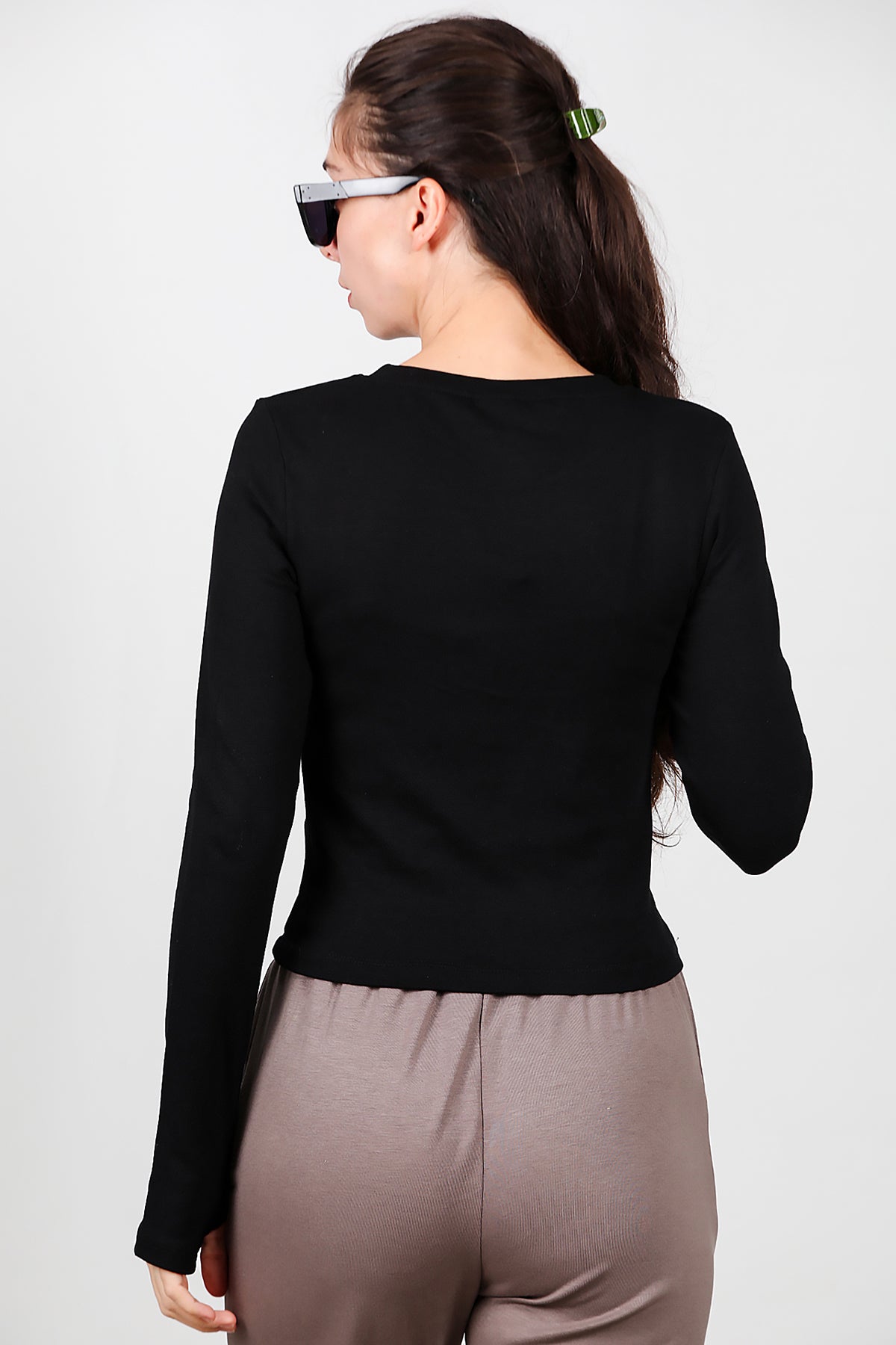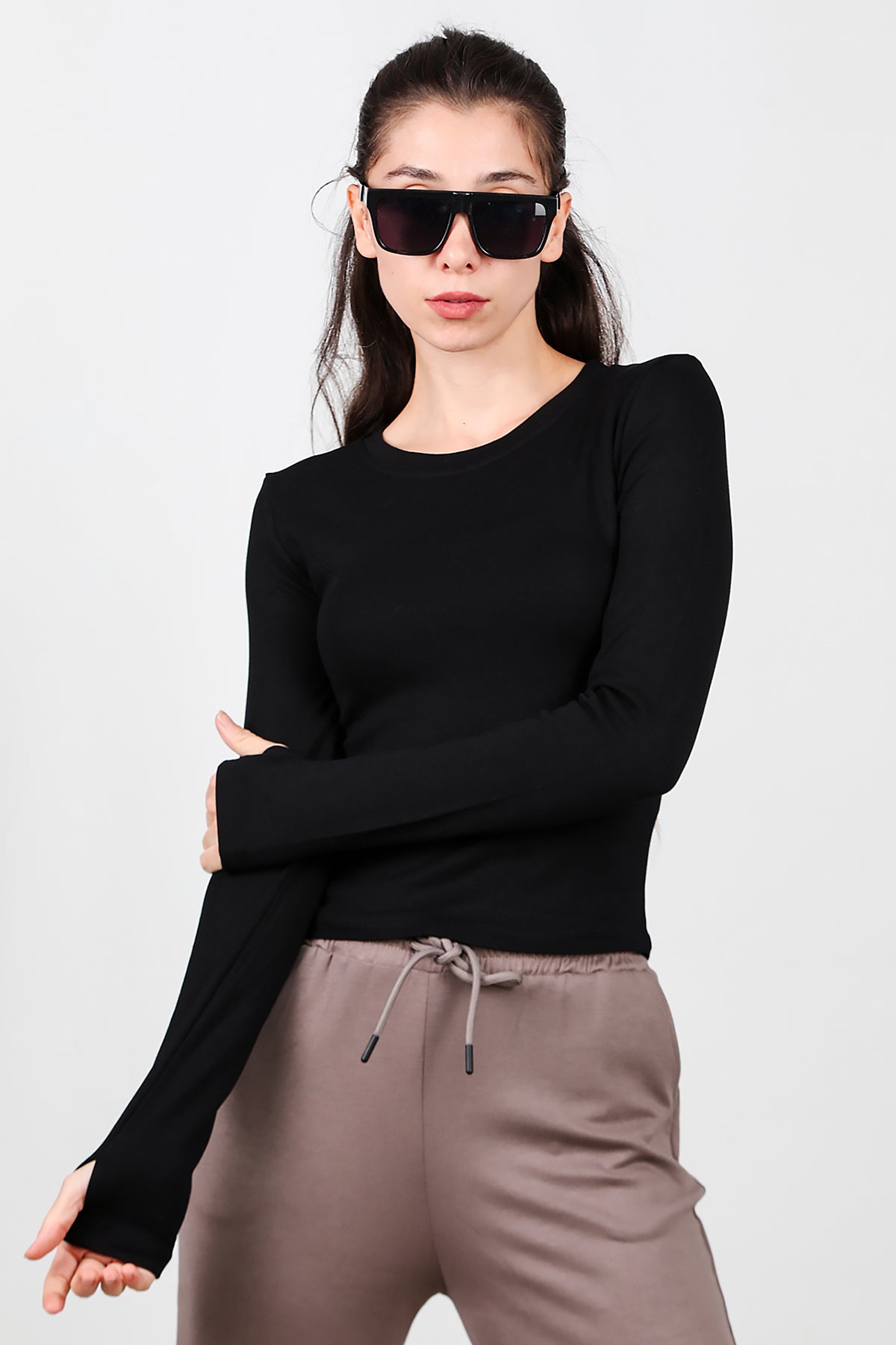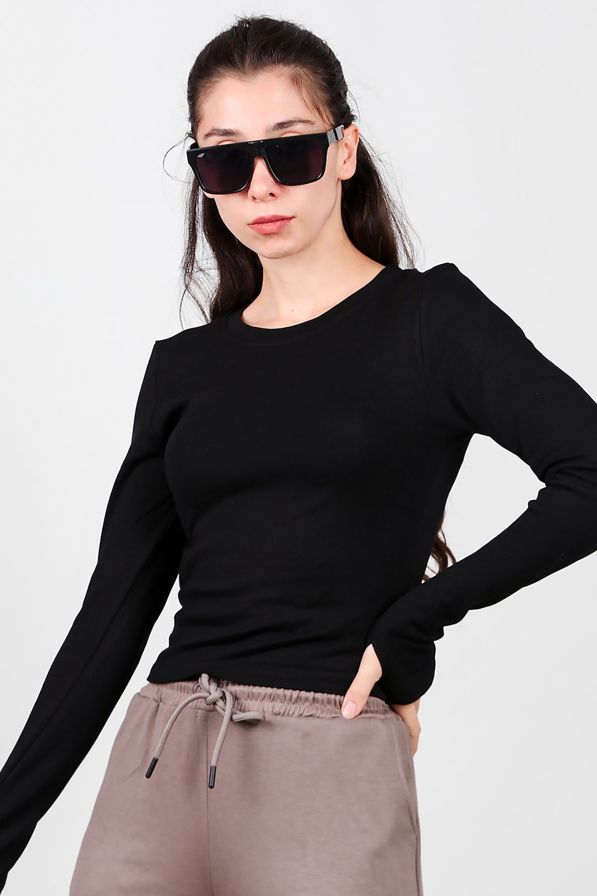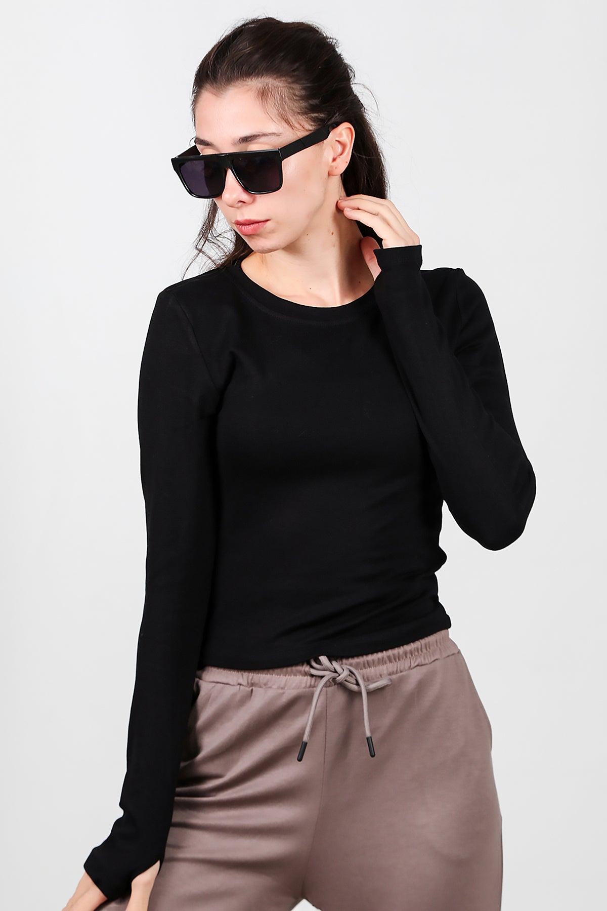 Kadın Bisiklet Yaka Parmak Geçirmeli Bluz Siyah