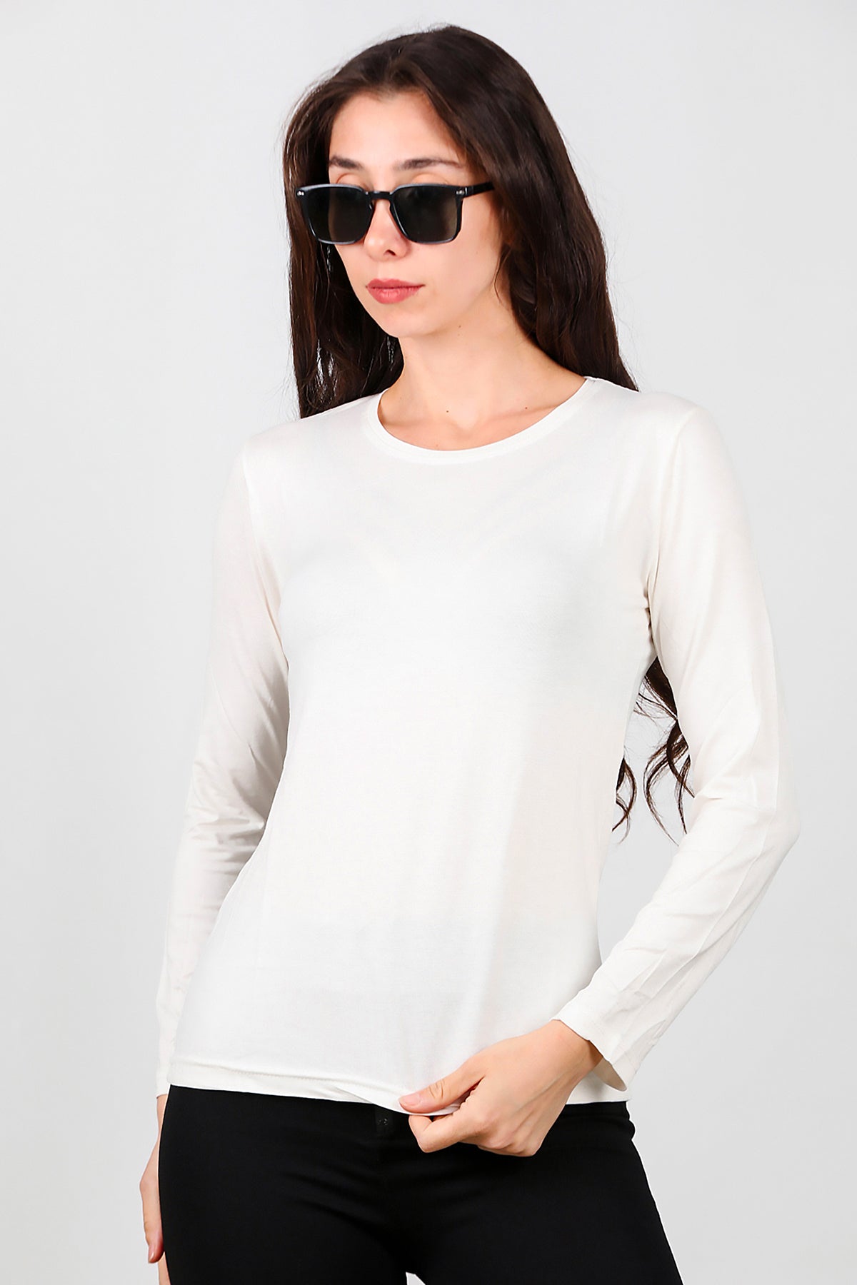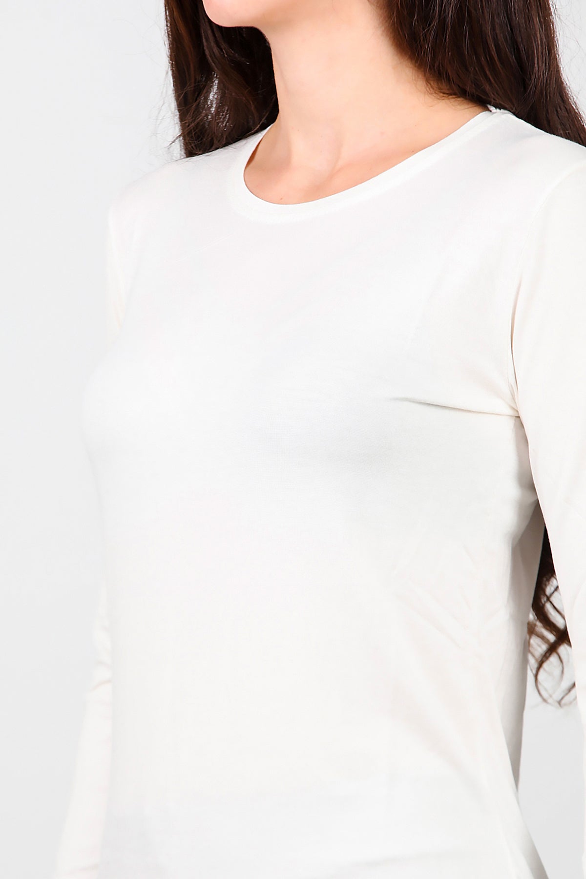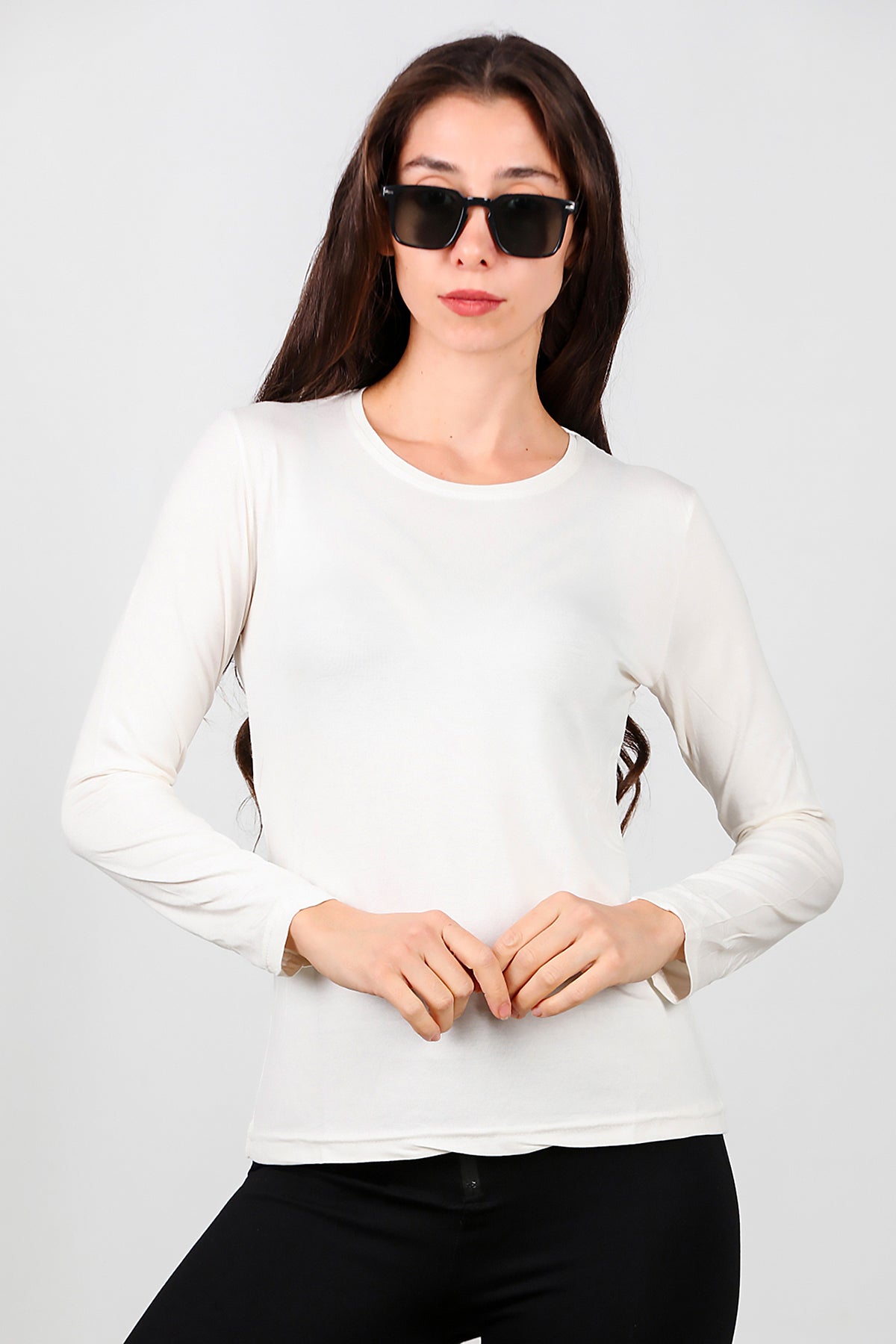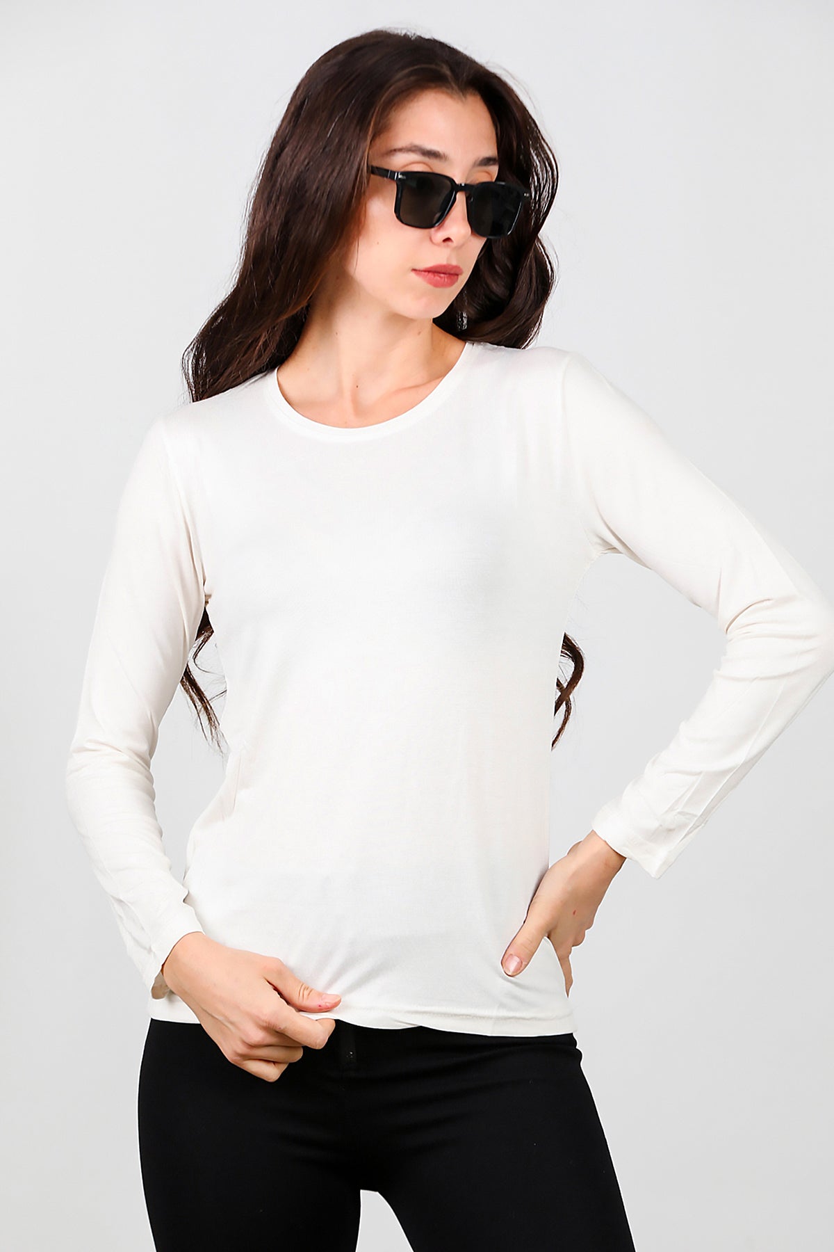 Kadın Bisiklet Yaka Uzun Kol Penye Bluz Ekru