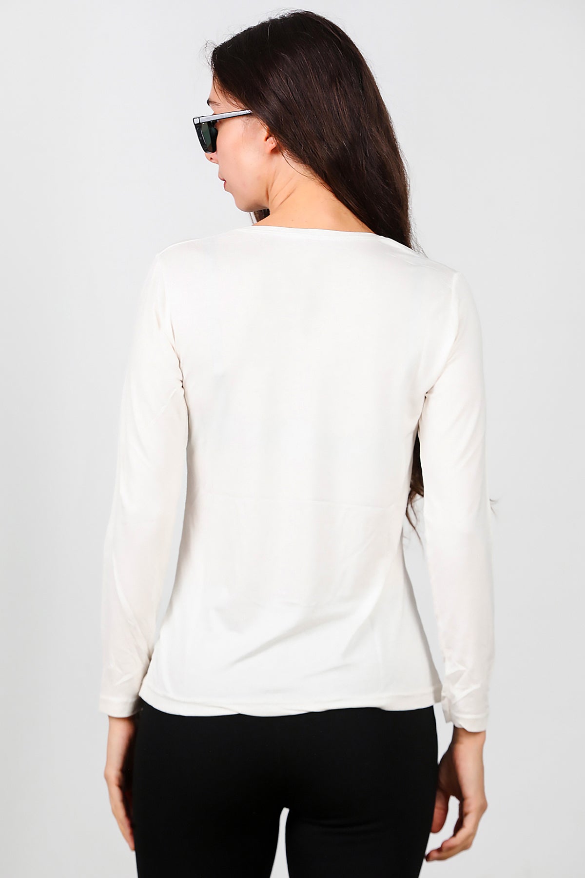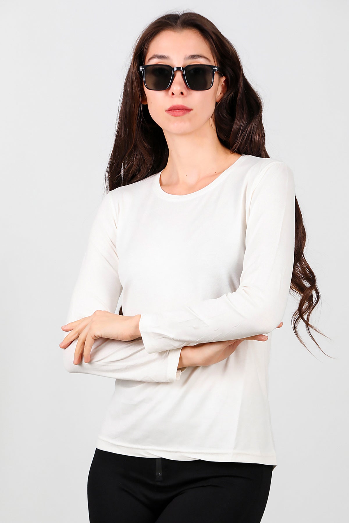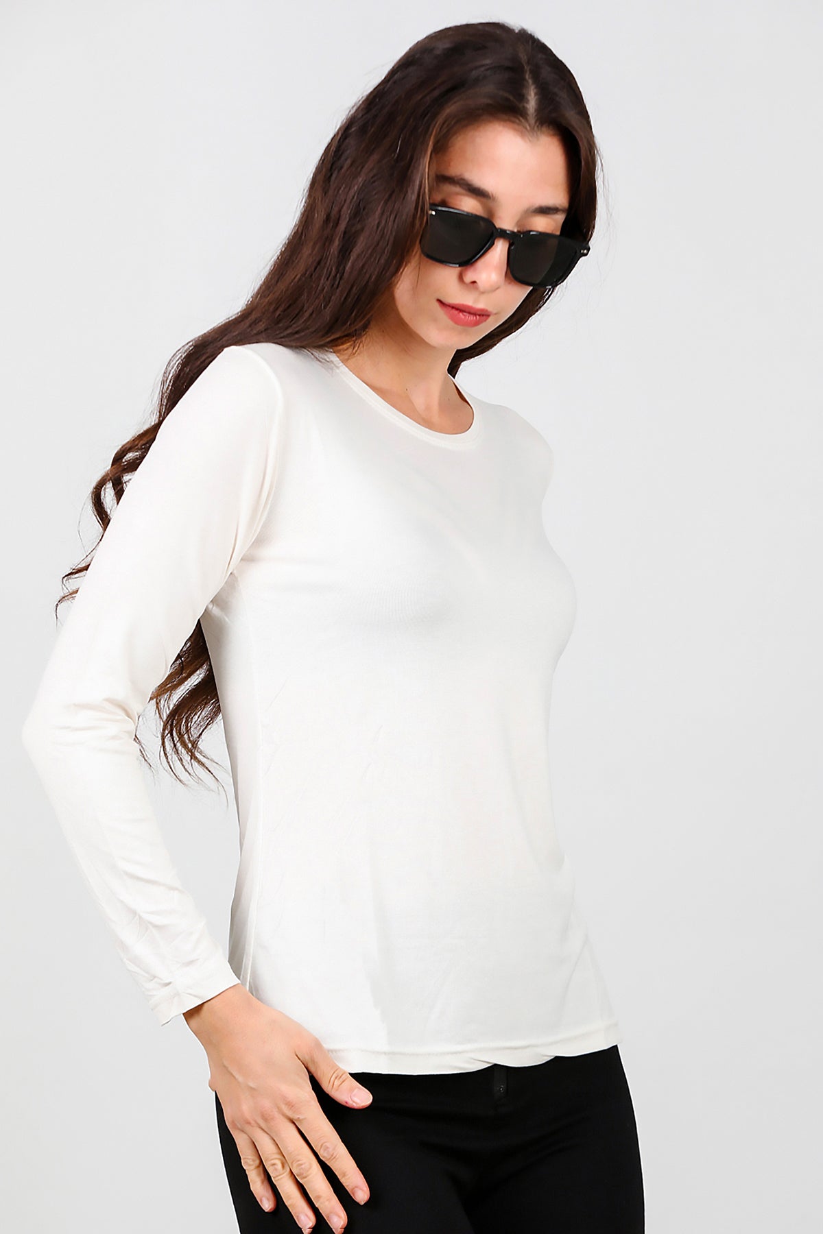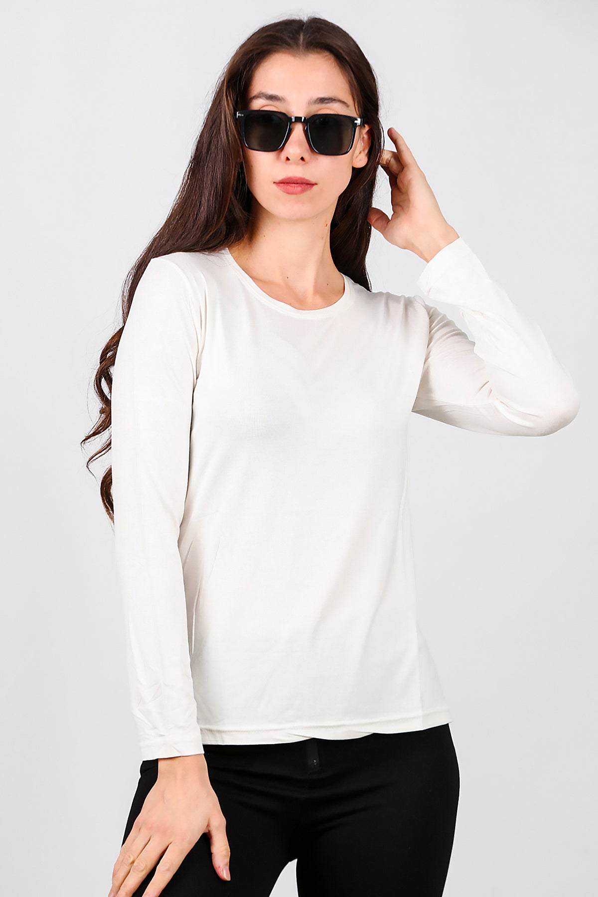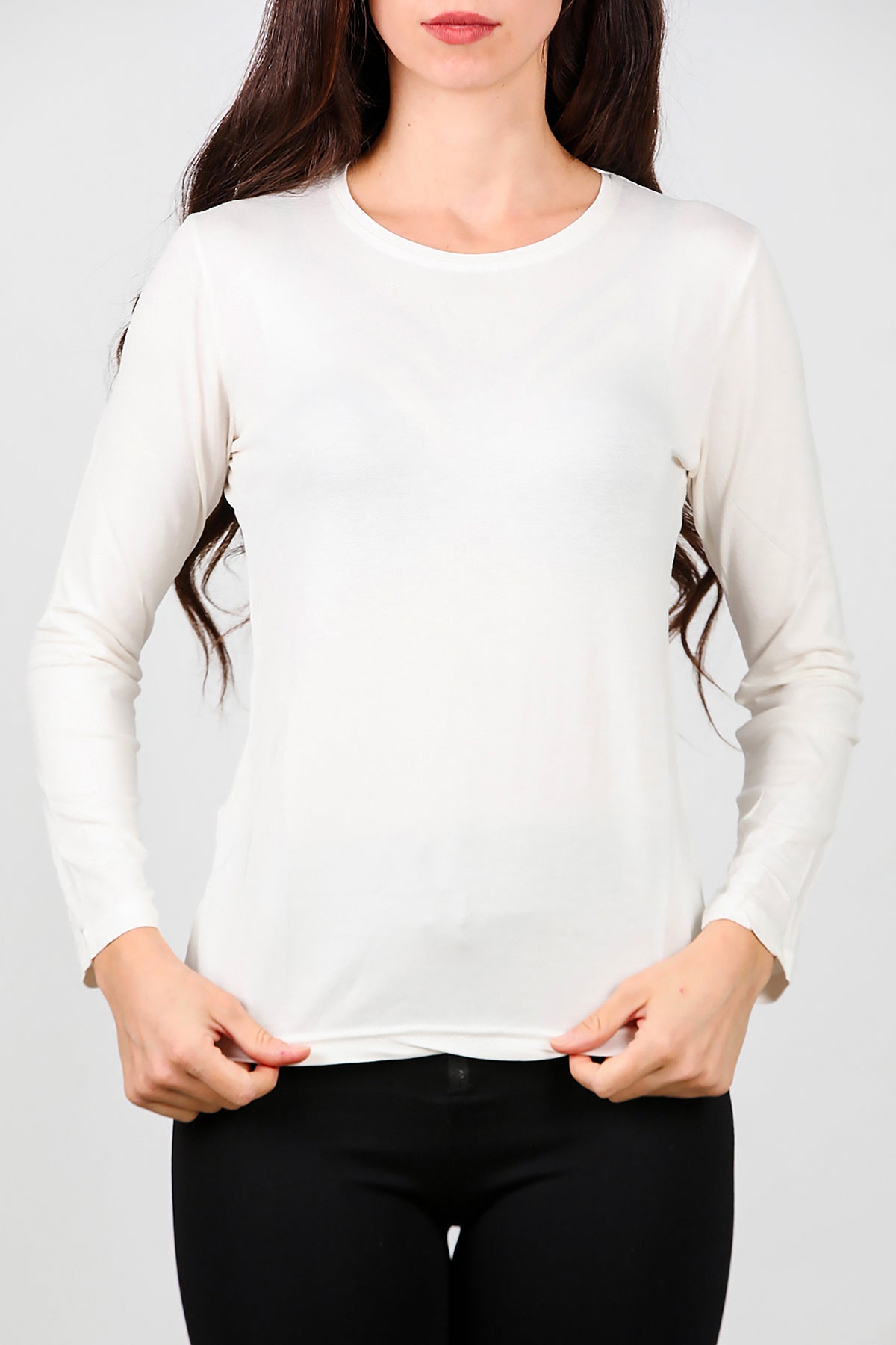 Kadın Bisiklet Yaka Uzun Kol Penye Bluz Ekru