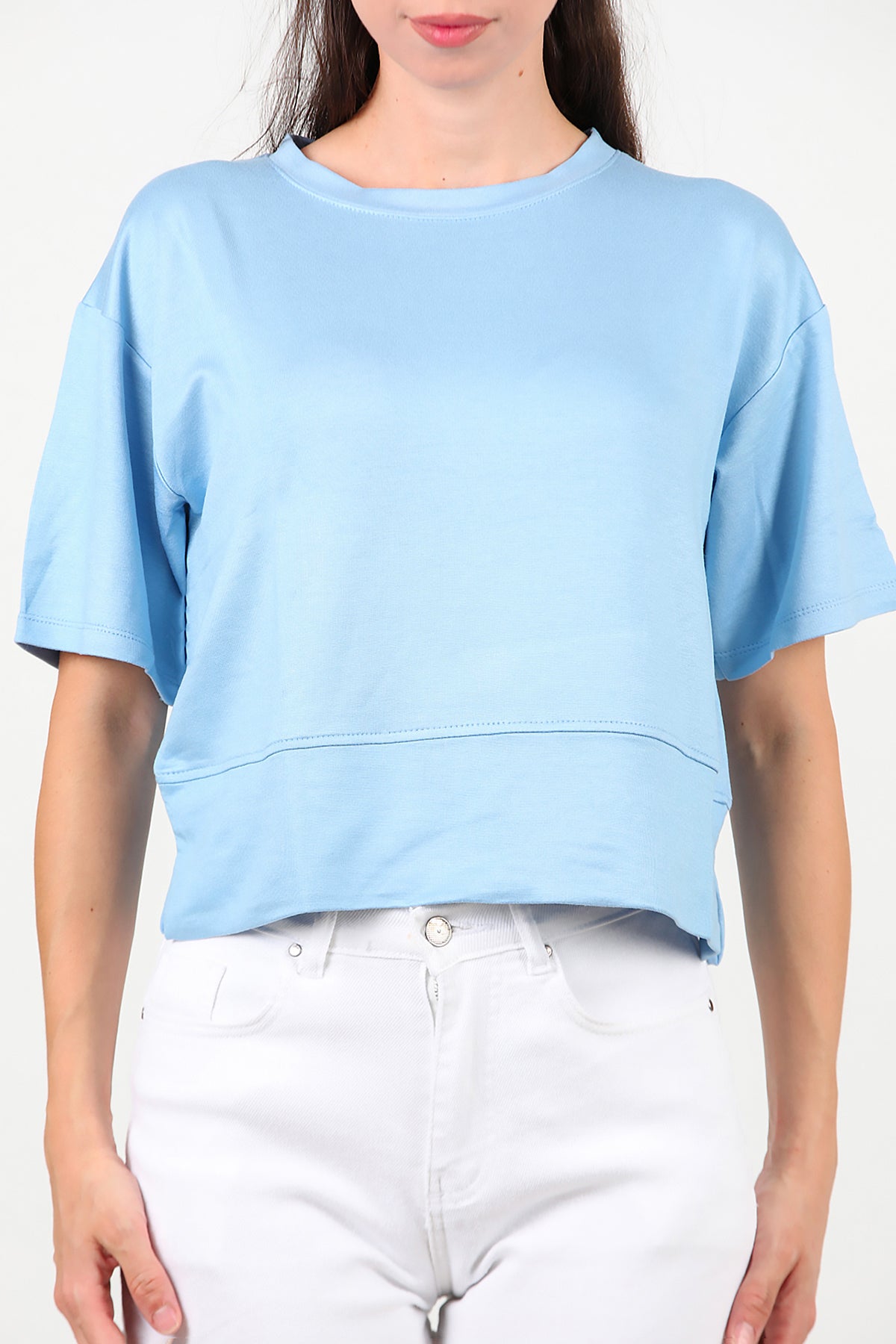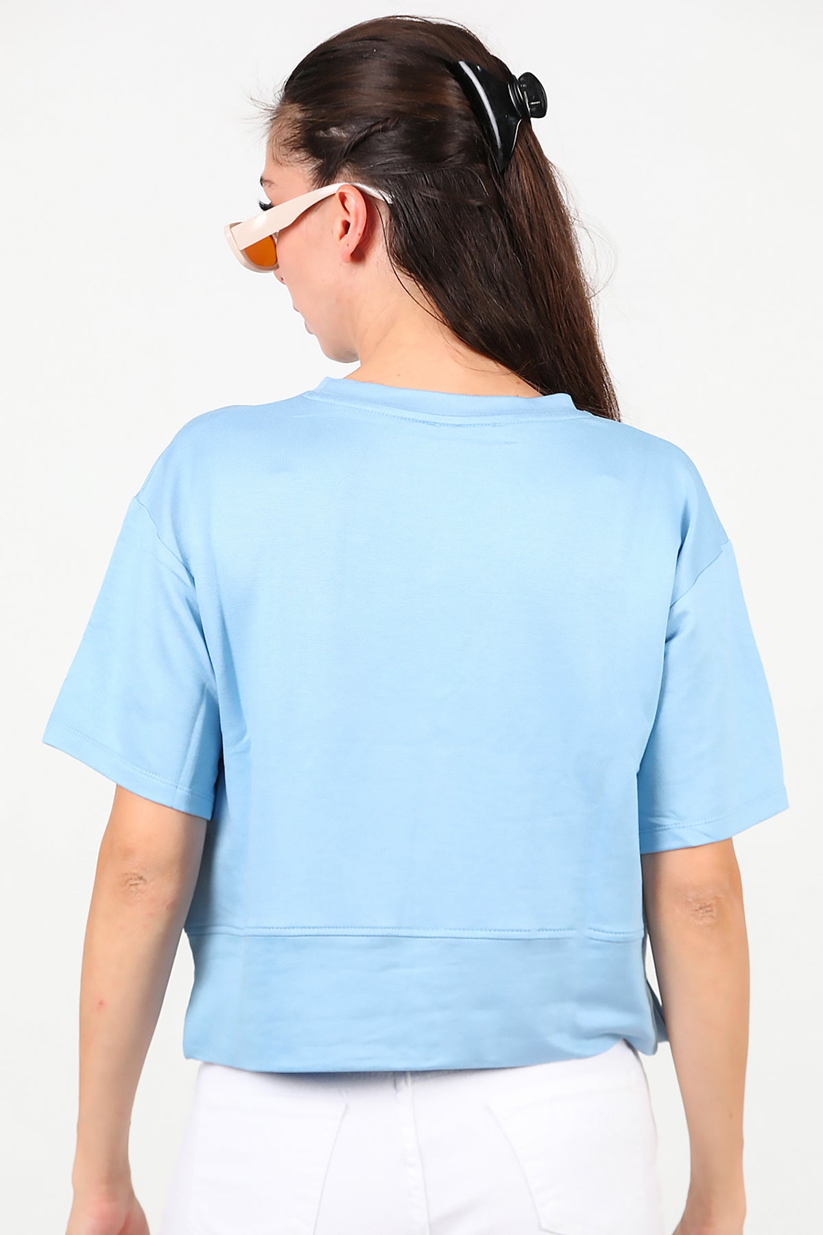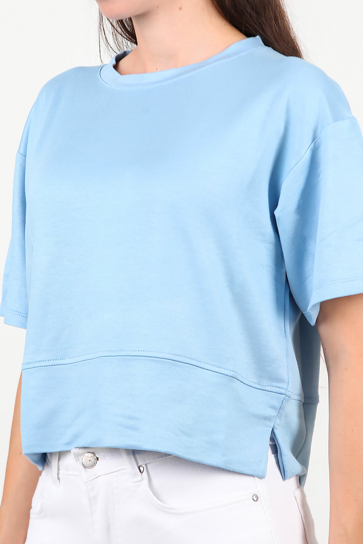 Kadın Bisiklet Yaka Yan Yırtmaçlı T-shırt Mavi