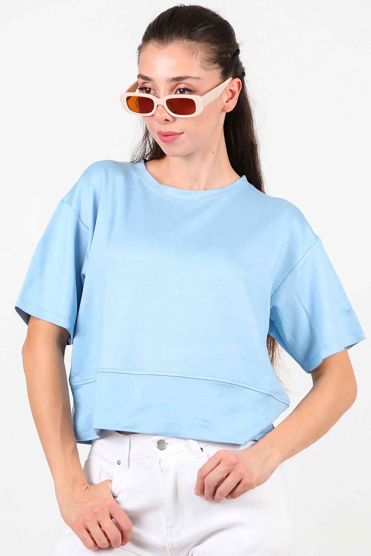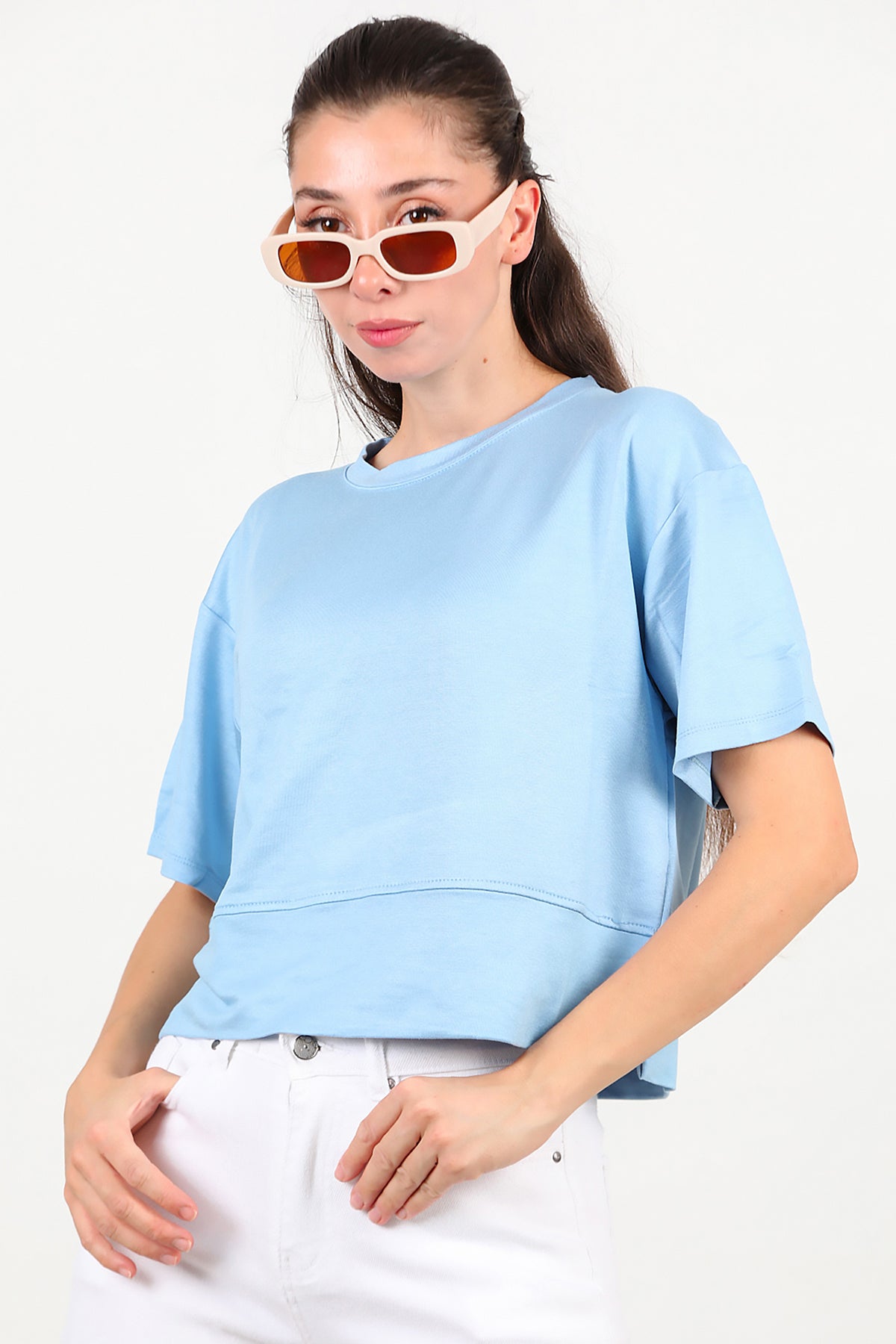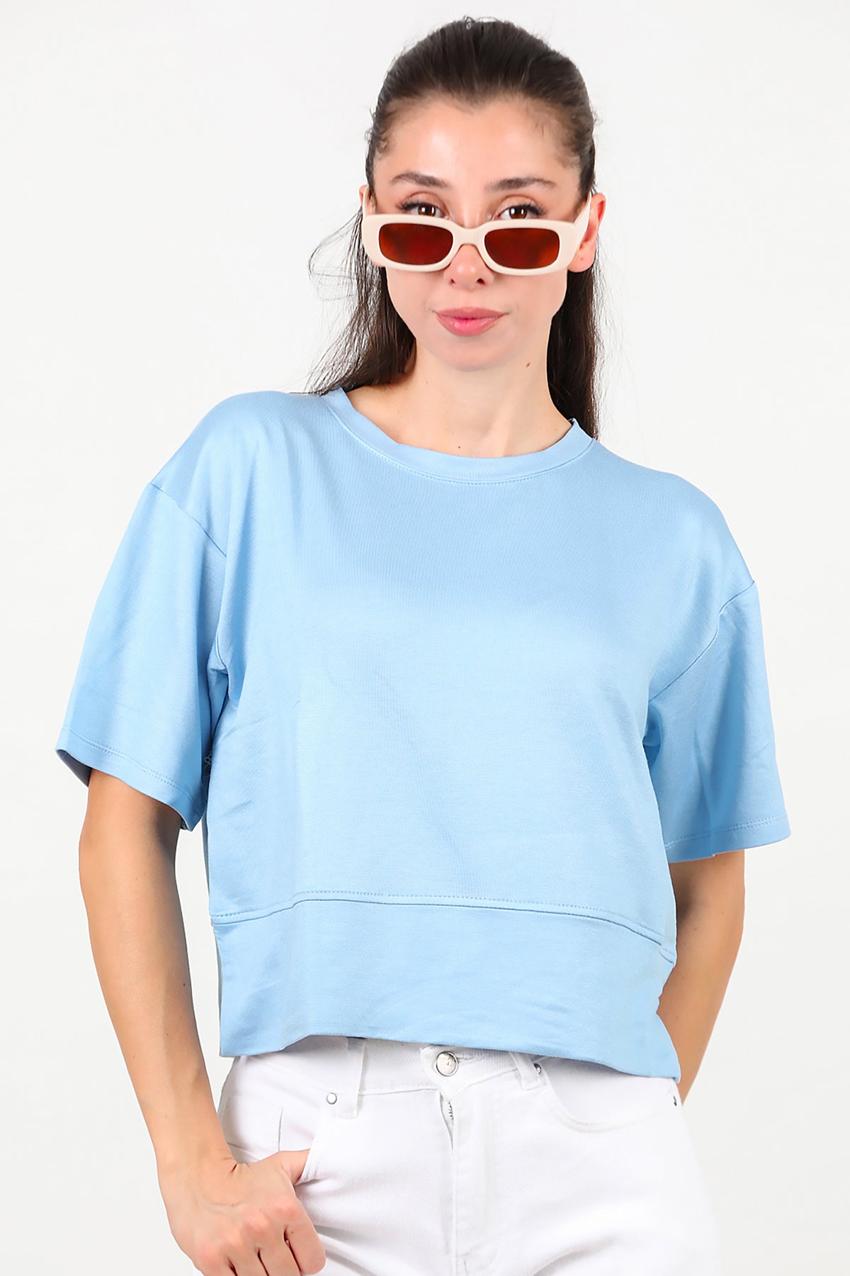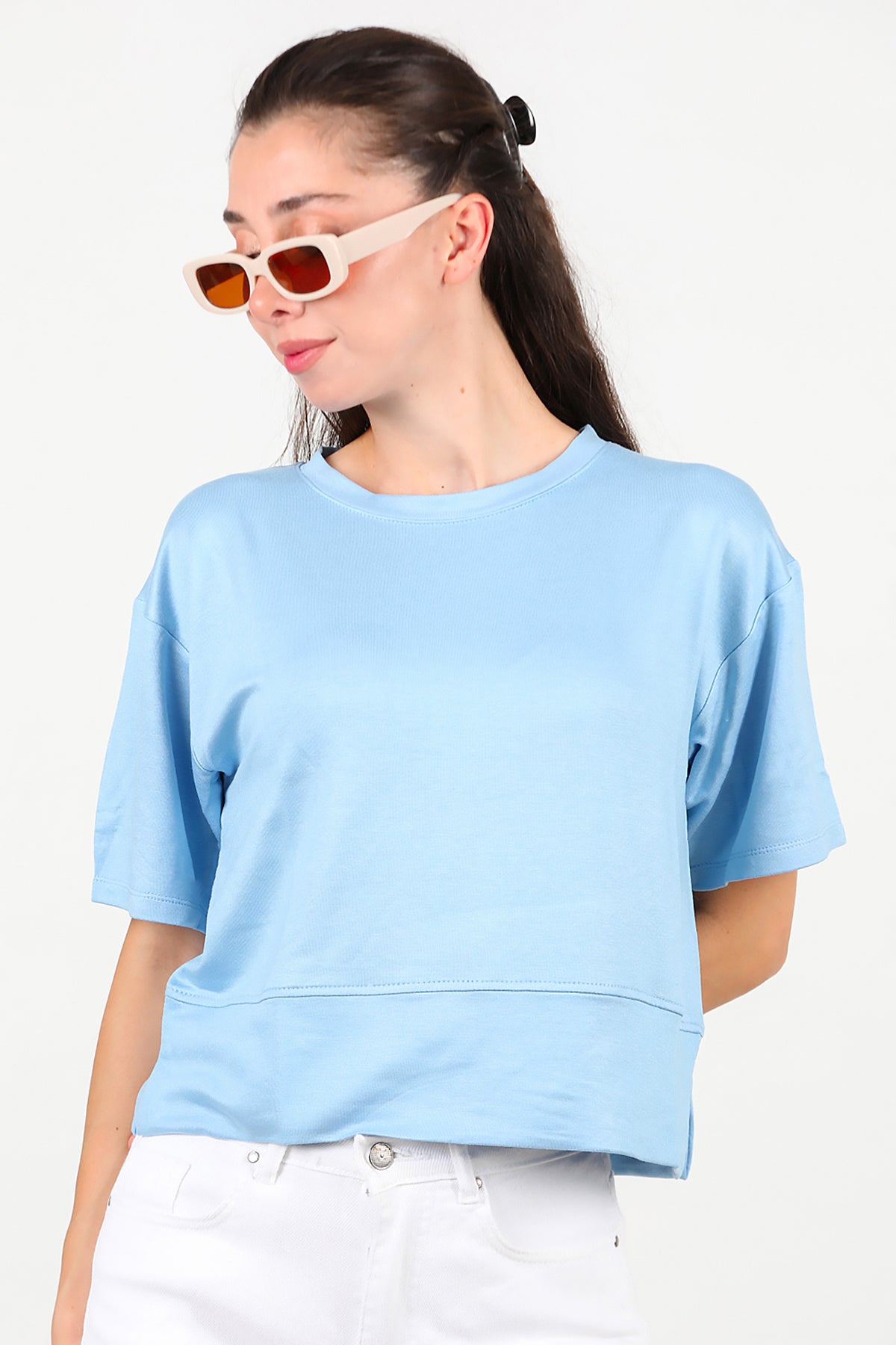 Kadın Bisiklet Yaka Yan Yırtmaçlı T-shırt Mavi