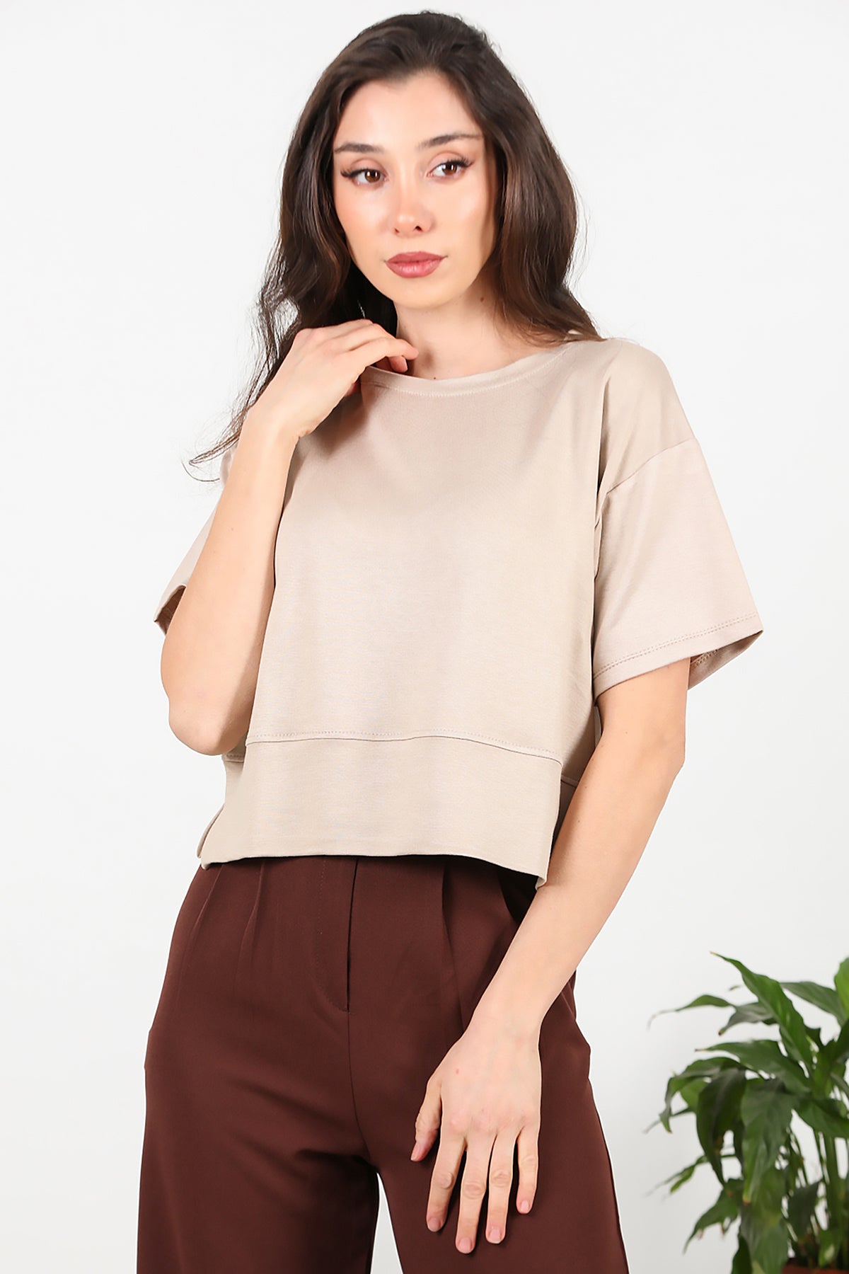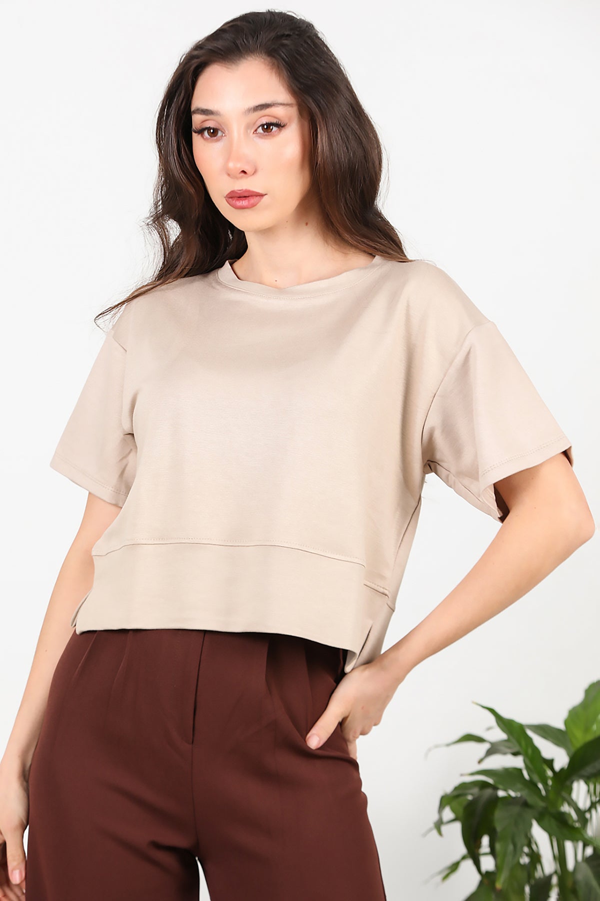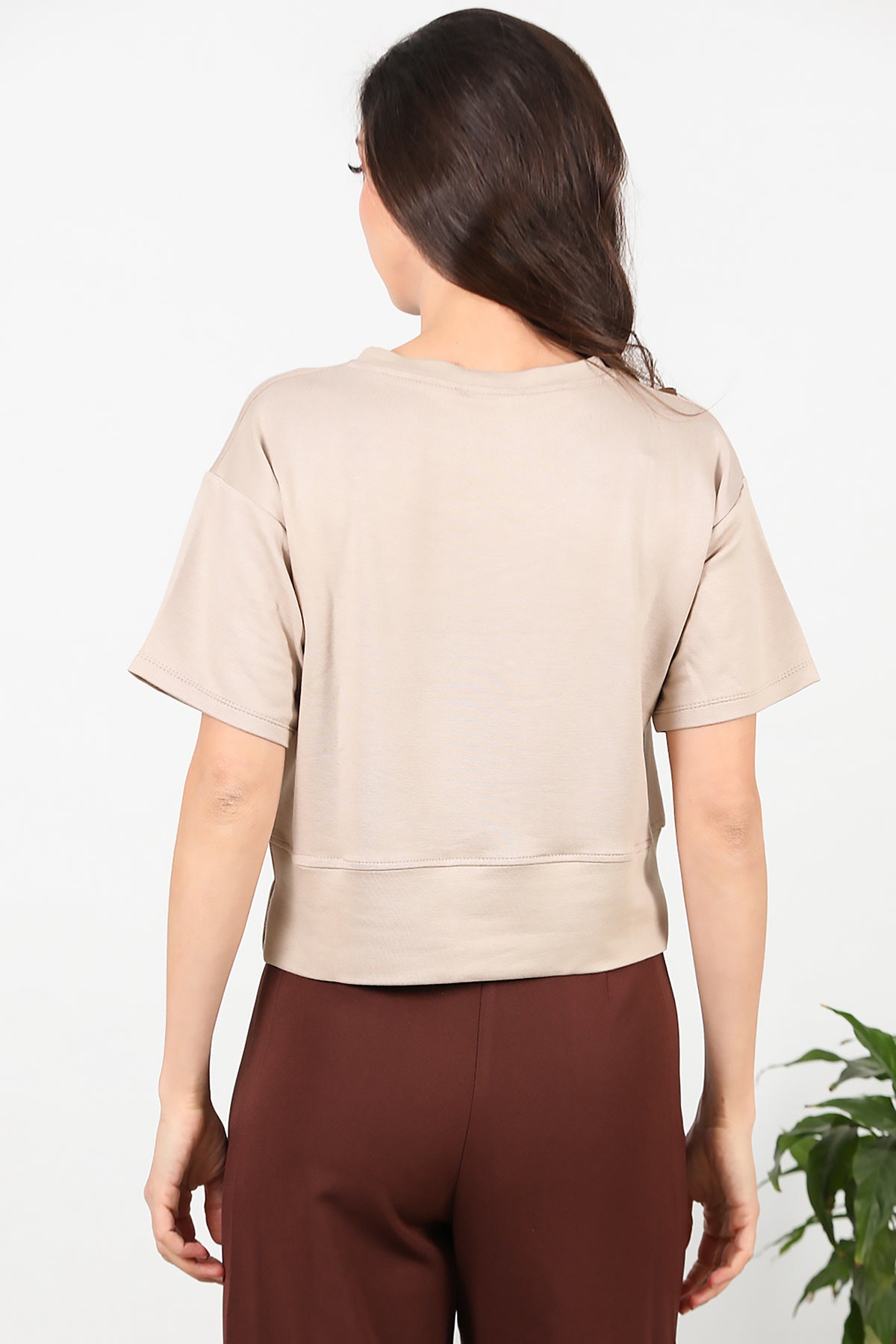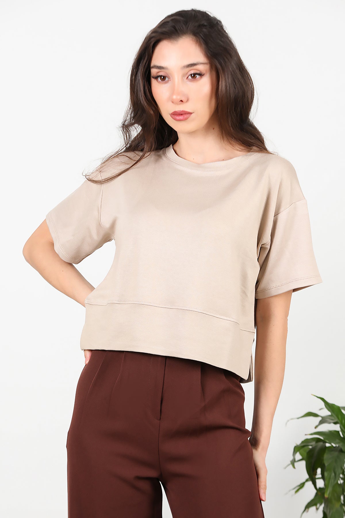 Kadın Bisiklet Yaka Yan Yırtmaçlı T-shırt Vizon