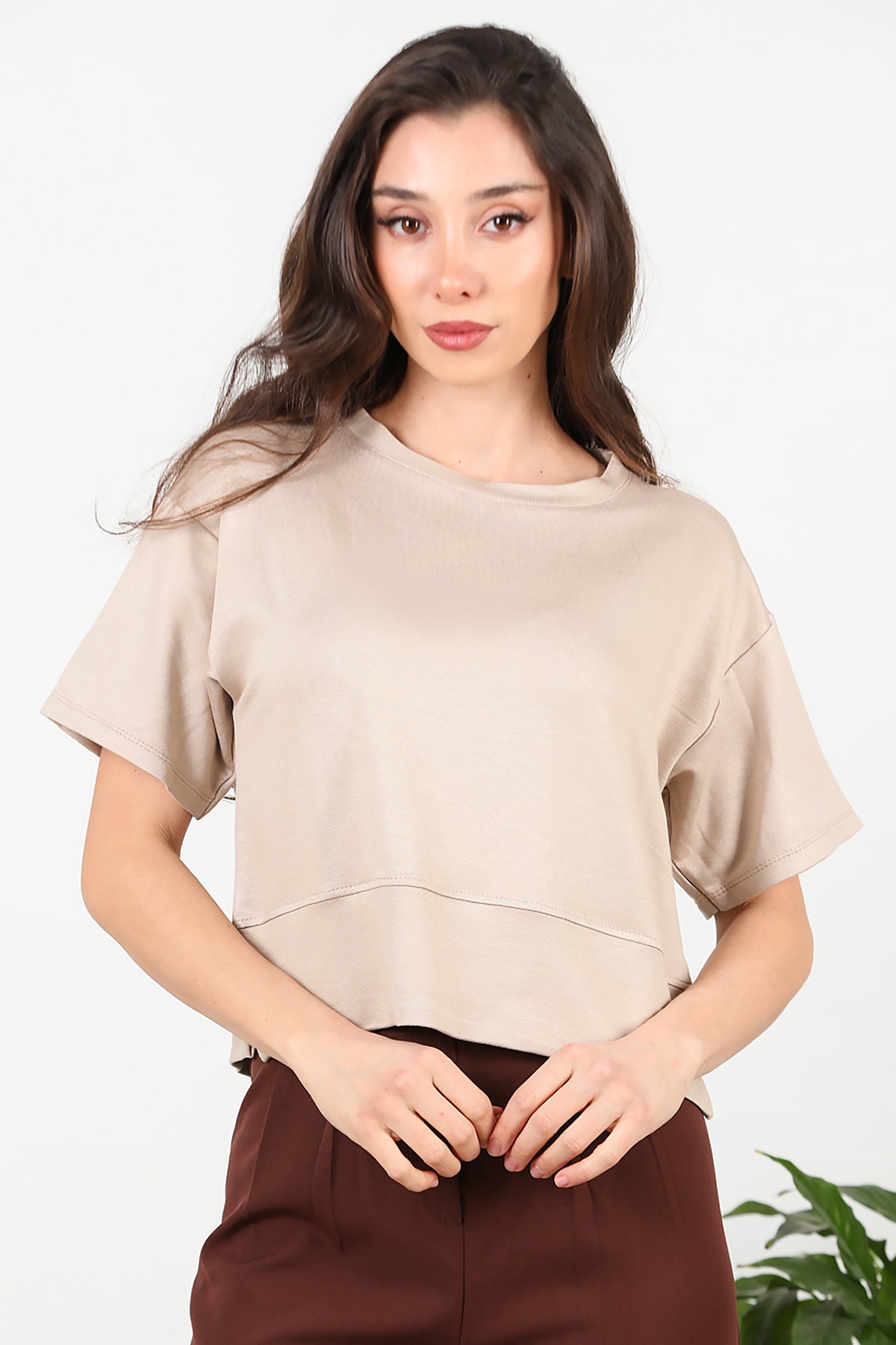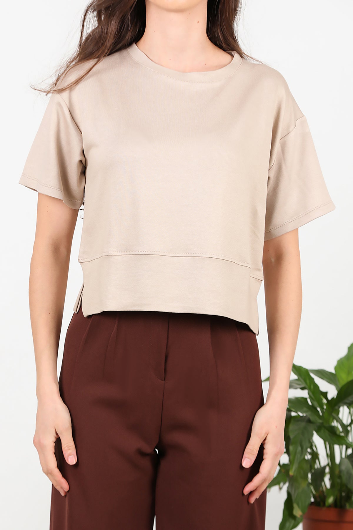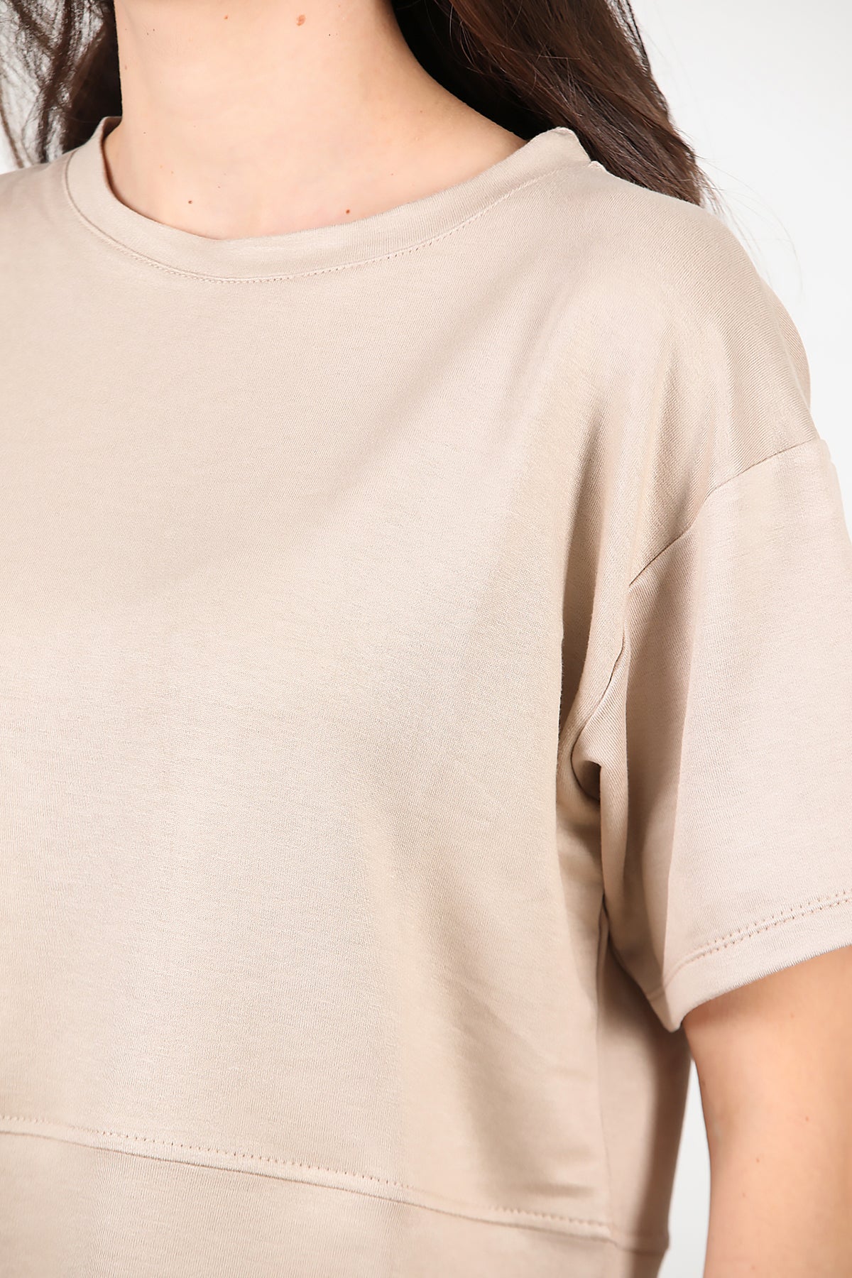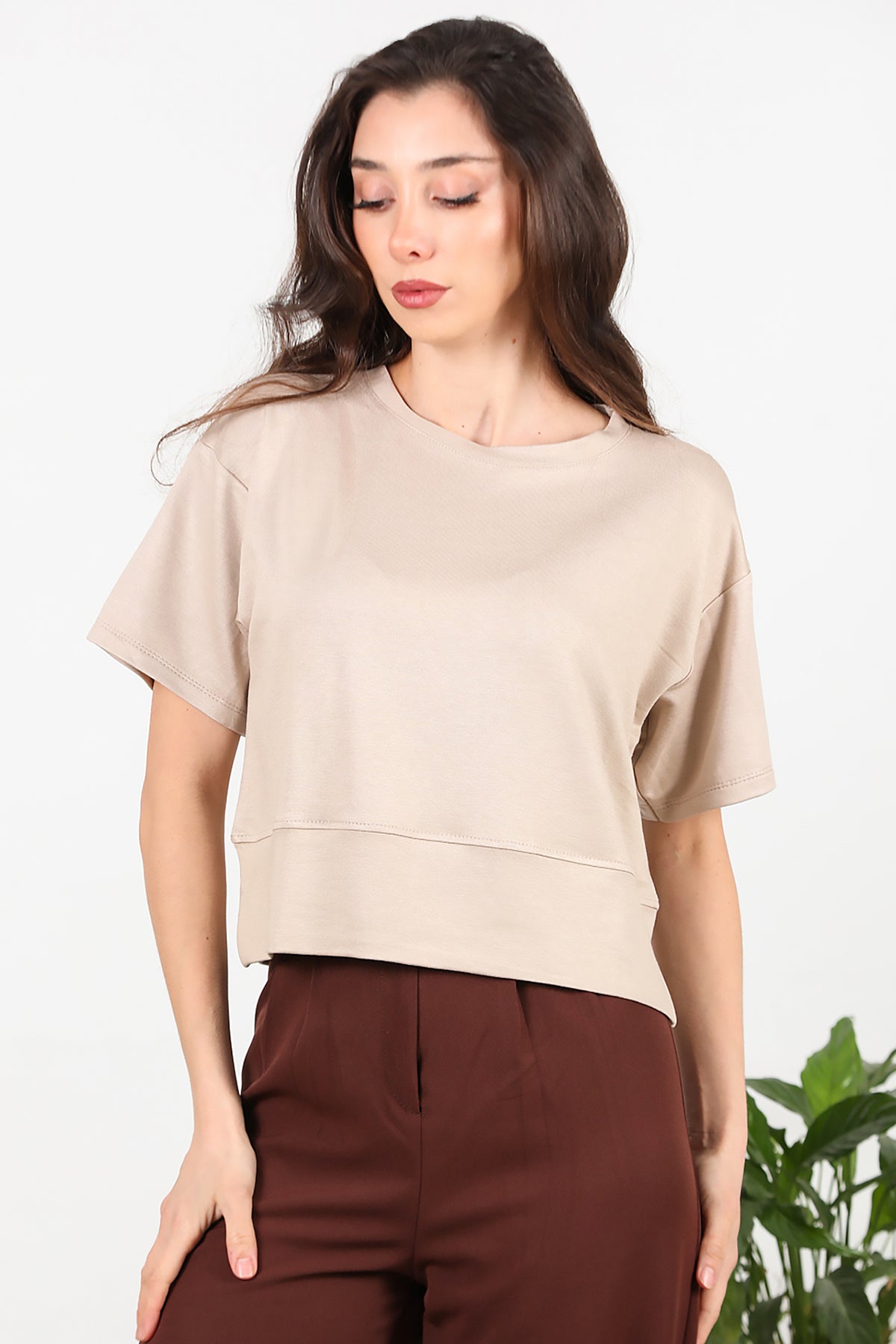Kadın Bisiklet Yaka Yan Yırtmaçlı T-shırt Vizon