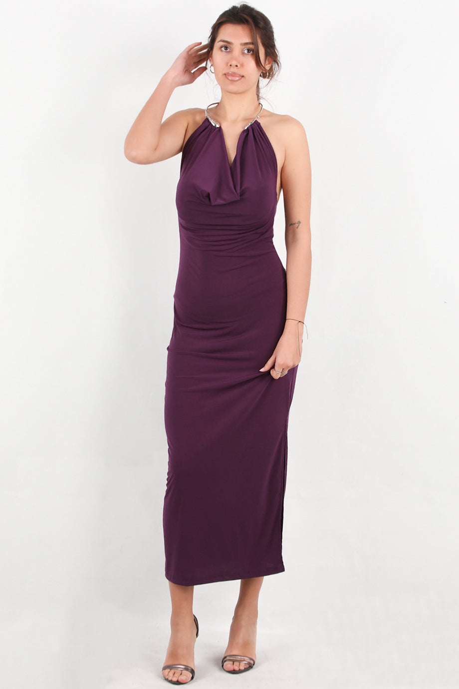 Backless Kadın Boynu Halka Detay Sırt Dekolte Elbise Mor