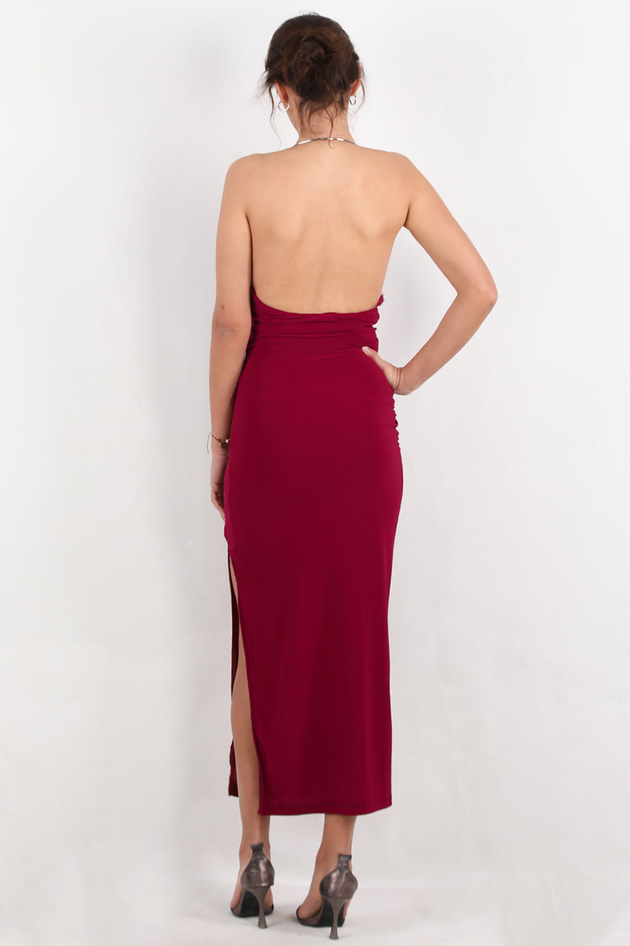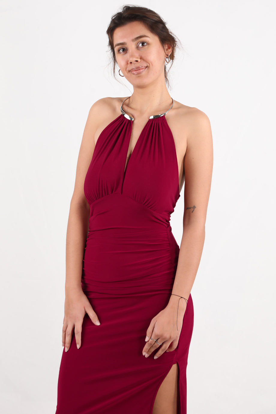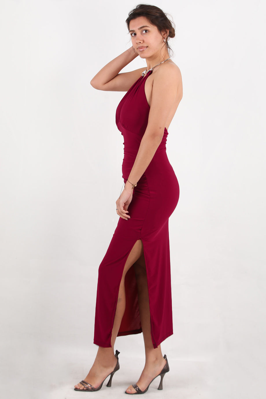 Aurea Kadın Boyun Halka Detay Yırtmaçlı Elbise Bordo