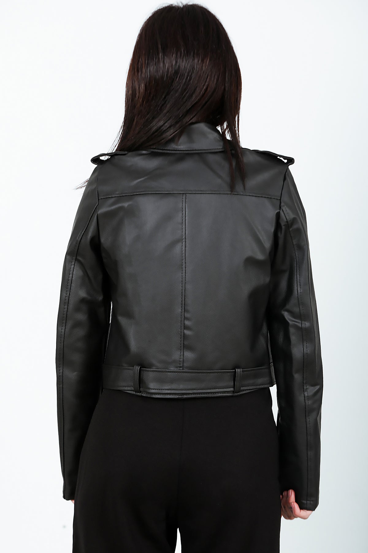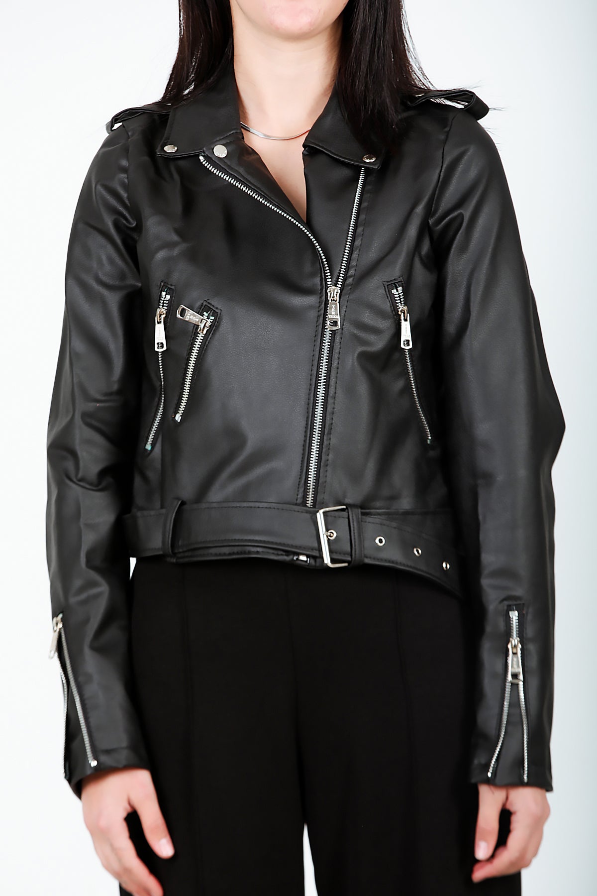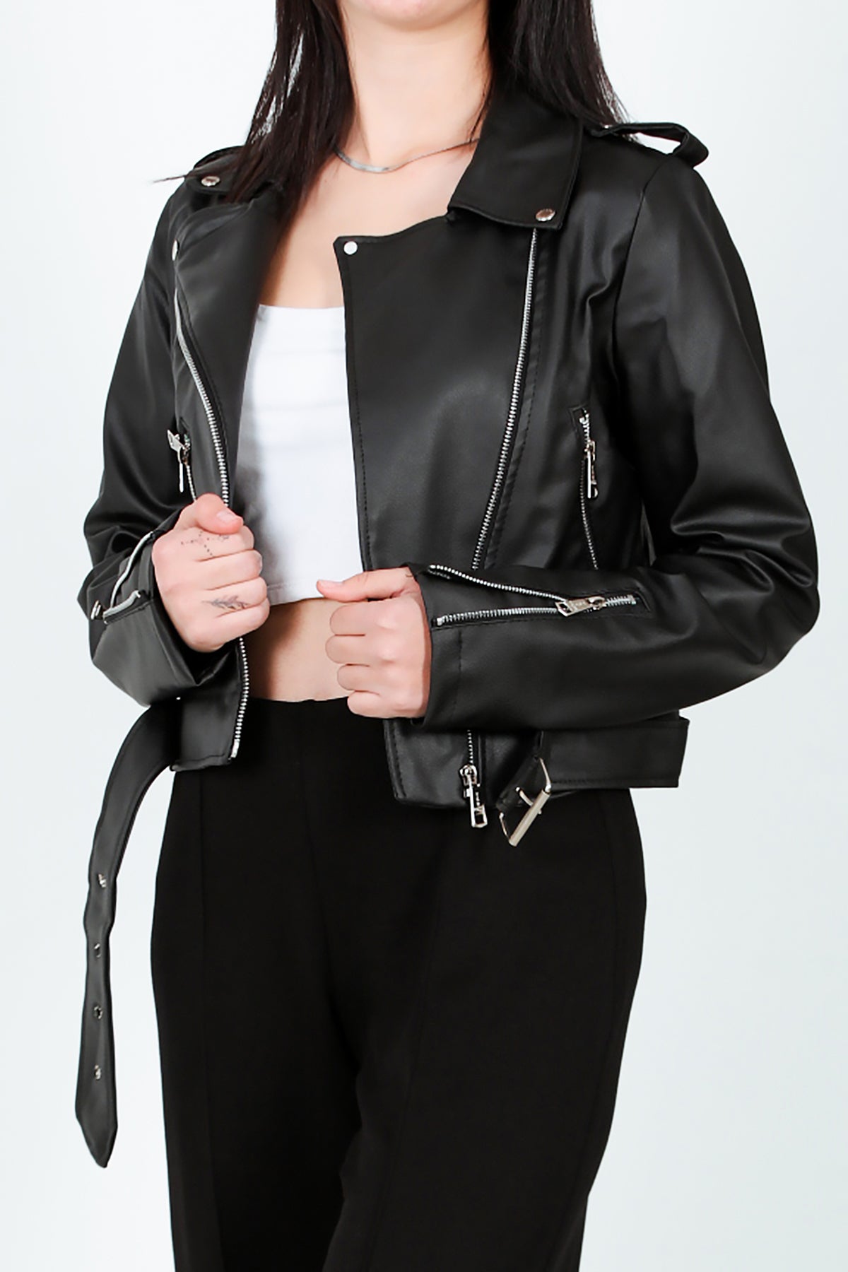 Kadın Çapraz Fermuarlı Gömlek Yaka Deri Ceket Siyah