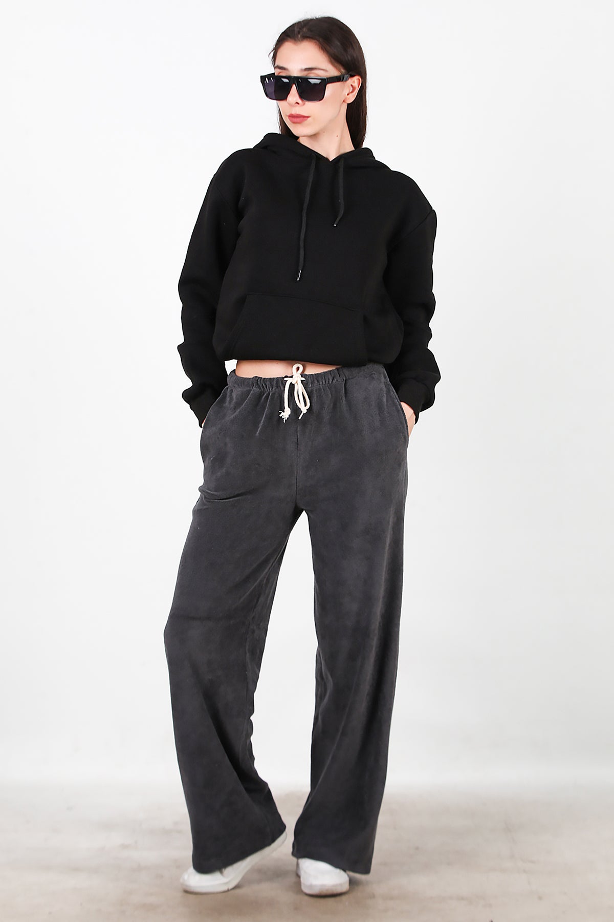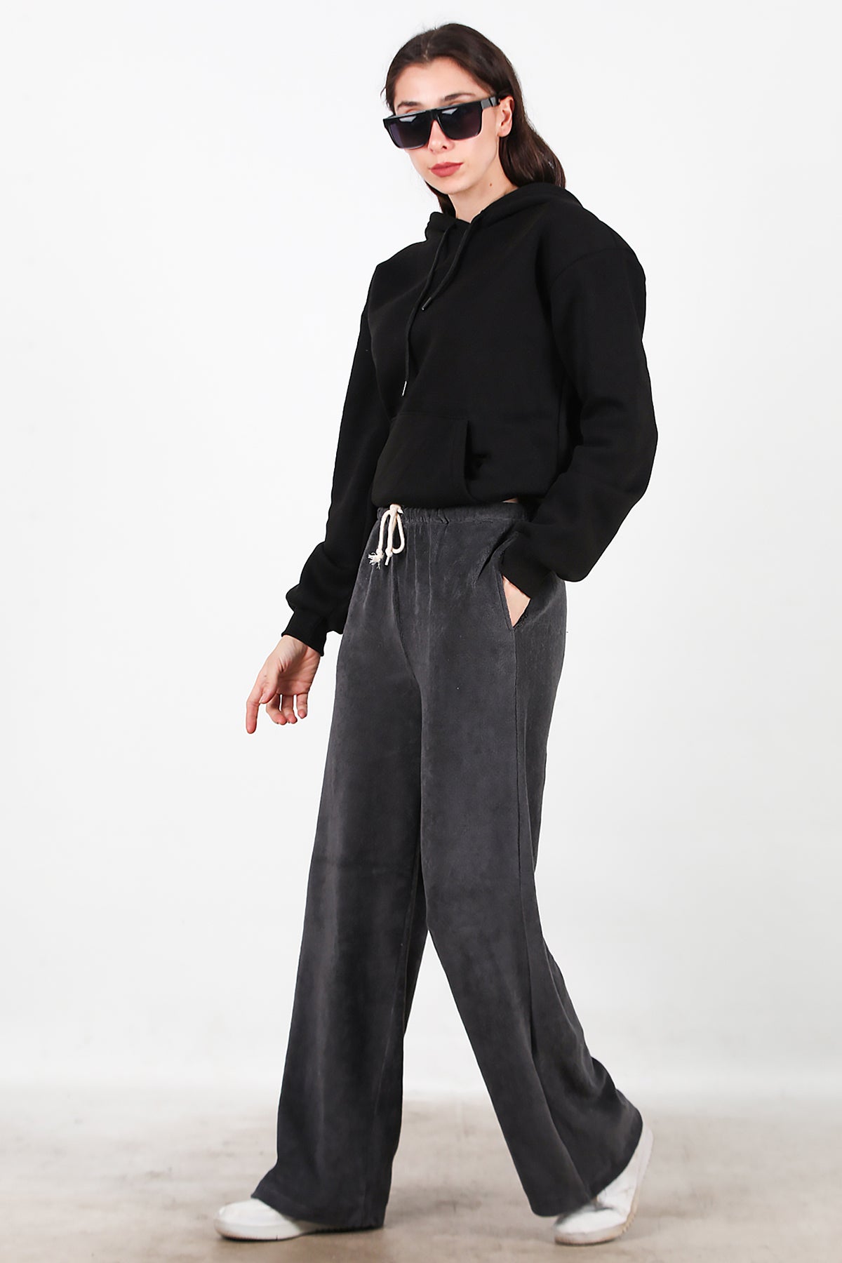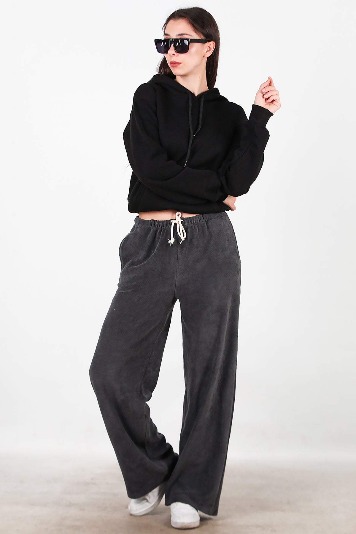 Kadın Cepli Bol Paça Havlu Pantolon Füme