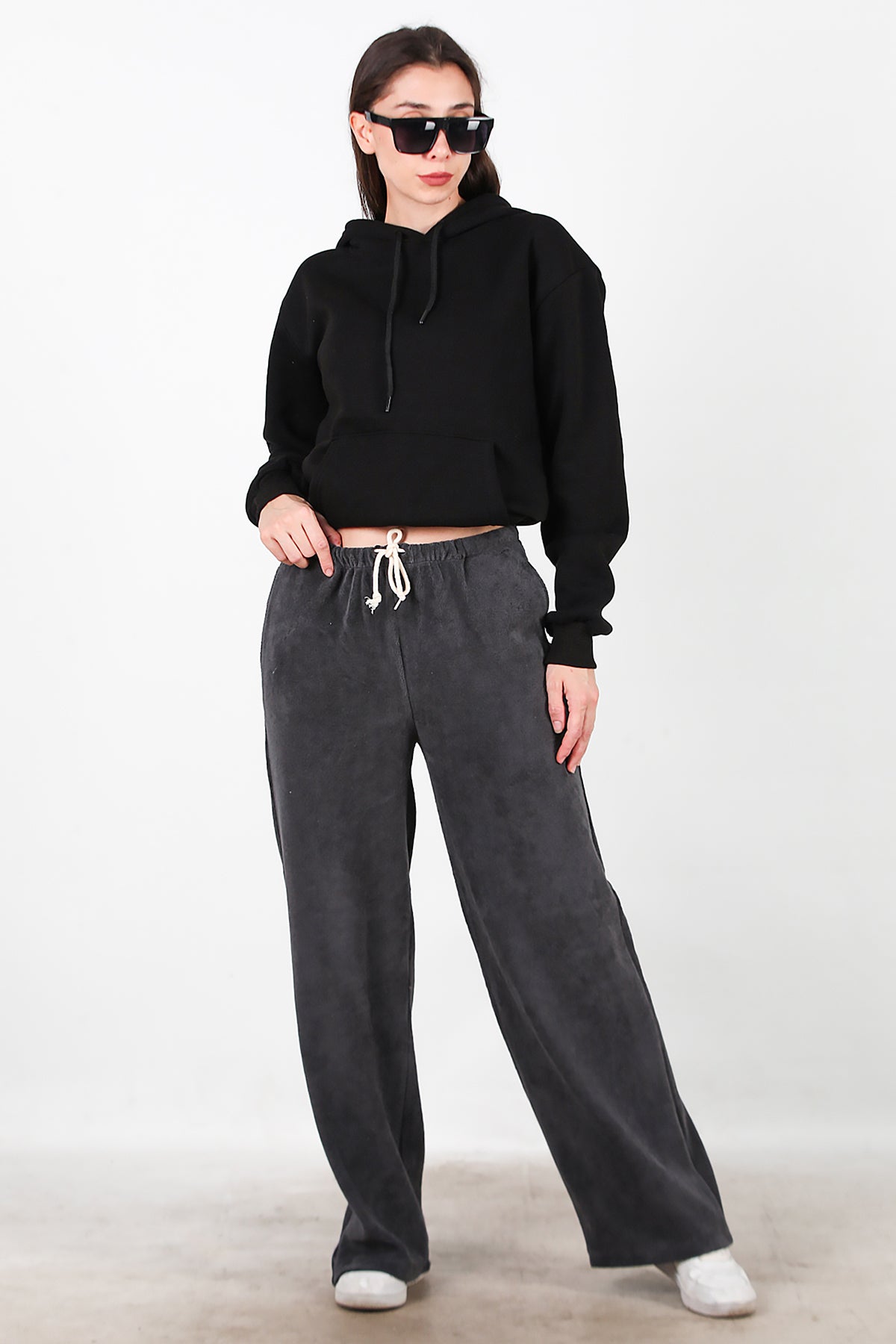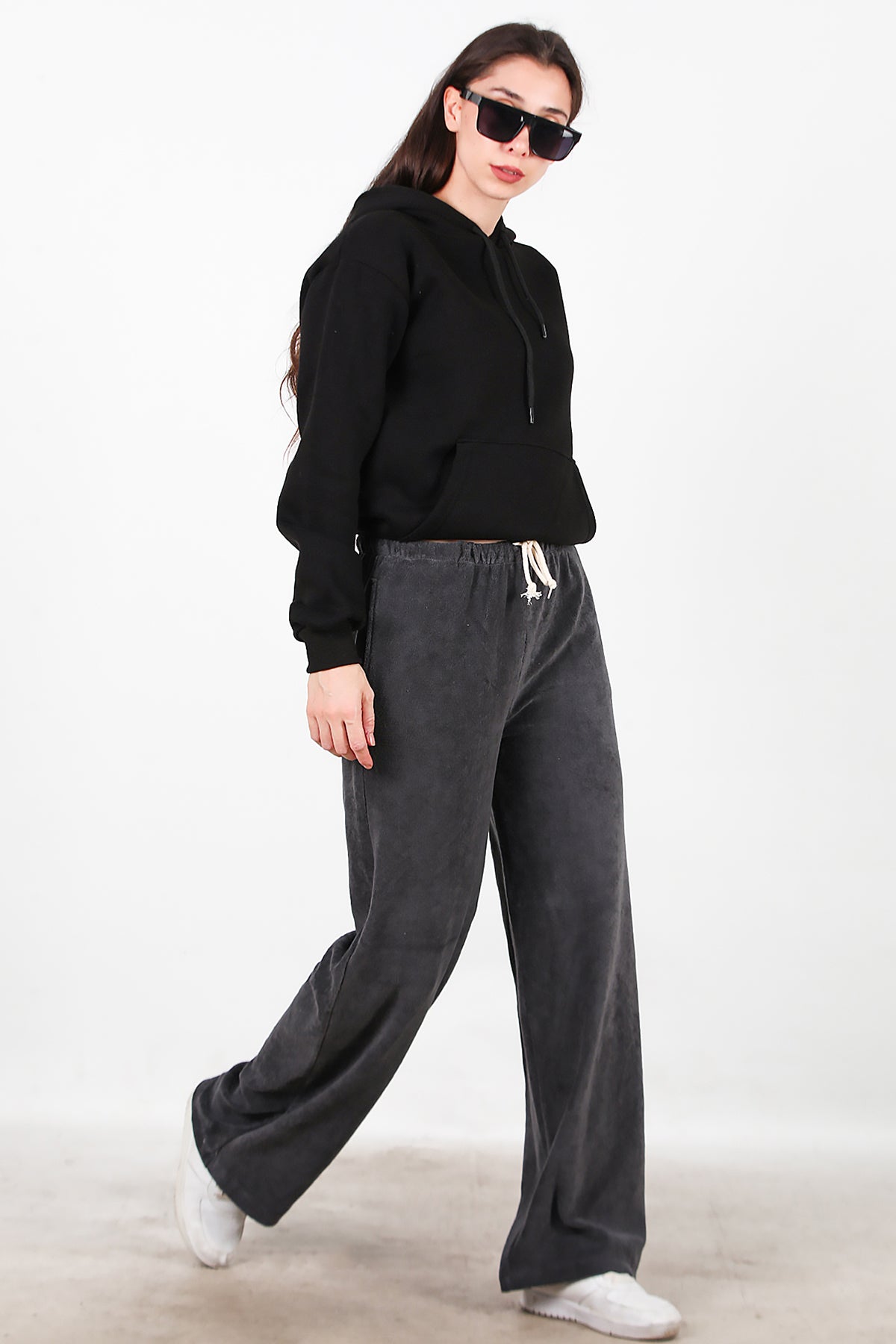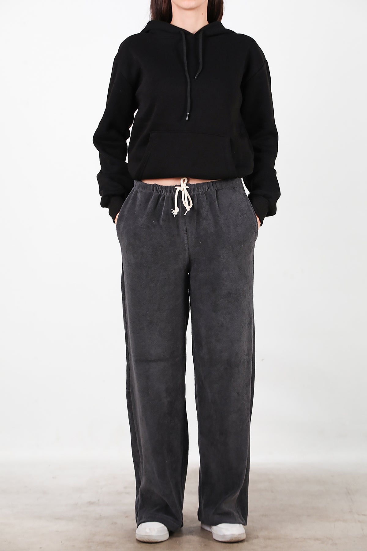Kadın Cepli Bol Paça Havlu Pantolon Füme