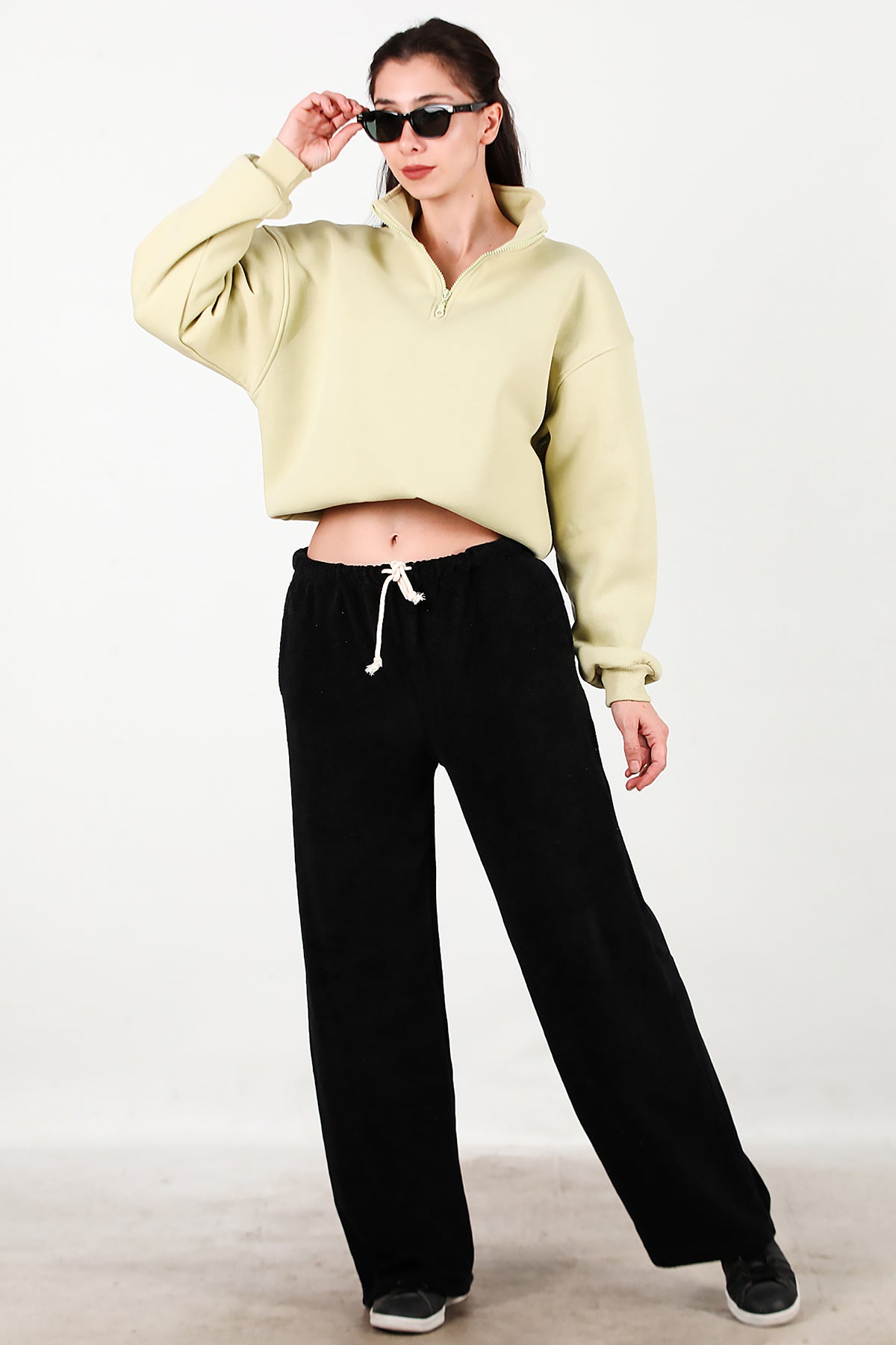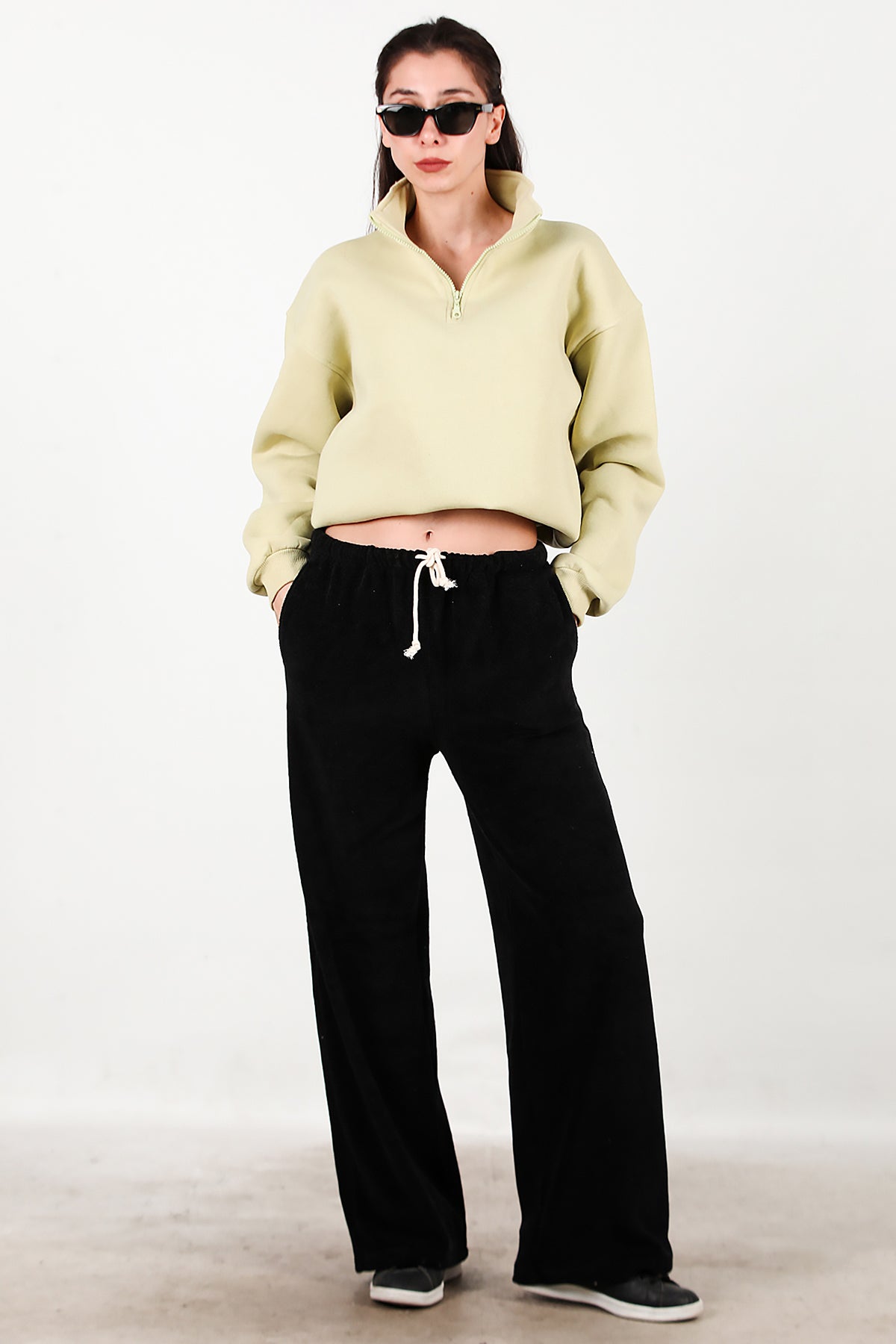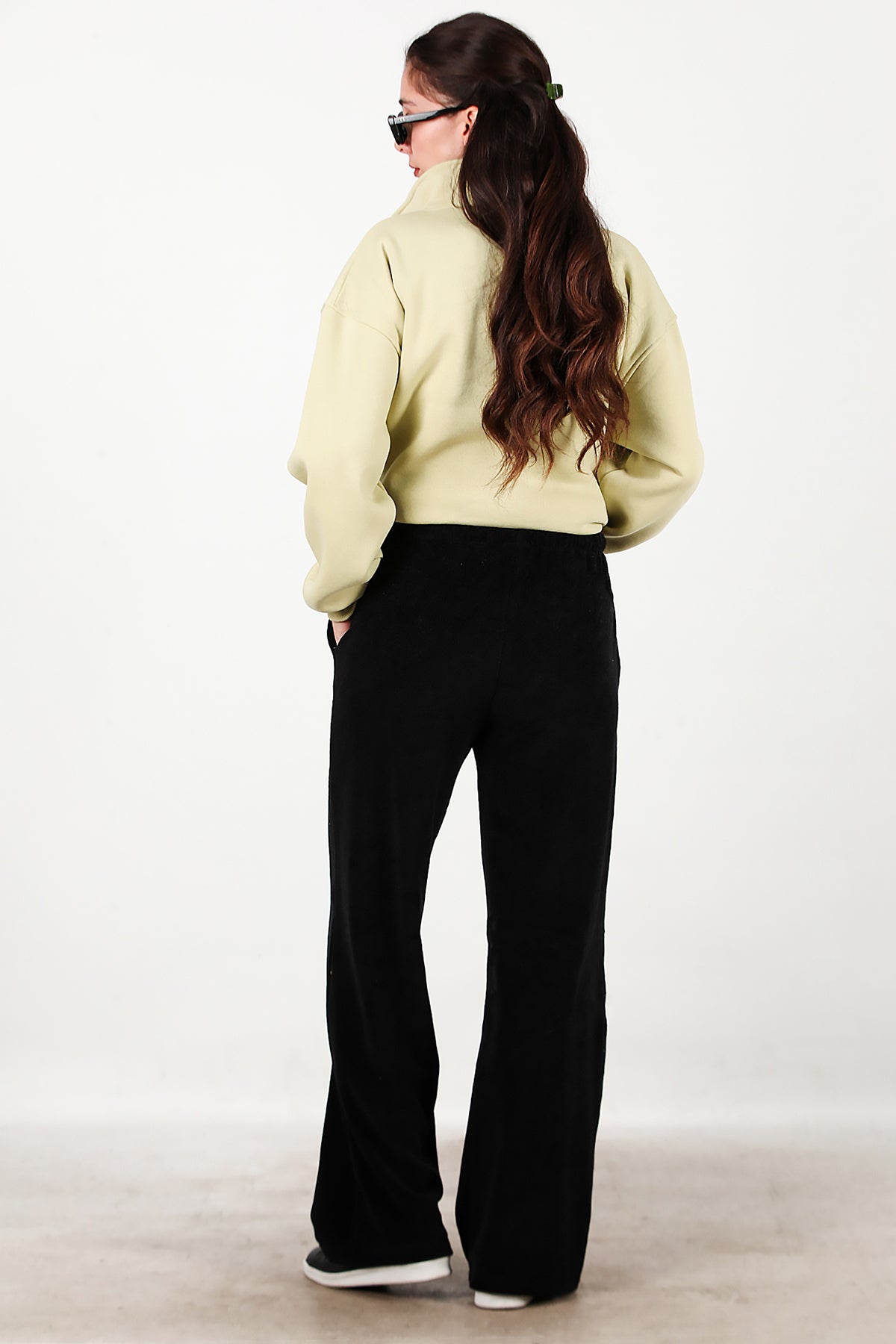 Kadın Cepli Bol Paça Havlu Pantolon Siyah