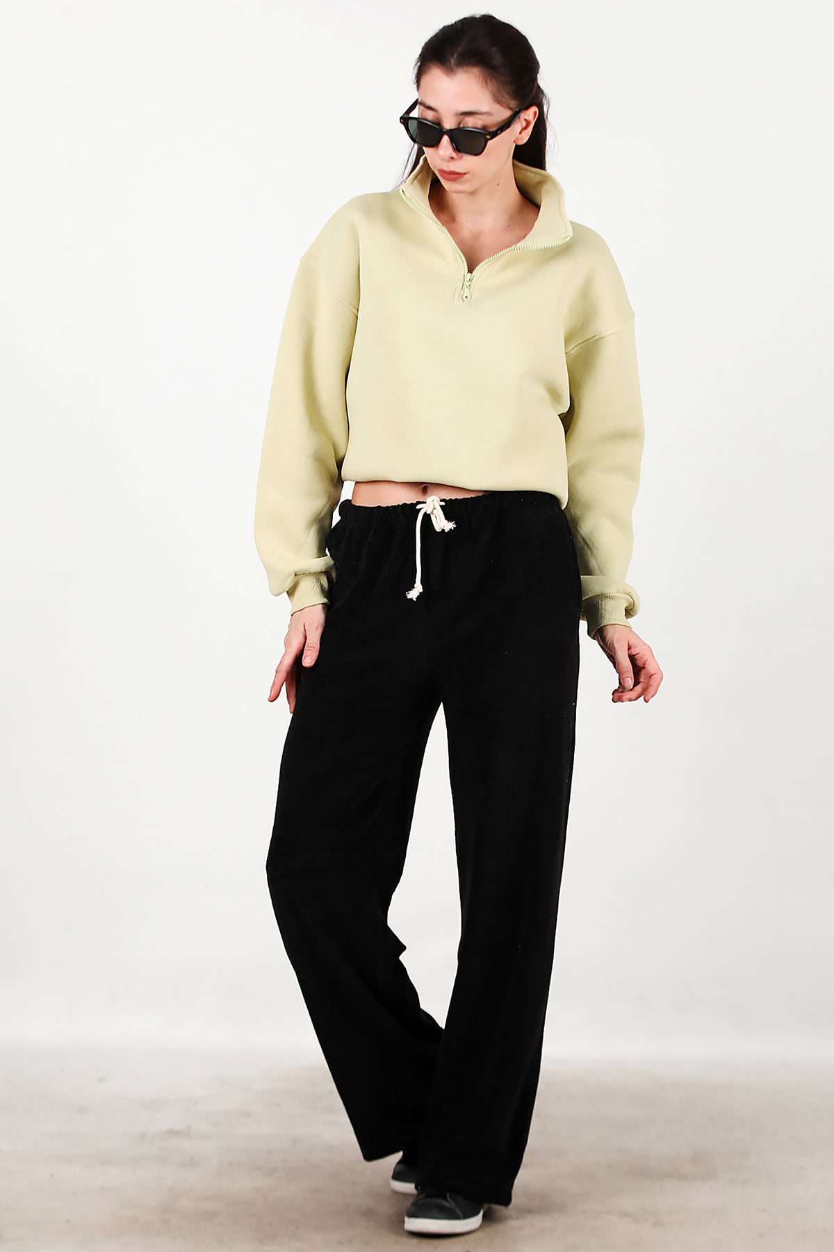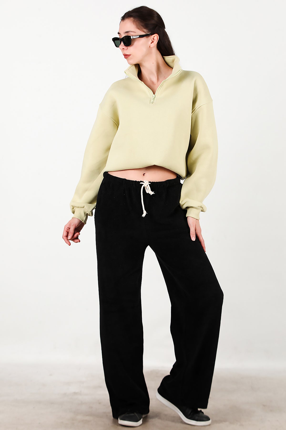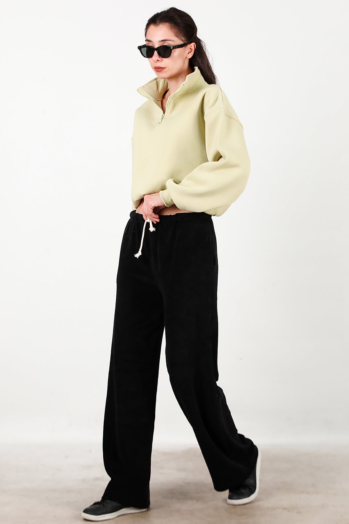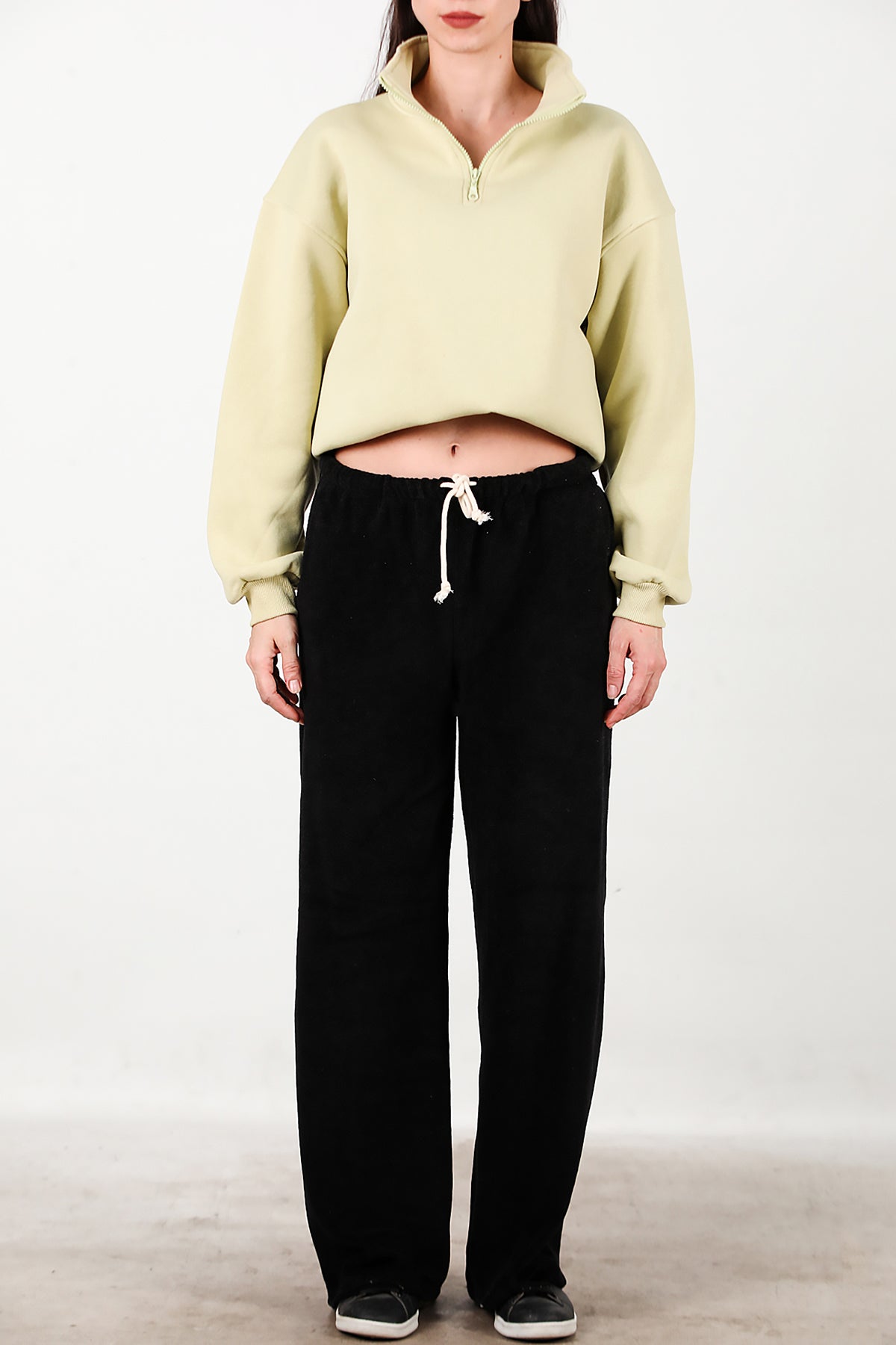 Kadın Cepli Bol Paça Havlu Pantolon Siyah