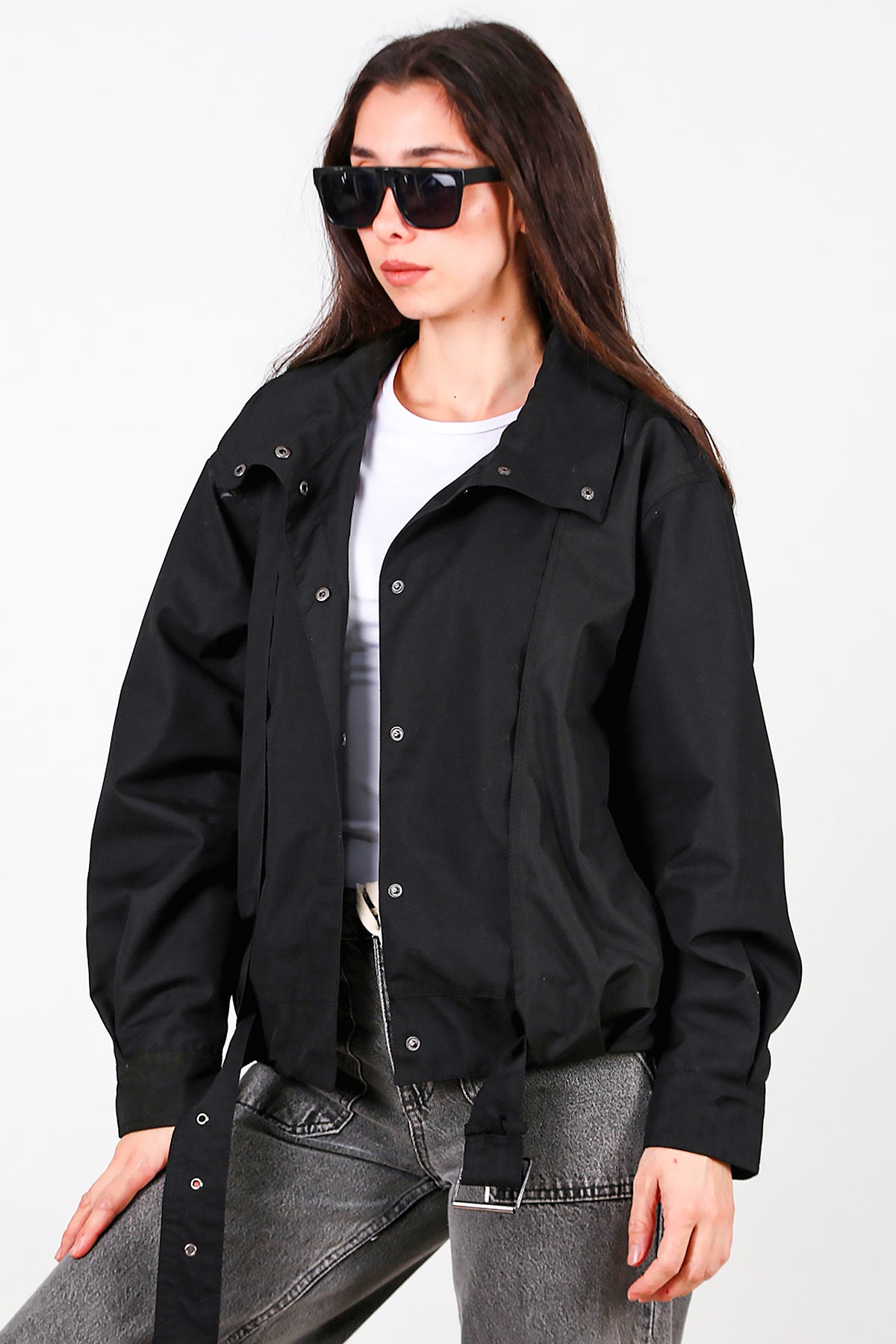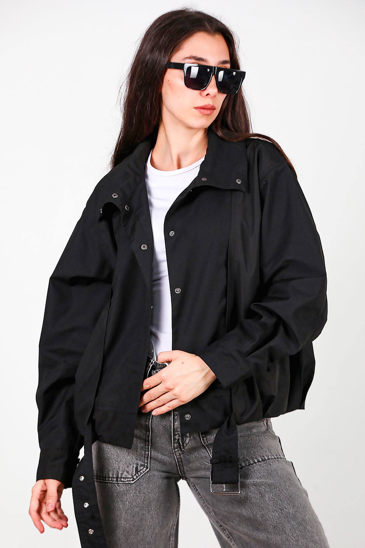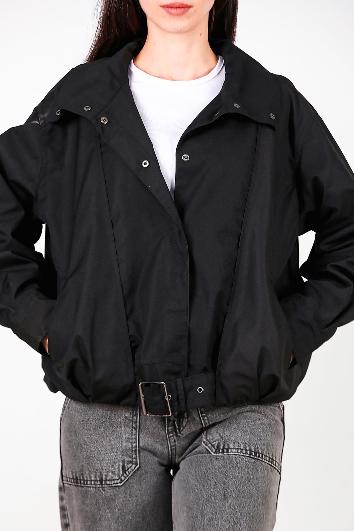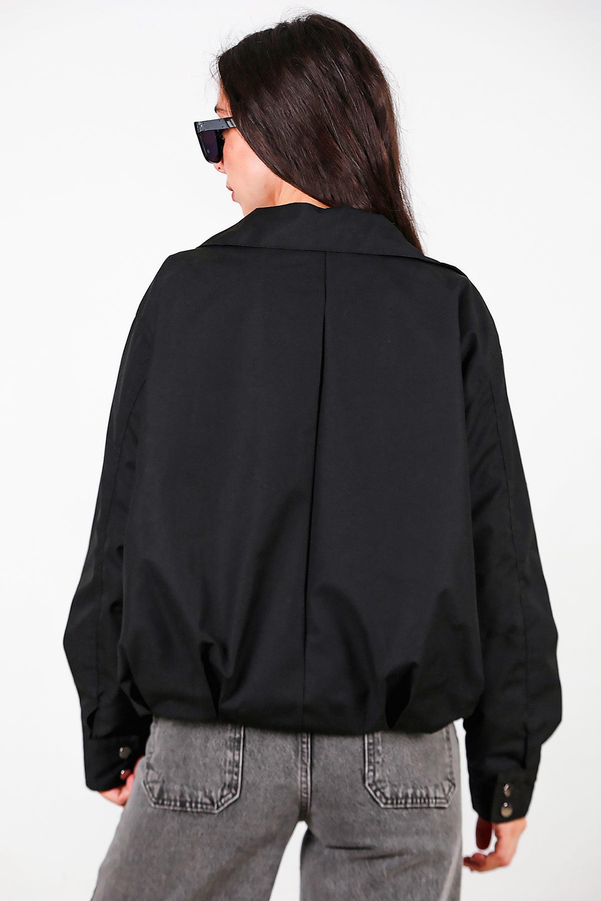 Kadın Çıtçıtlı Pile Detay Kısa Trençkot Siyah