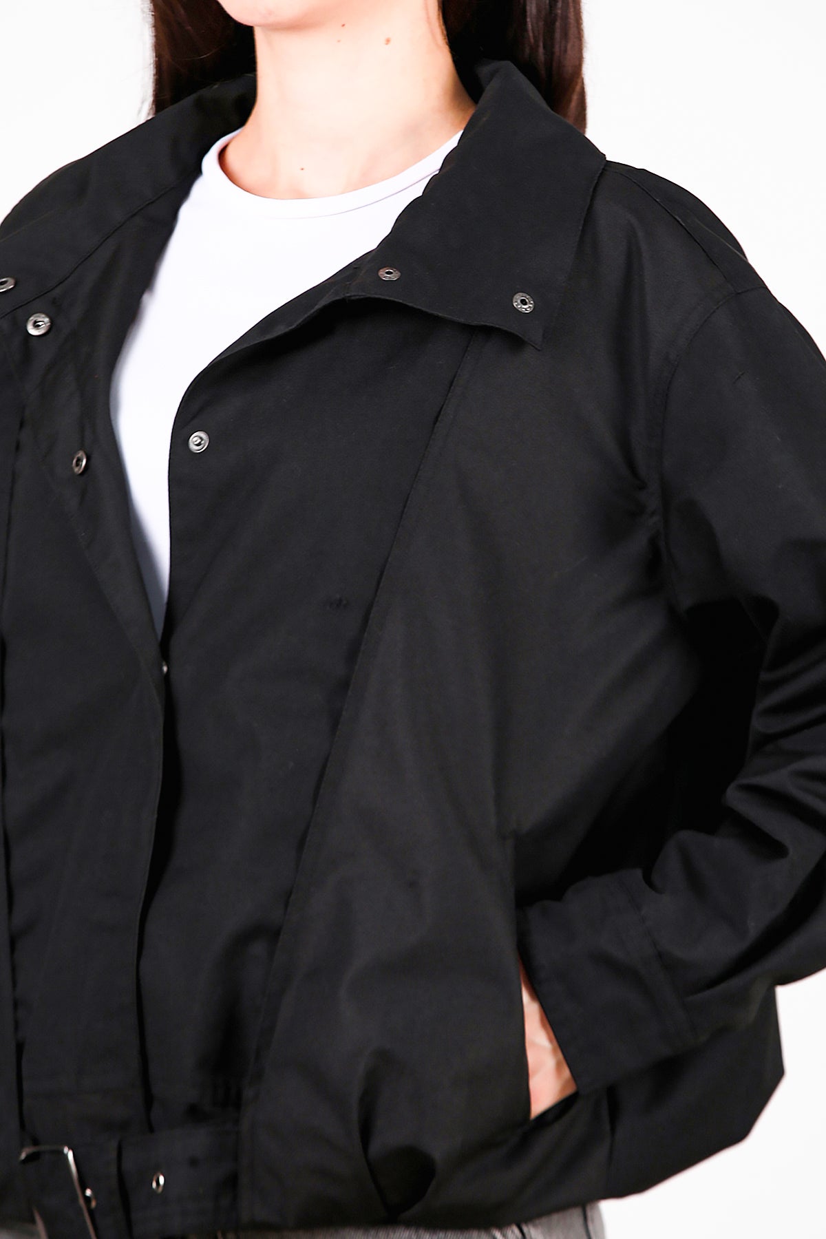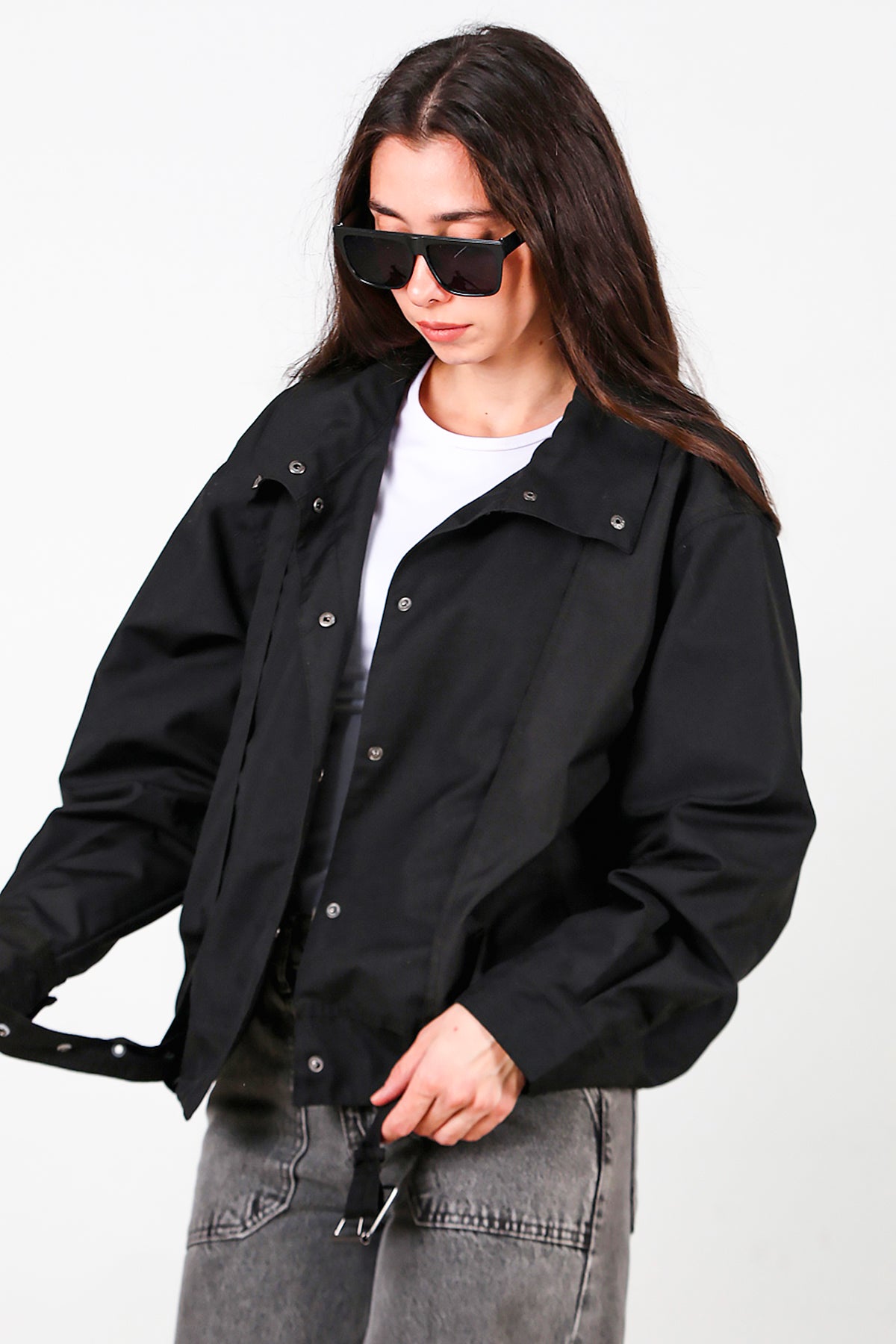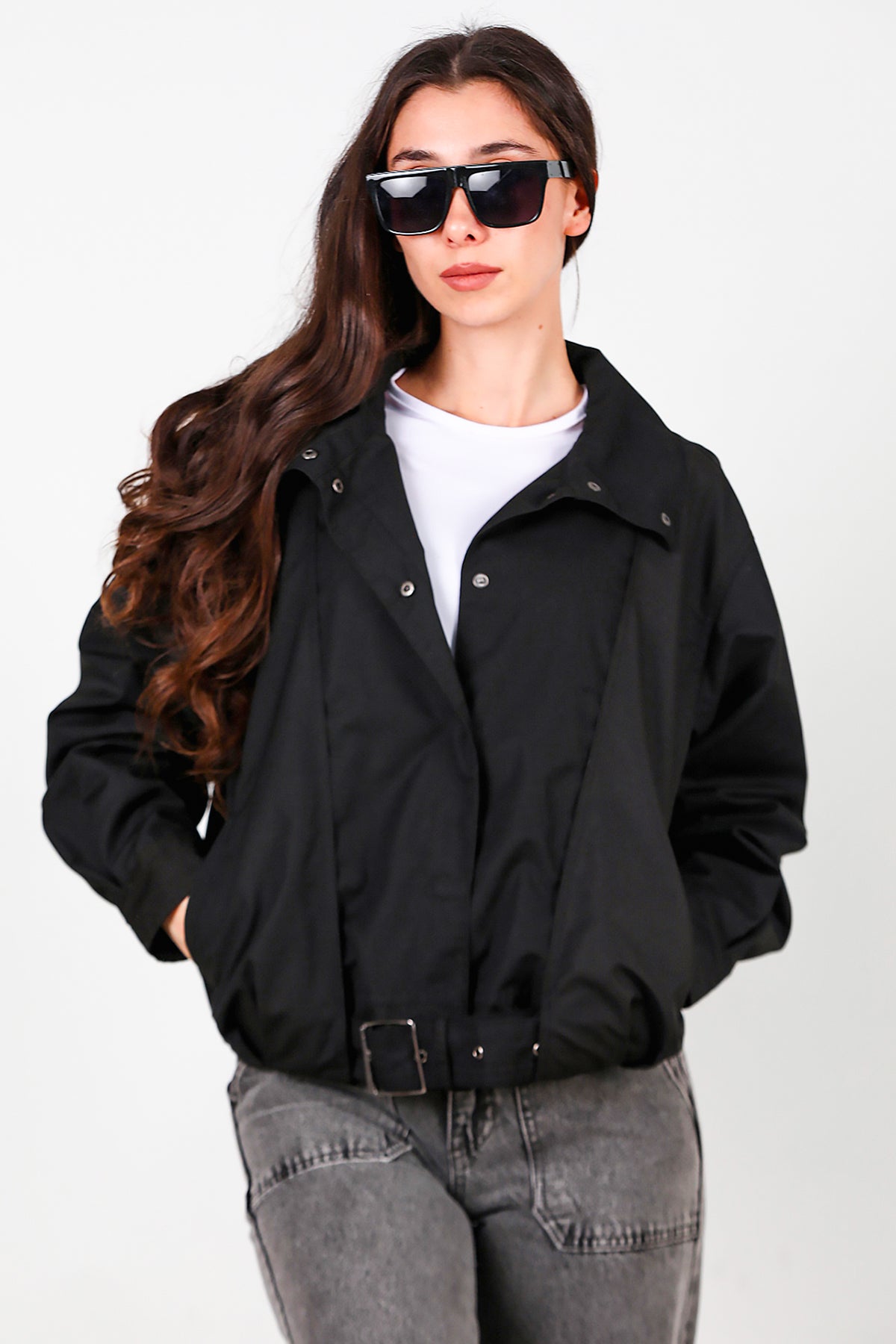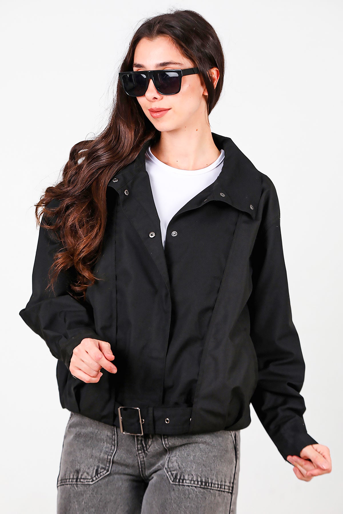 Kadın Çıtçıtlı Pile Detay Kısa Trençkot Siyah