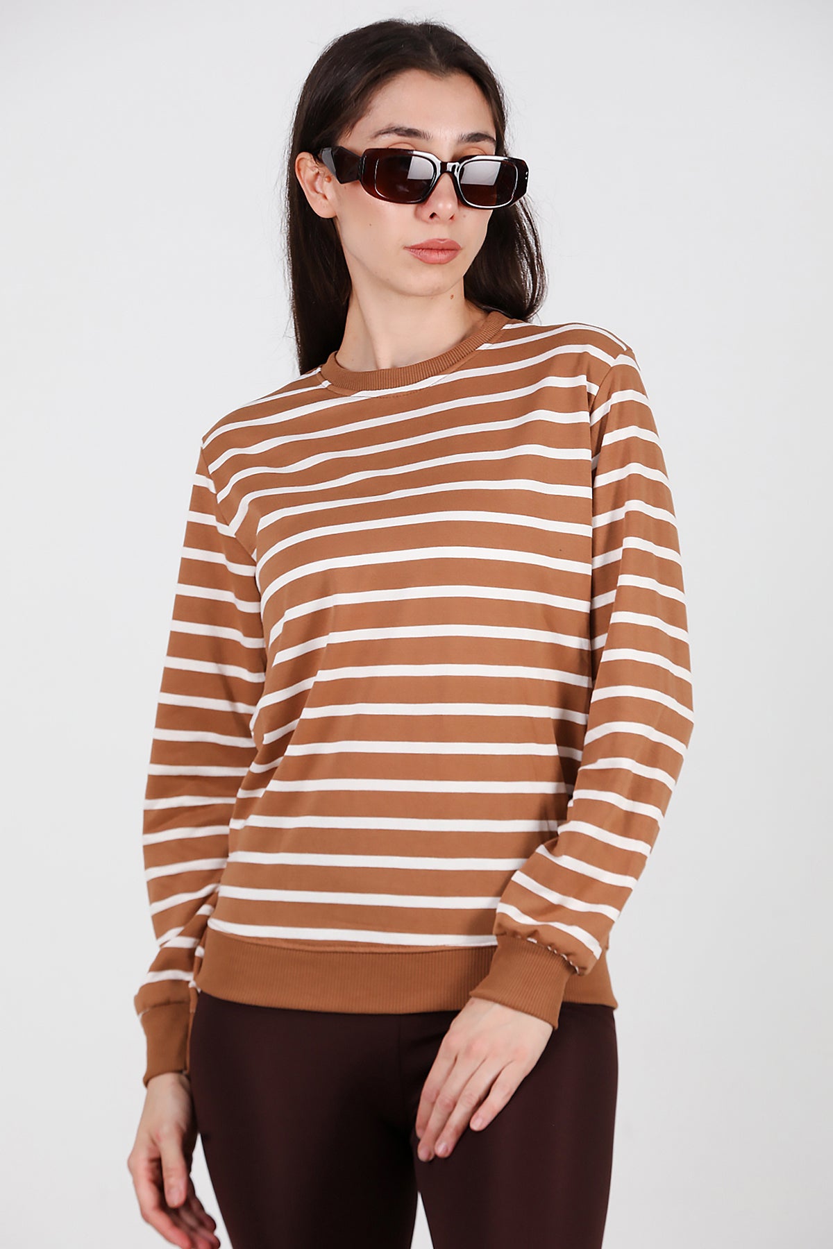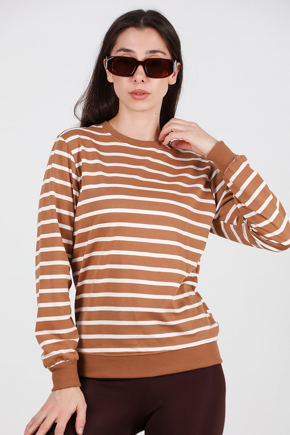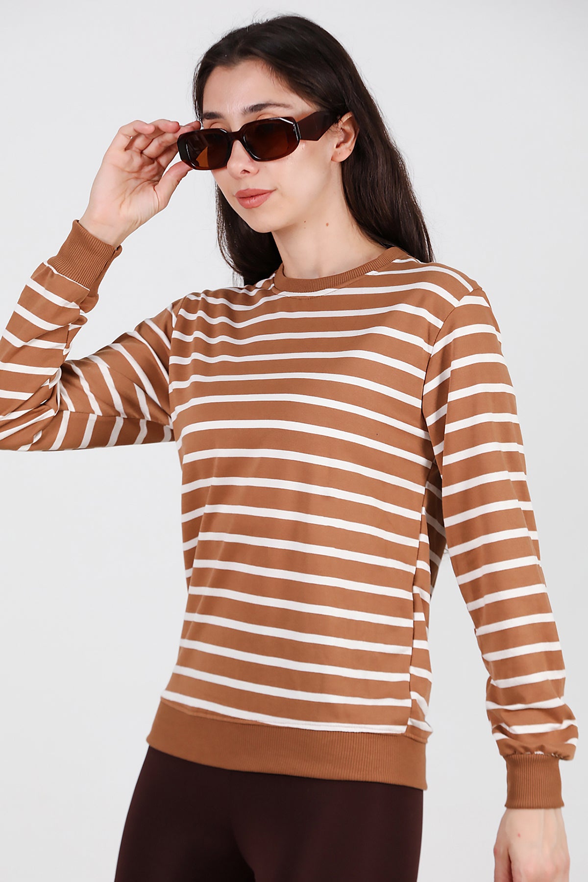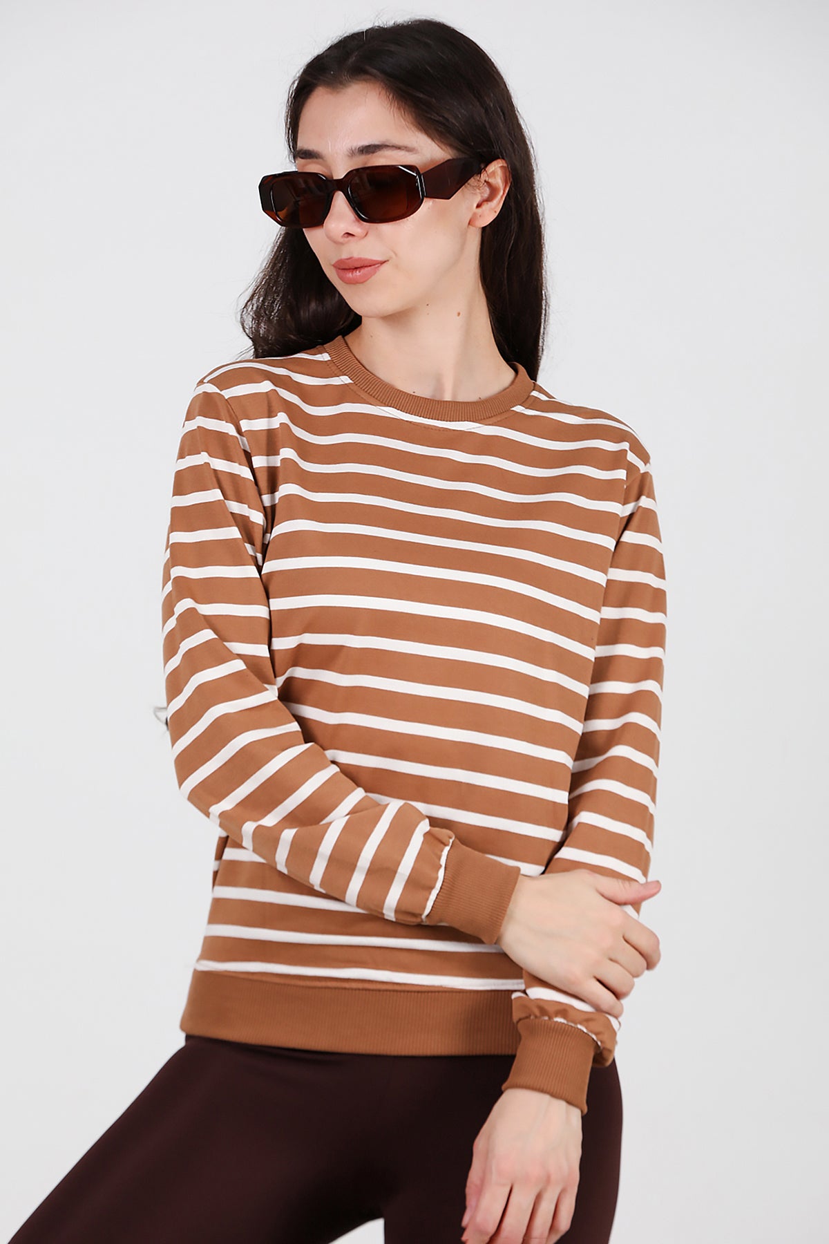 Kadın Çizgili Bisiklet Yaka Sweat Bej