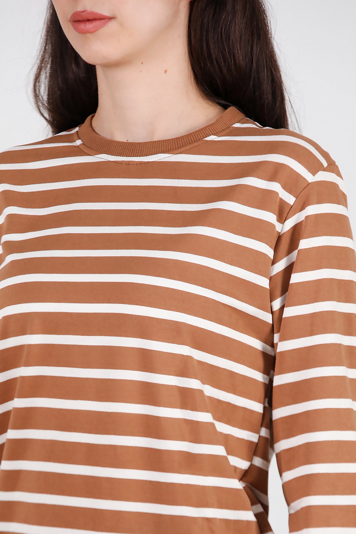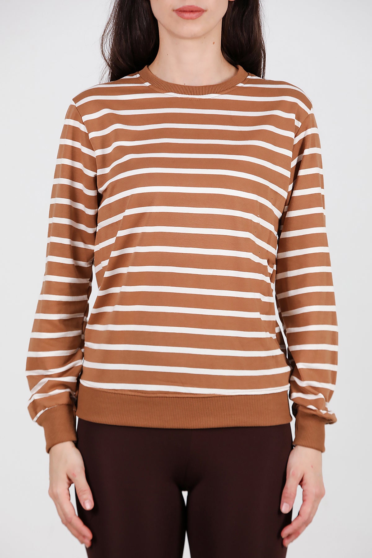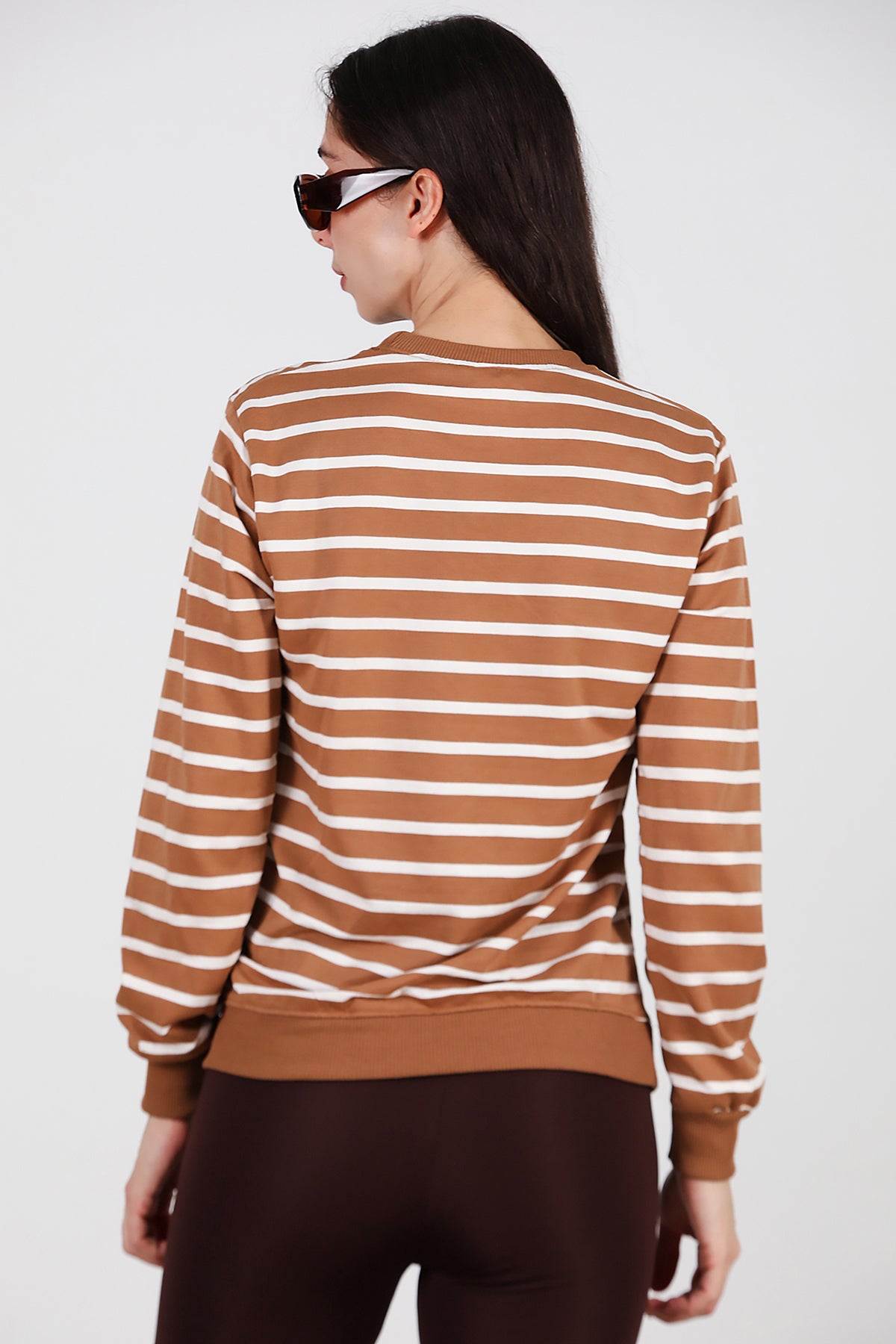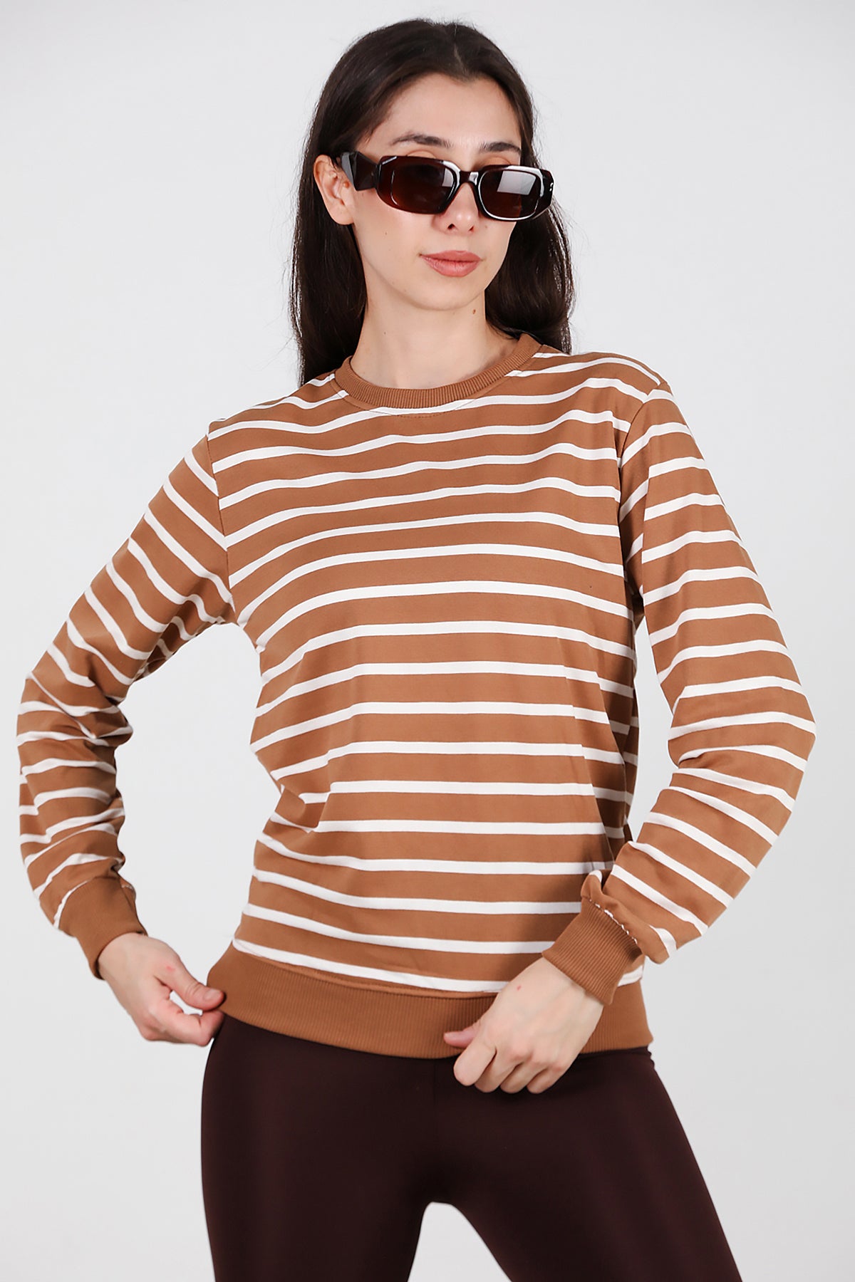 Kadın Çizgili Bisiklet Yaka Sweat Bej