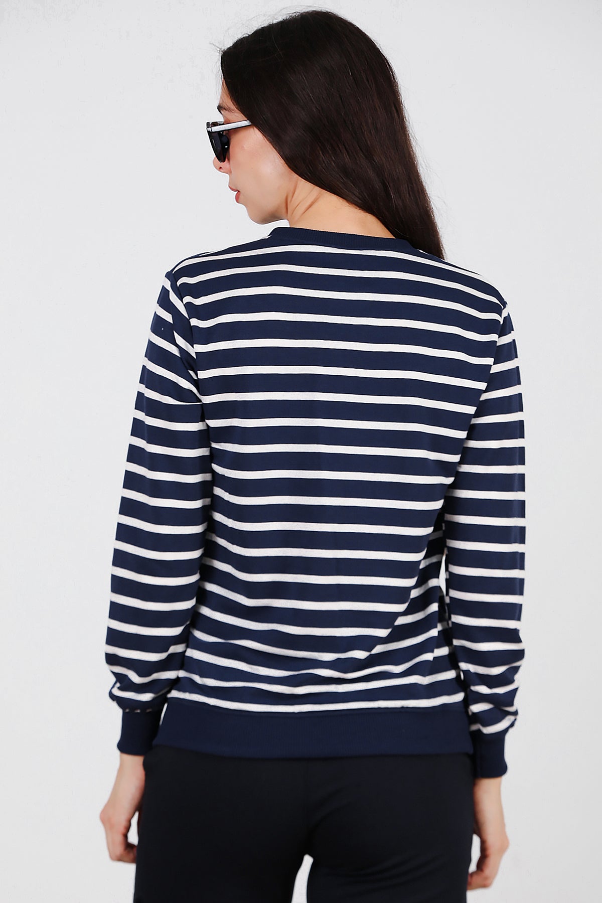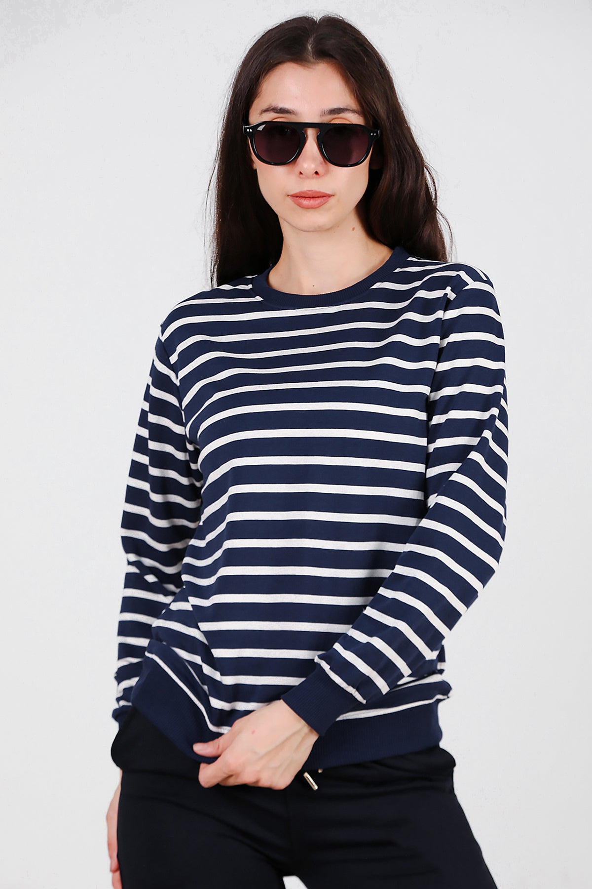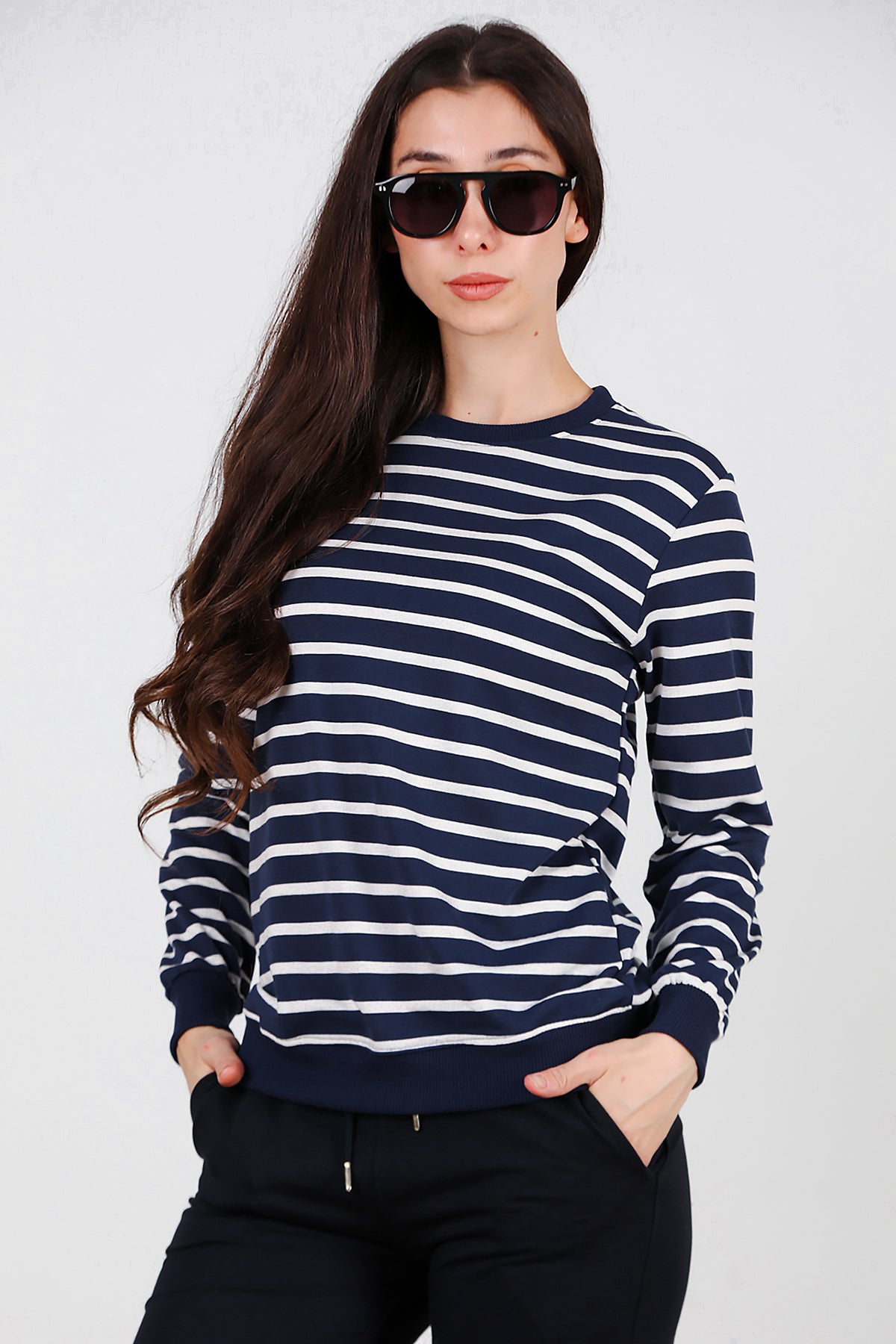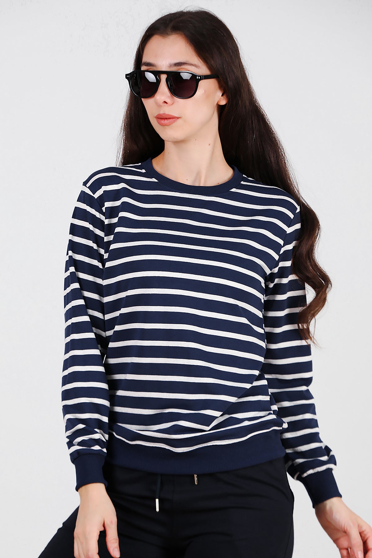 Kadın Çizgili Bisiklet Yaka Sweat Lacivert