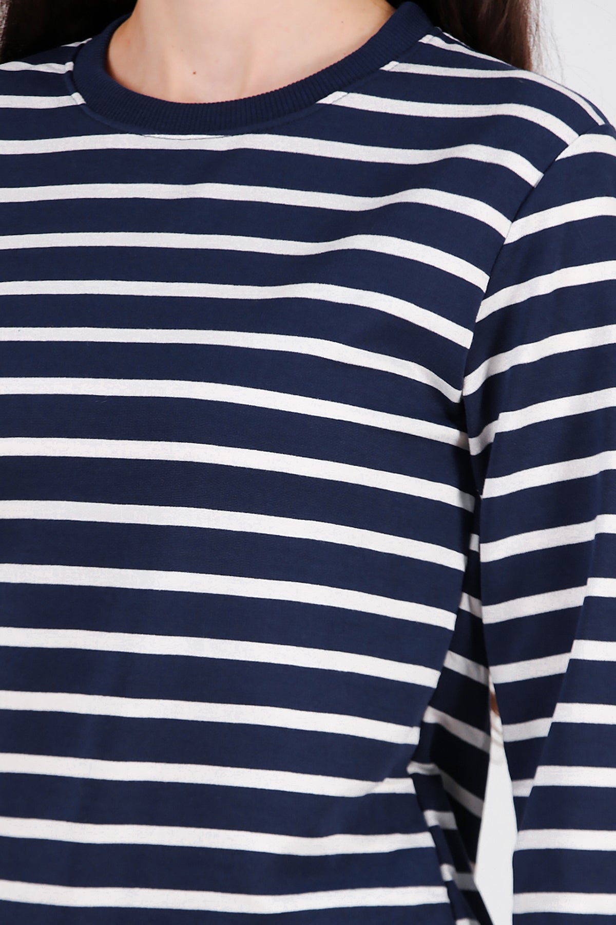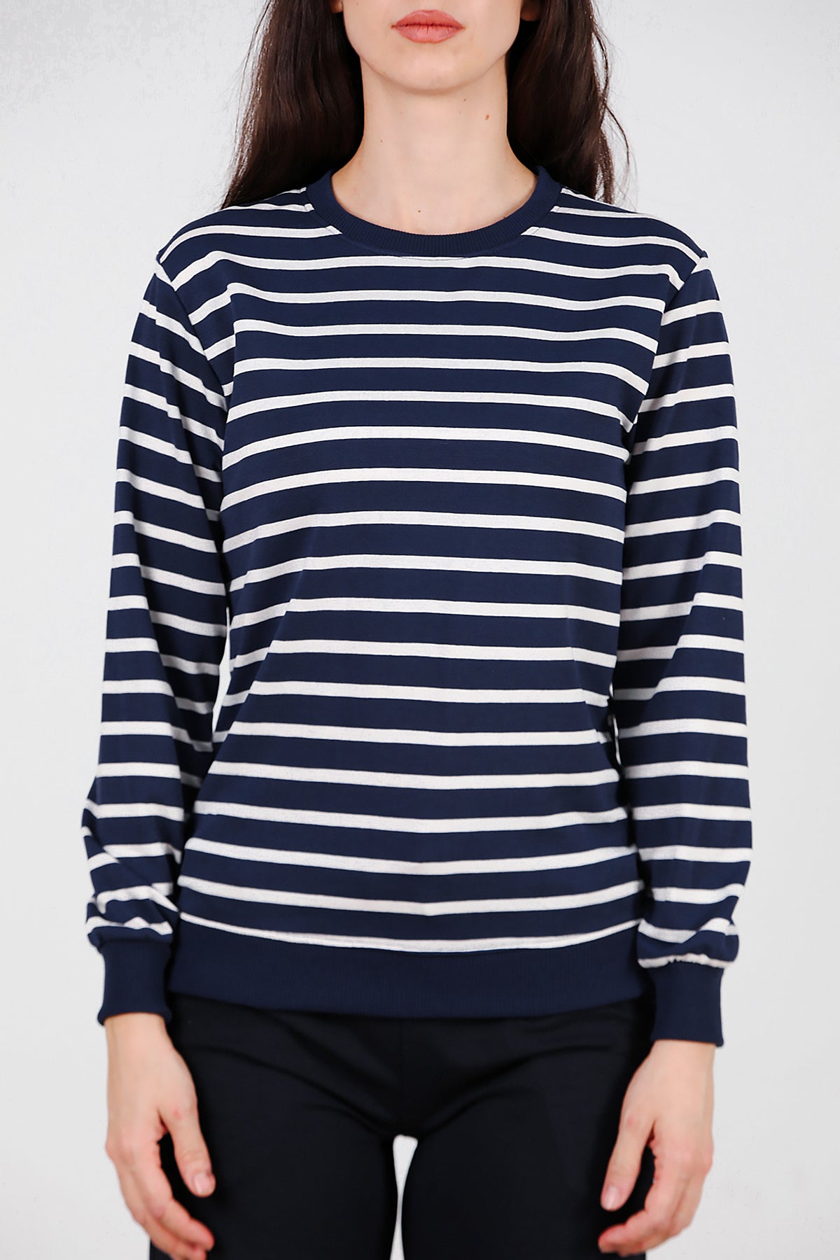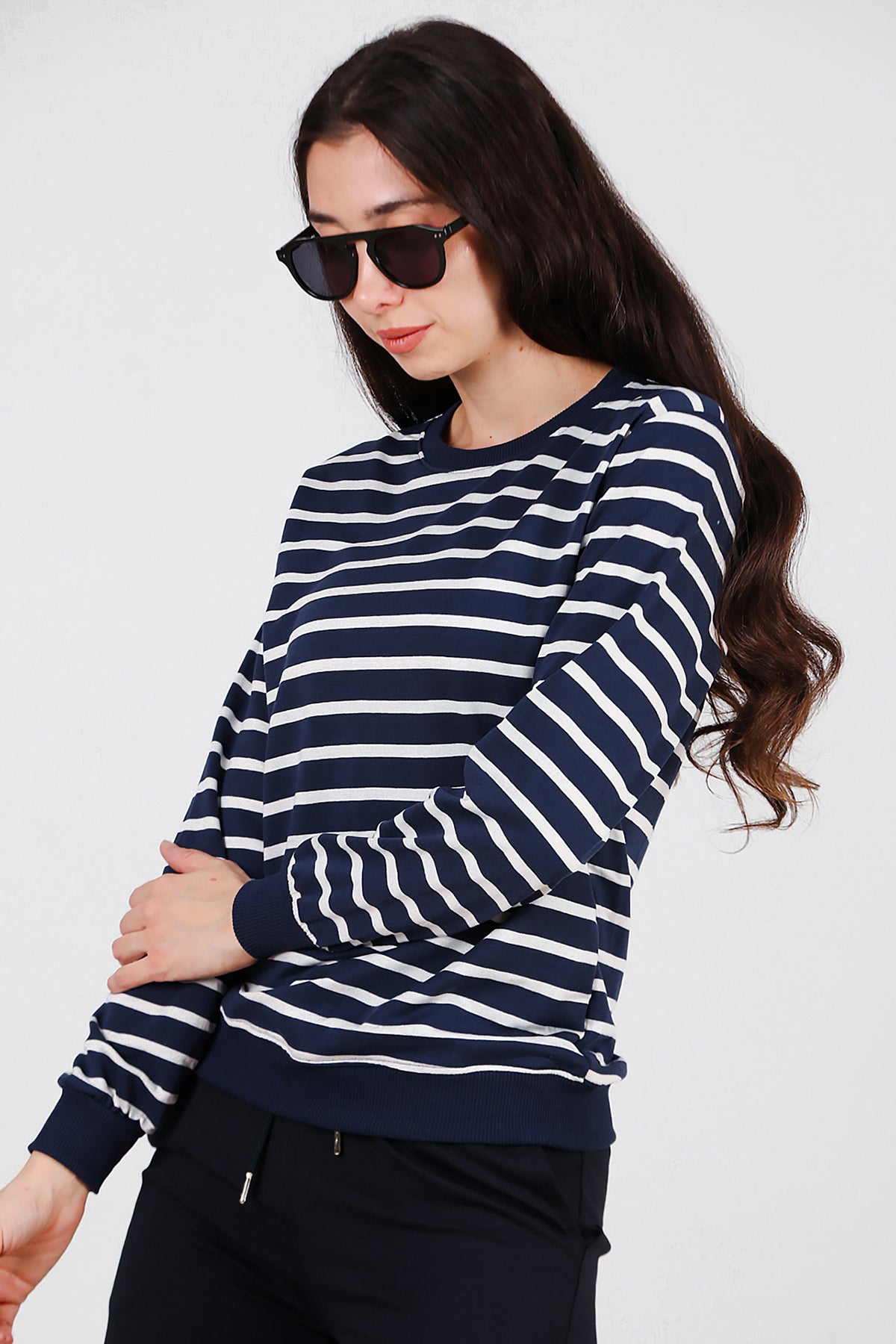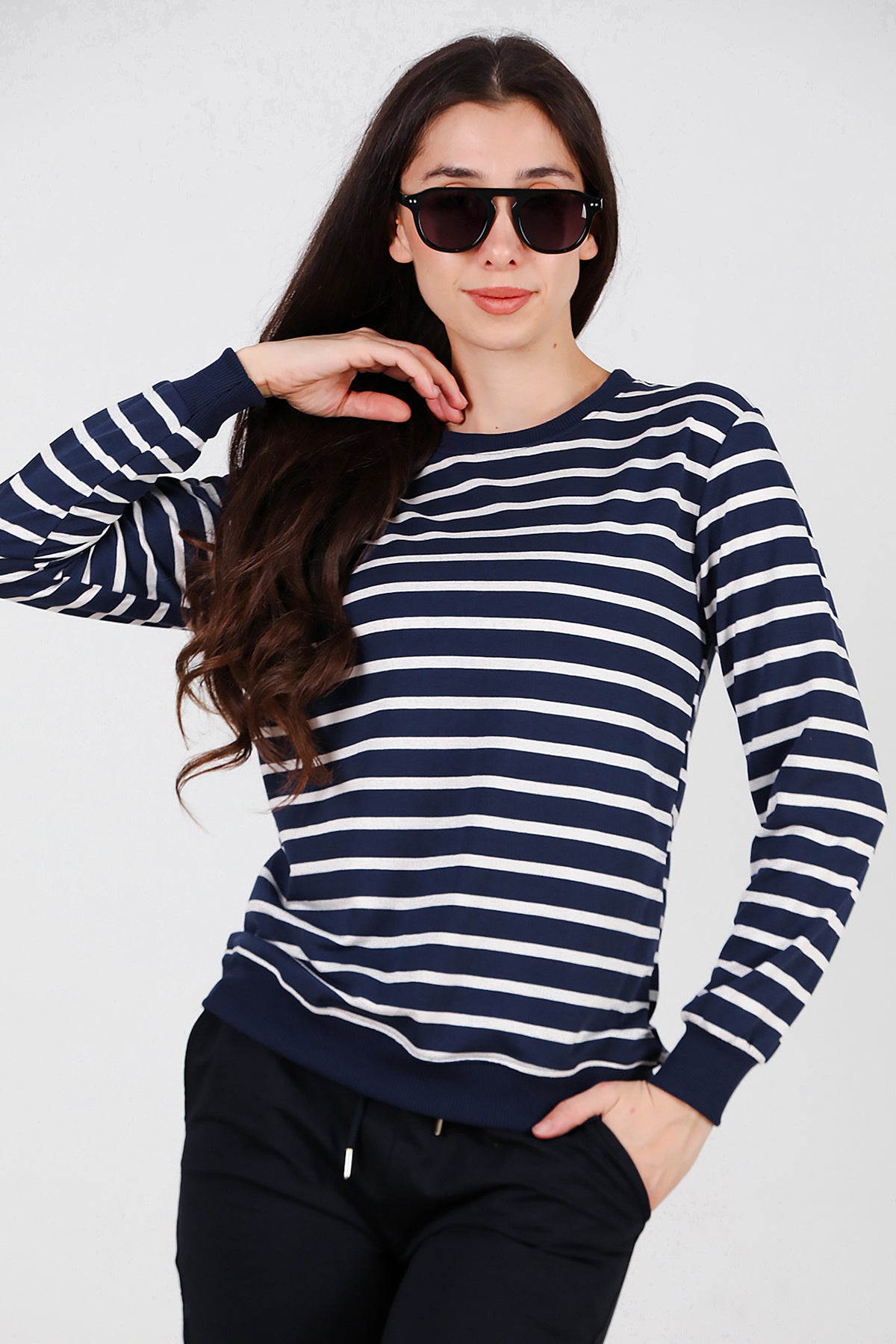 Kadın Çizgili Bisiklet Yaka Sweat Lacivert