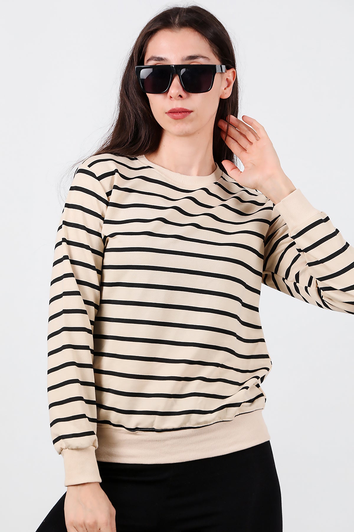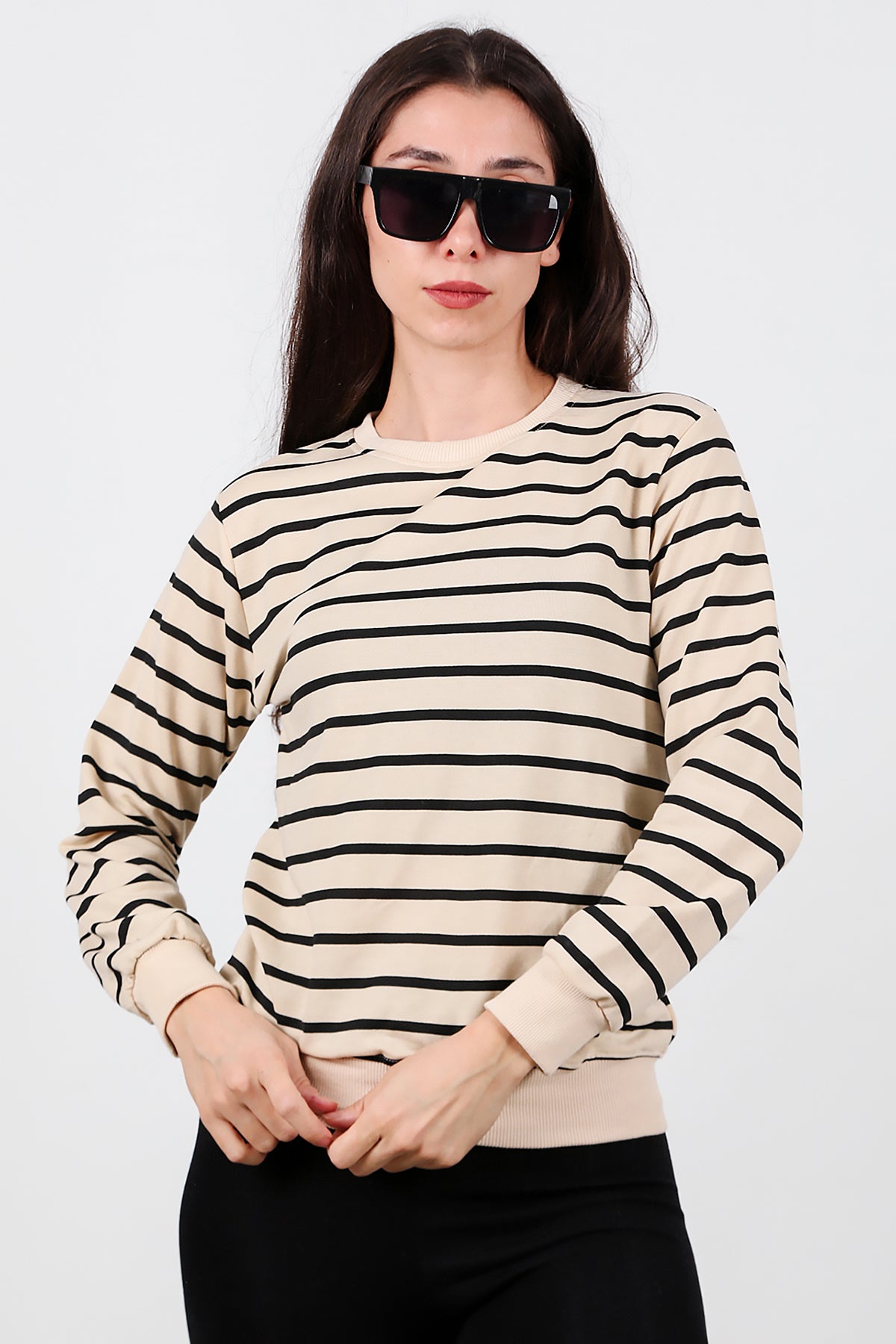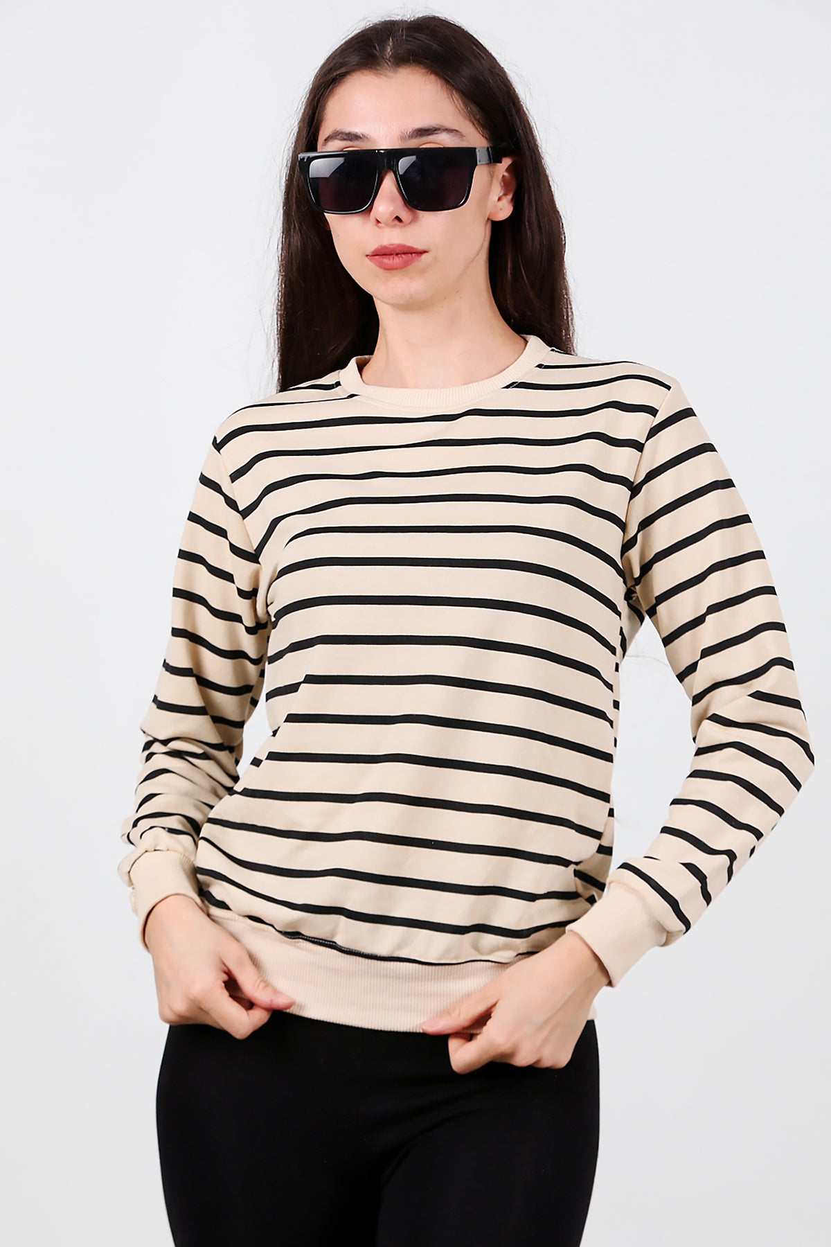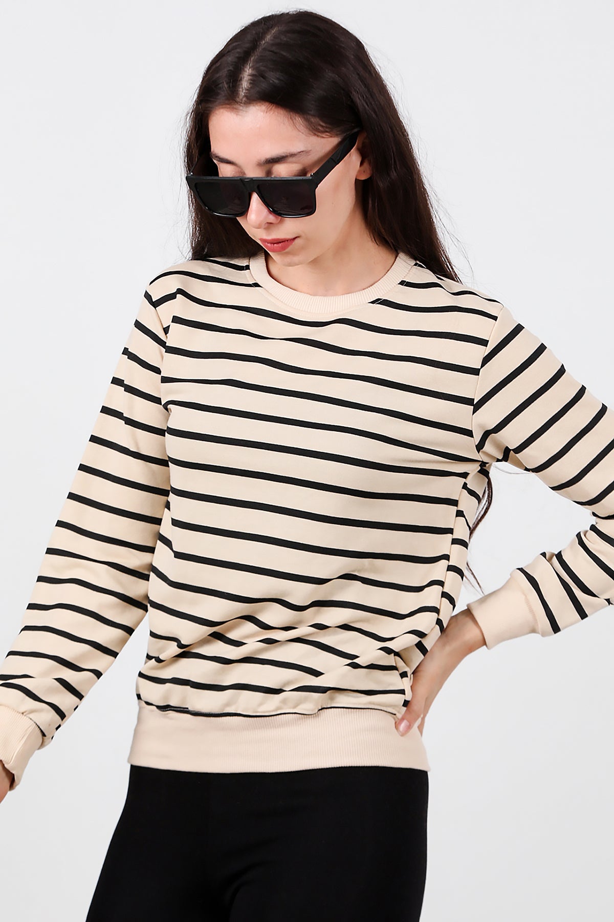 Kadın Çizgili Bisiklet Yaka Sweat Siyah