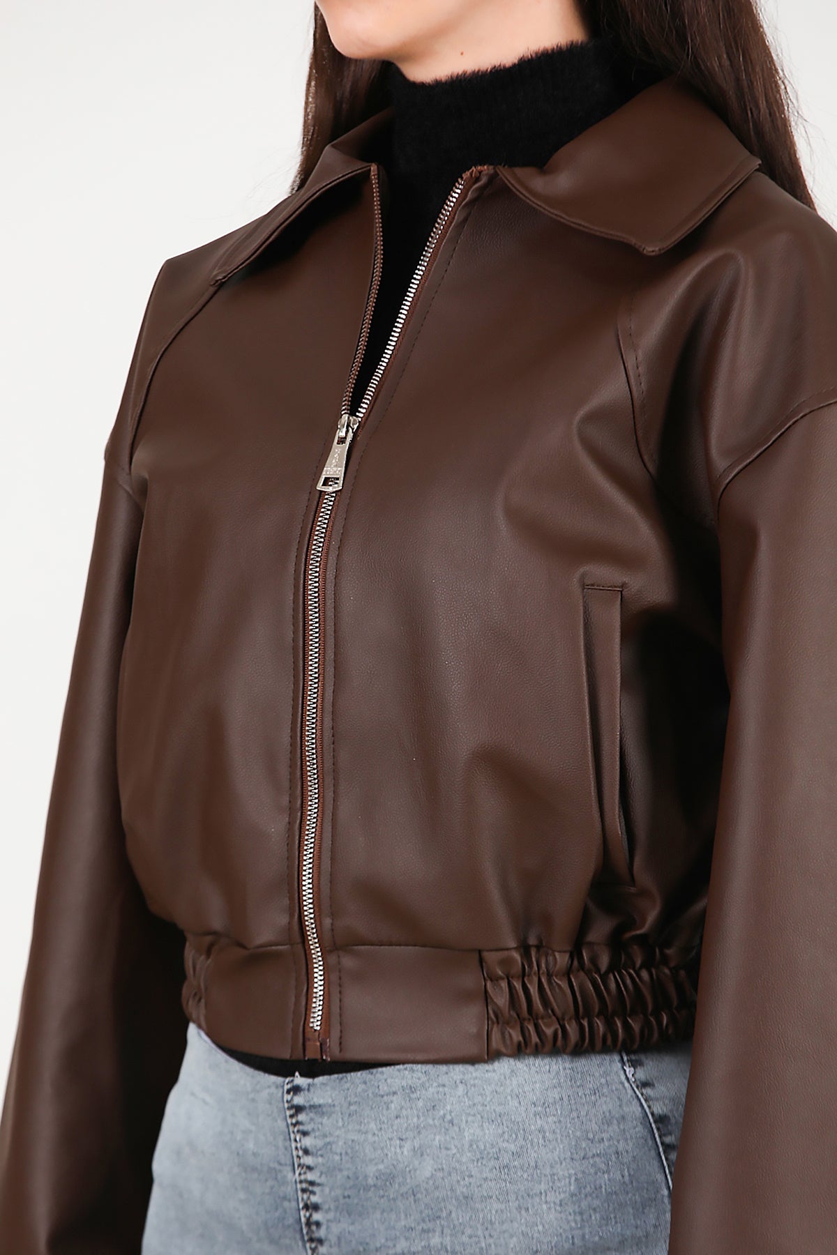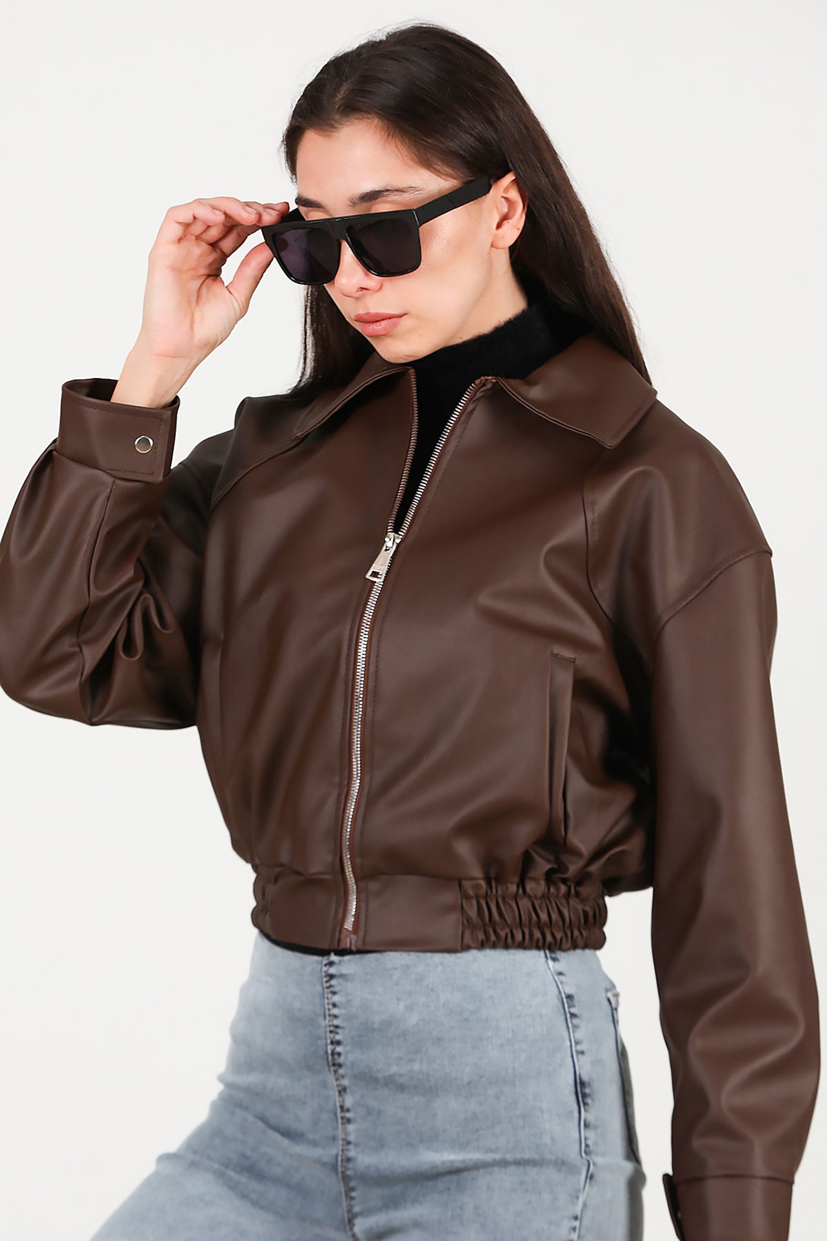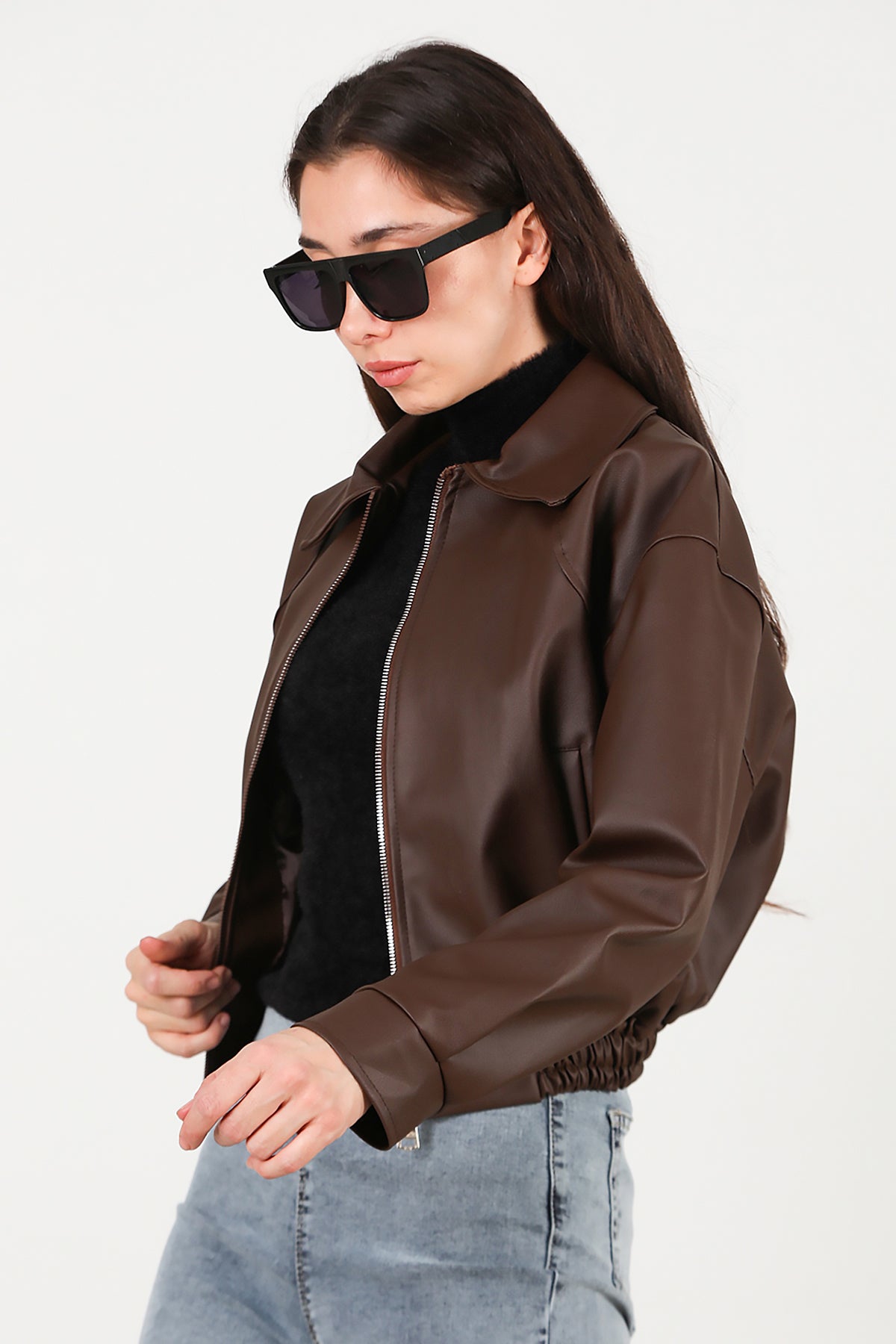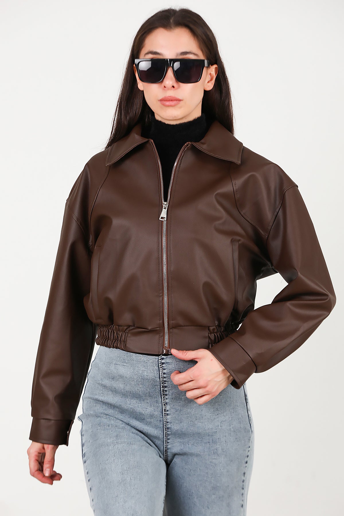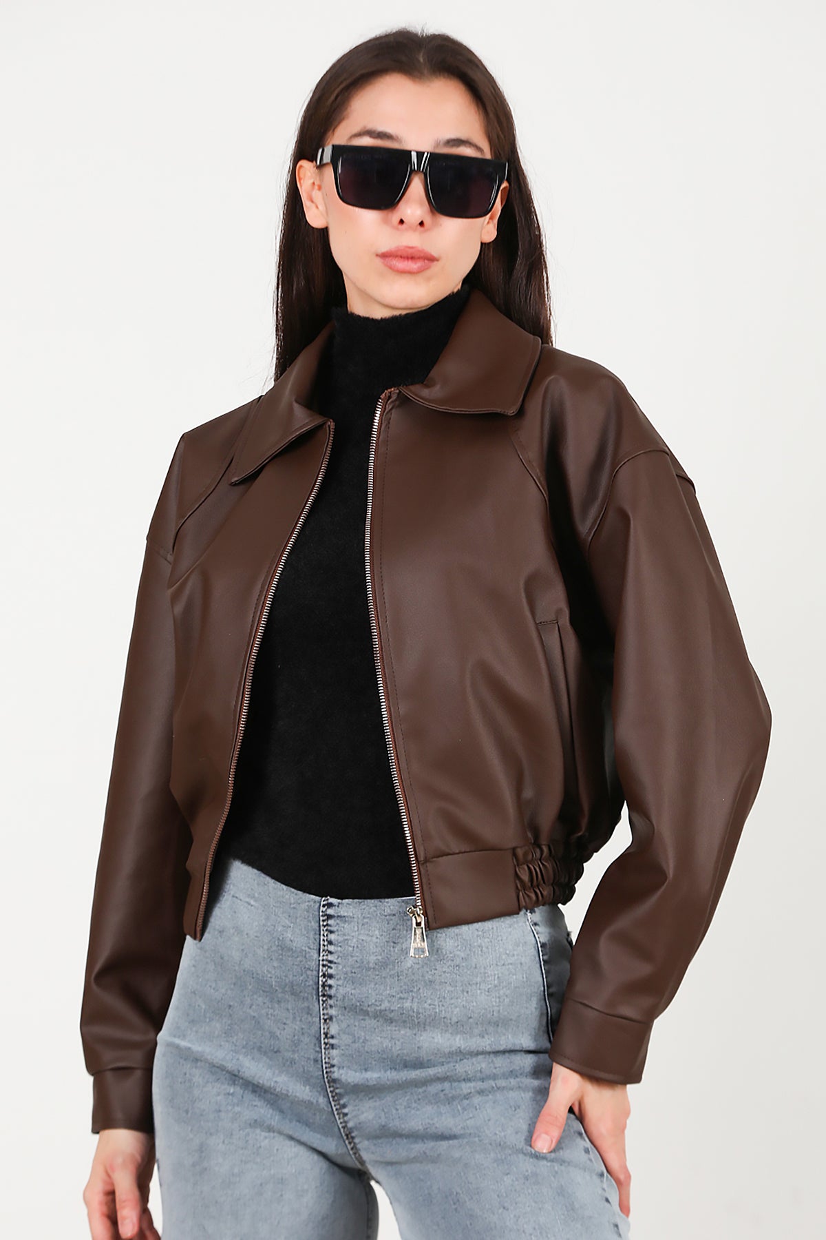 Kadın Bel Lastikli Deri Ceket Kahverengi
