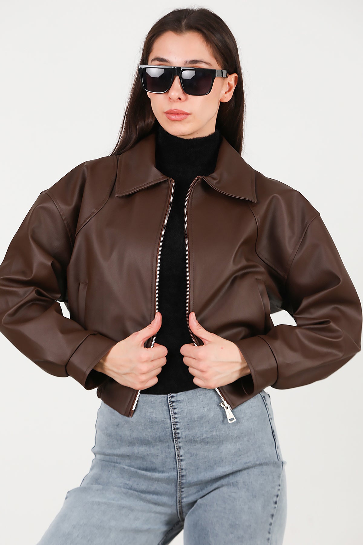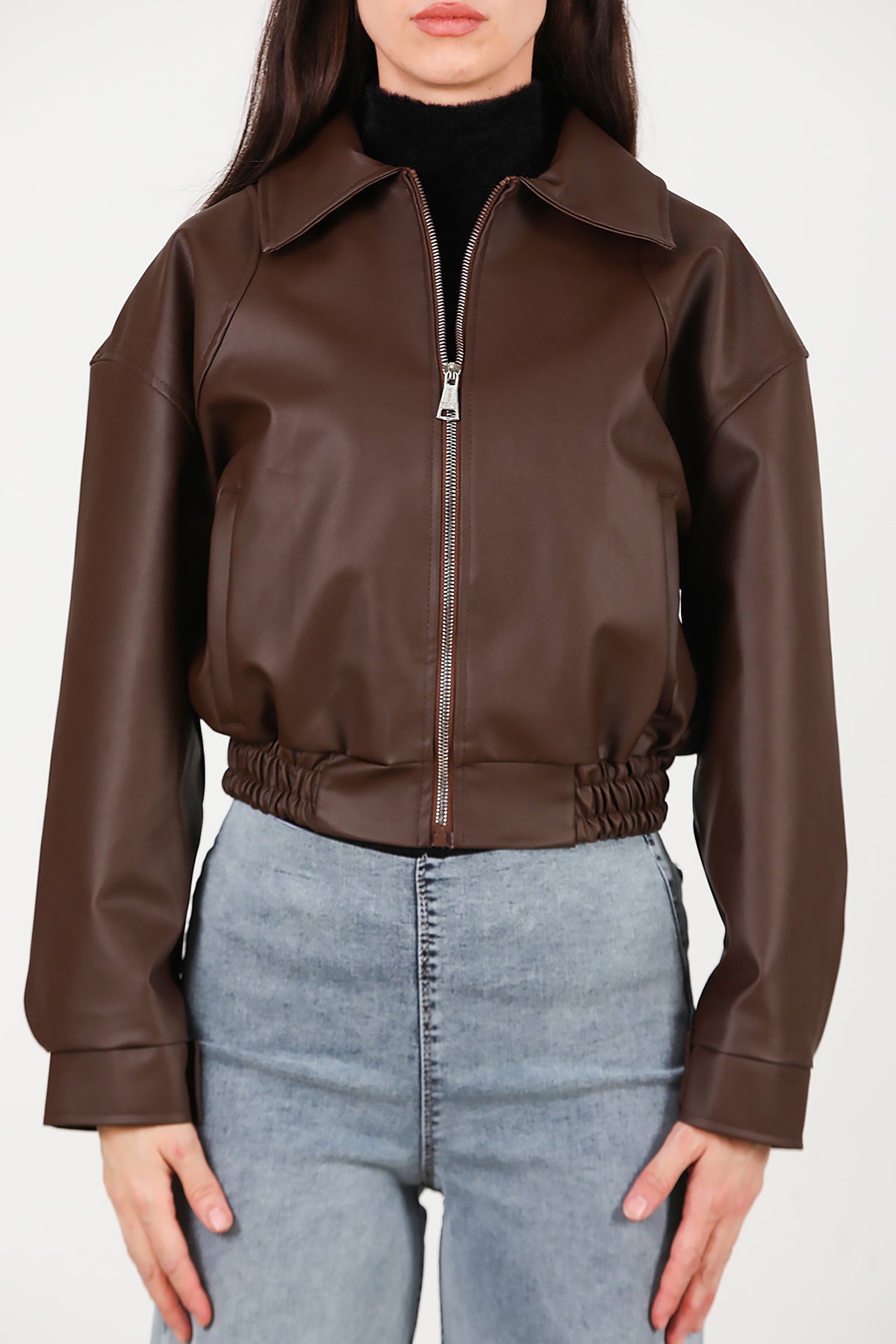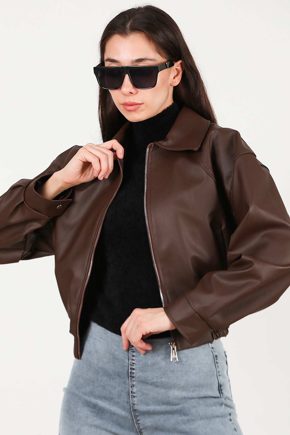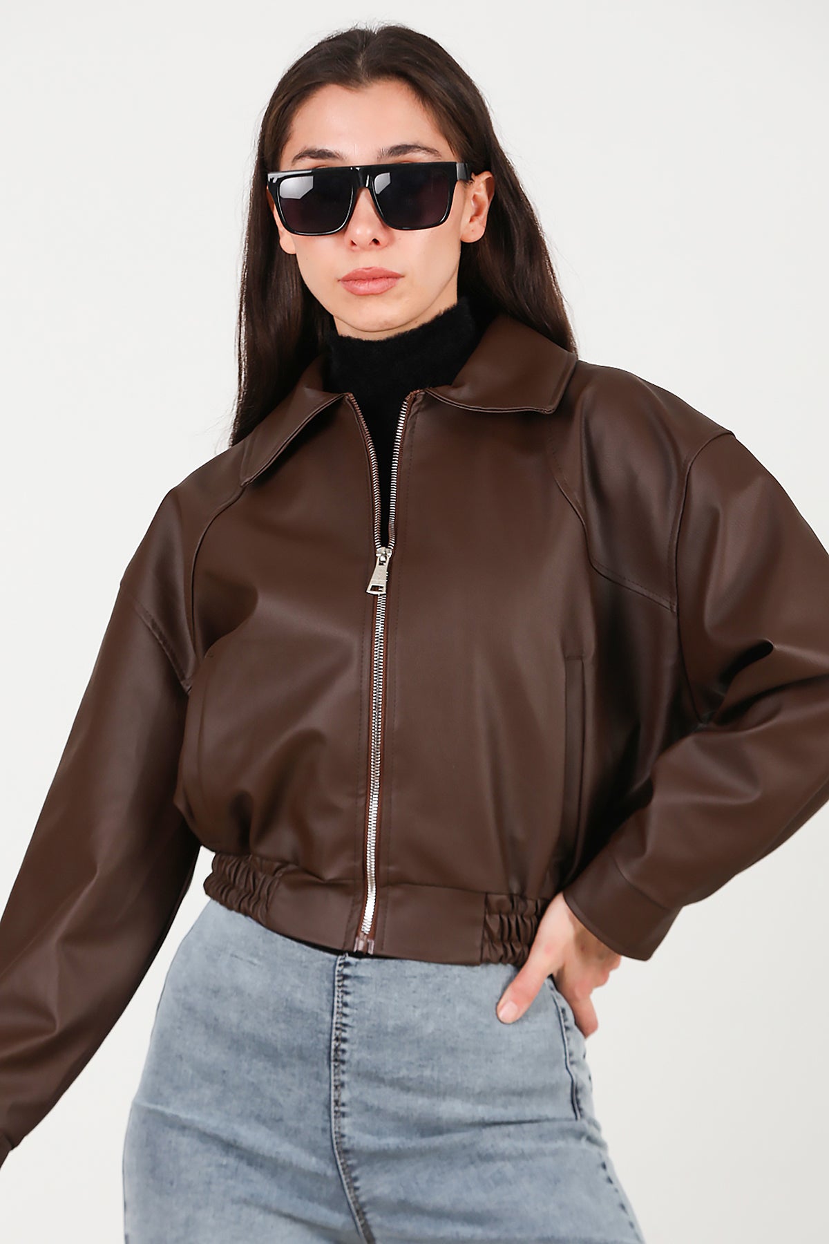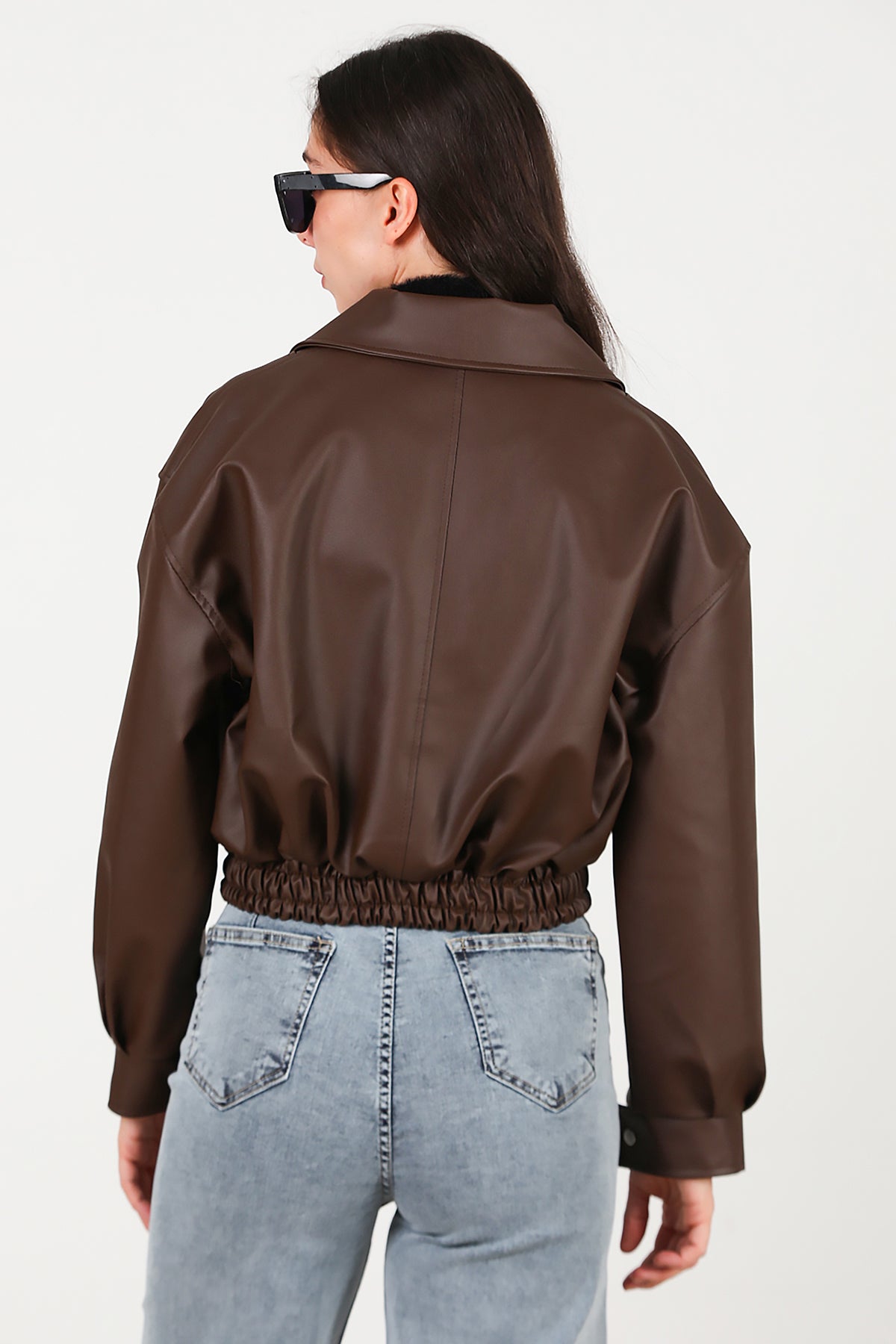 Kadın Bel Lastikli Deri Ceket Kahverengi