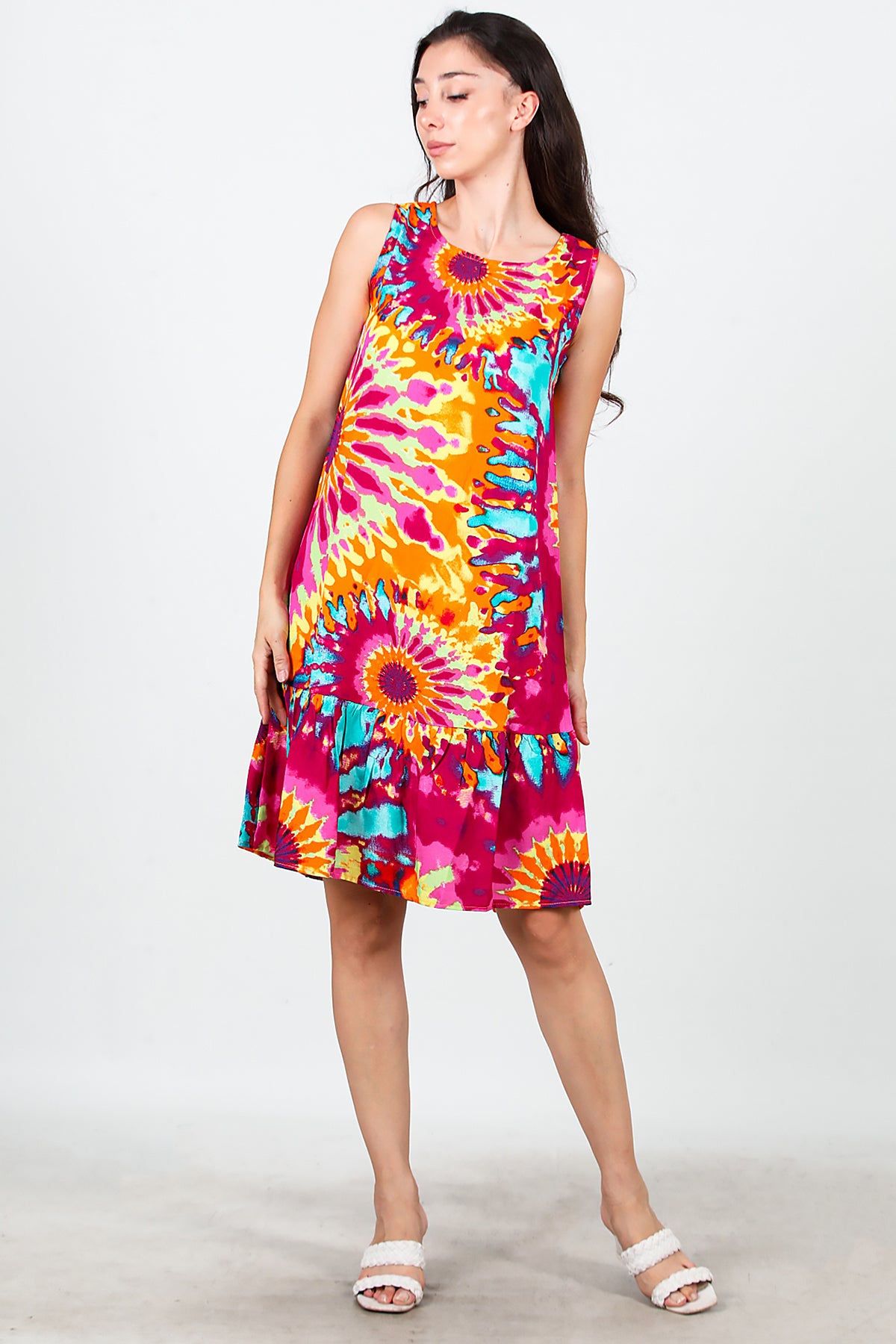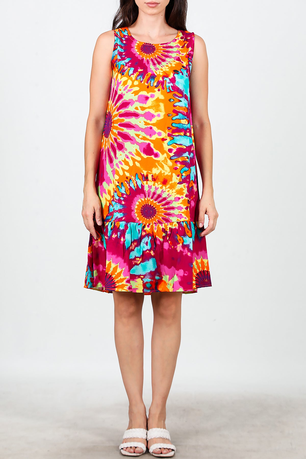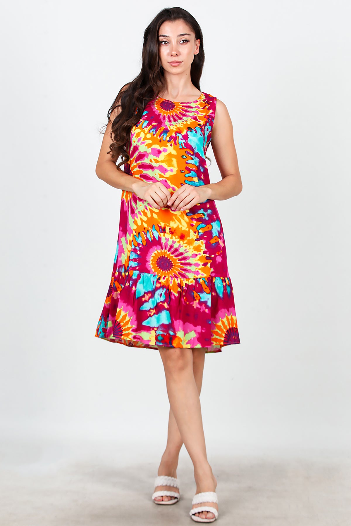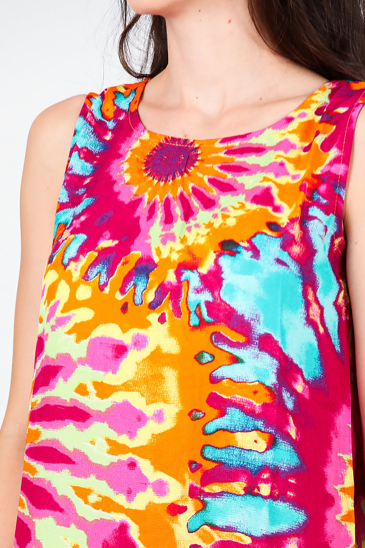 Kadın Desenli Viskon Kolsuz Elbise Fuşya